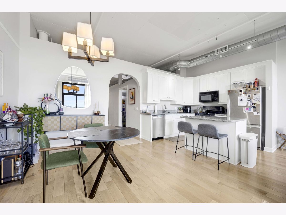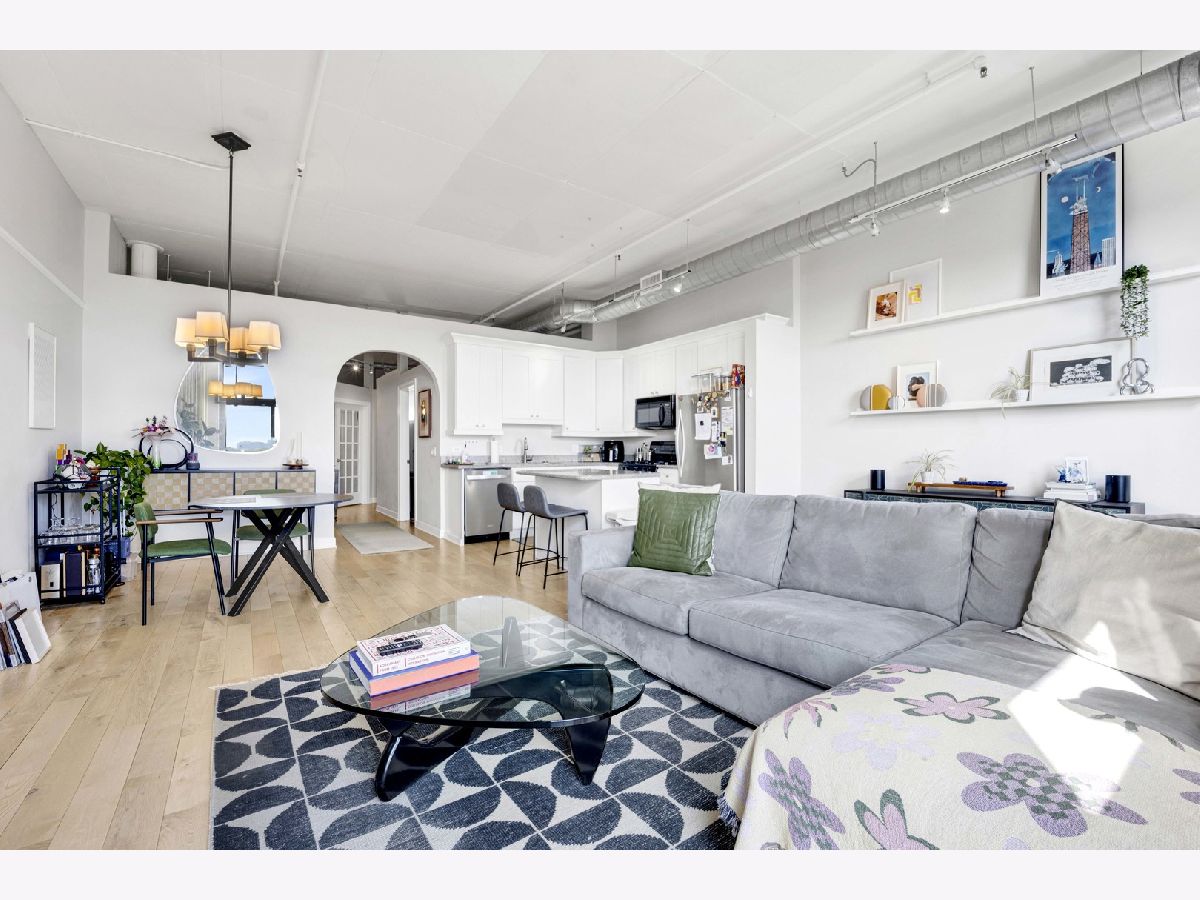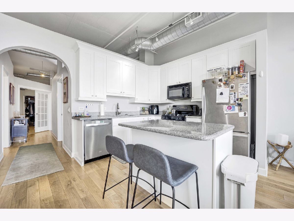 Sophisticated loft style living featuring bright, light filled, open concept living and impressive top floor city and skyline views! The exceptional architectural details that define this spacious home include a formal entryway, high ceilings and windows, a lovely, curved archway, French doors opening to the primary bedroom, two balcony's, hardwood flooring and an on trend stainless kitchen that includes granite counters and convenient island with seating. Bath features custom tiled tub/shower, double vanity and in unit washer/dryer. Excellent near west side location boasts great restaurants, shopping, transportation, entertainment and is close to Fulton River District, the West Loop, Greektown, University Village, Tri-Taylor. Attached garage parking available for an additional $200/month