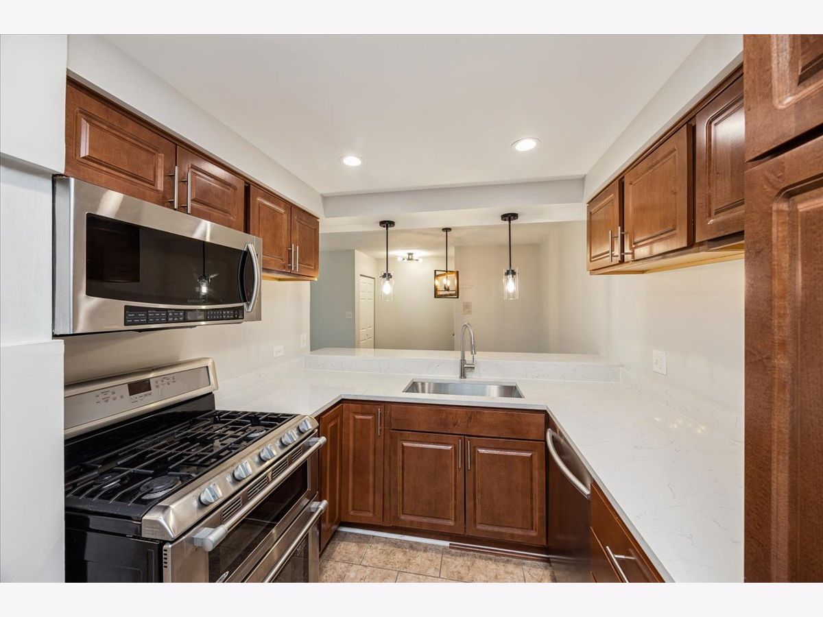 Beautiful East Facing newly remodeled 2 bed, 2 bath second floor condo in highly desirable Regal Chateau Community. Unit features new luxury vinyl plank flooring throughout, custom paint, window treatments, & light fixtures, including hallway sconces & open concept dining. Kitchen features recessed lights, new quartz counters w/breakfast bar w/hanging pendant lights, Farm sink, maple cabinets, SS appliances, Refrigerator with ice/water and dishwasher. Large en-suite bedroom with walk-in closet, linen closet, separate private ceramic bath with glass shower doors, rain showerhead, recessed lights, new vanity with quartz counter and soft close doors/drawers, LED mirror and pocket door. Second bath features LED mirror, recessed lights, new vanity with quartz counter, soft close doors/drawers and rain showerhead. Laundry room with side by side washer/dryer. Balcony off of living room for entertaining. Rent includes private detached garage and 1 addt'l exterior parking space. Residents enjoy access to the pool and clubhouse. Short distance to grocery, restaurants, shopping, public transportation, expressways, golf course and more! 700+ CREDIT, 3 RECENT PAYSTUBS, INCOME 3X RENT, SOLID EMPLOYMENT HISTORY, NO BANKRUPTCIES AND NO CO-SIGNERS, NON-SMOKING UNIT, AVAILABLE OCTOBER 11, POSSIBLY SOONER. SORRY, NO PETS.