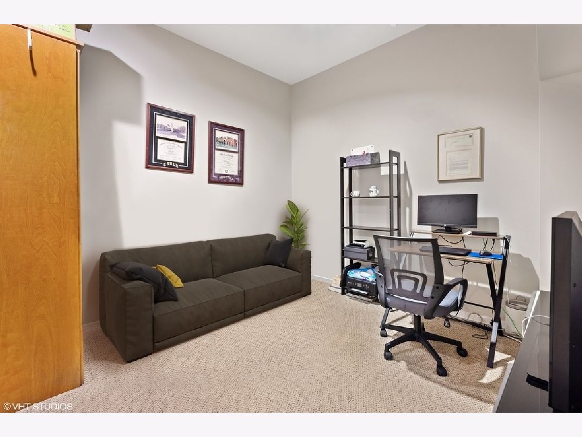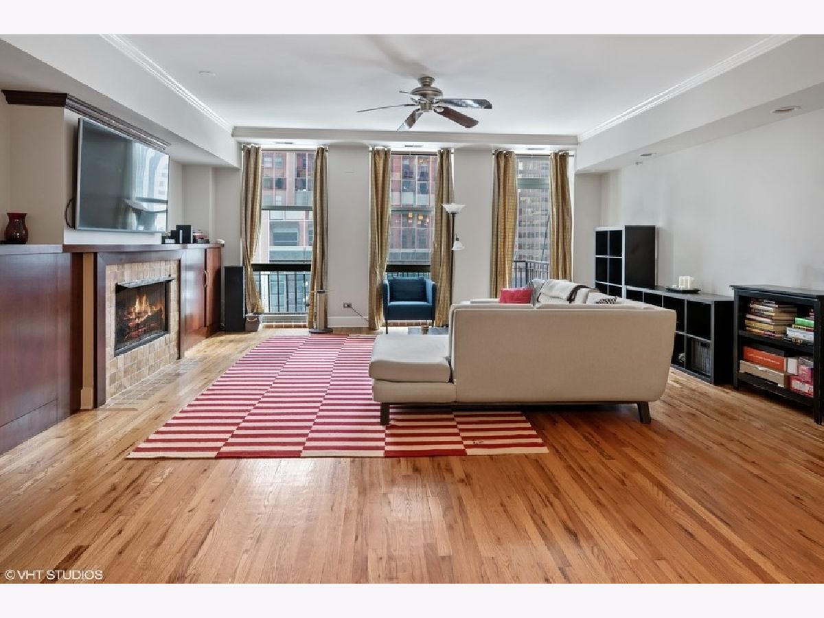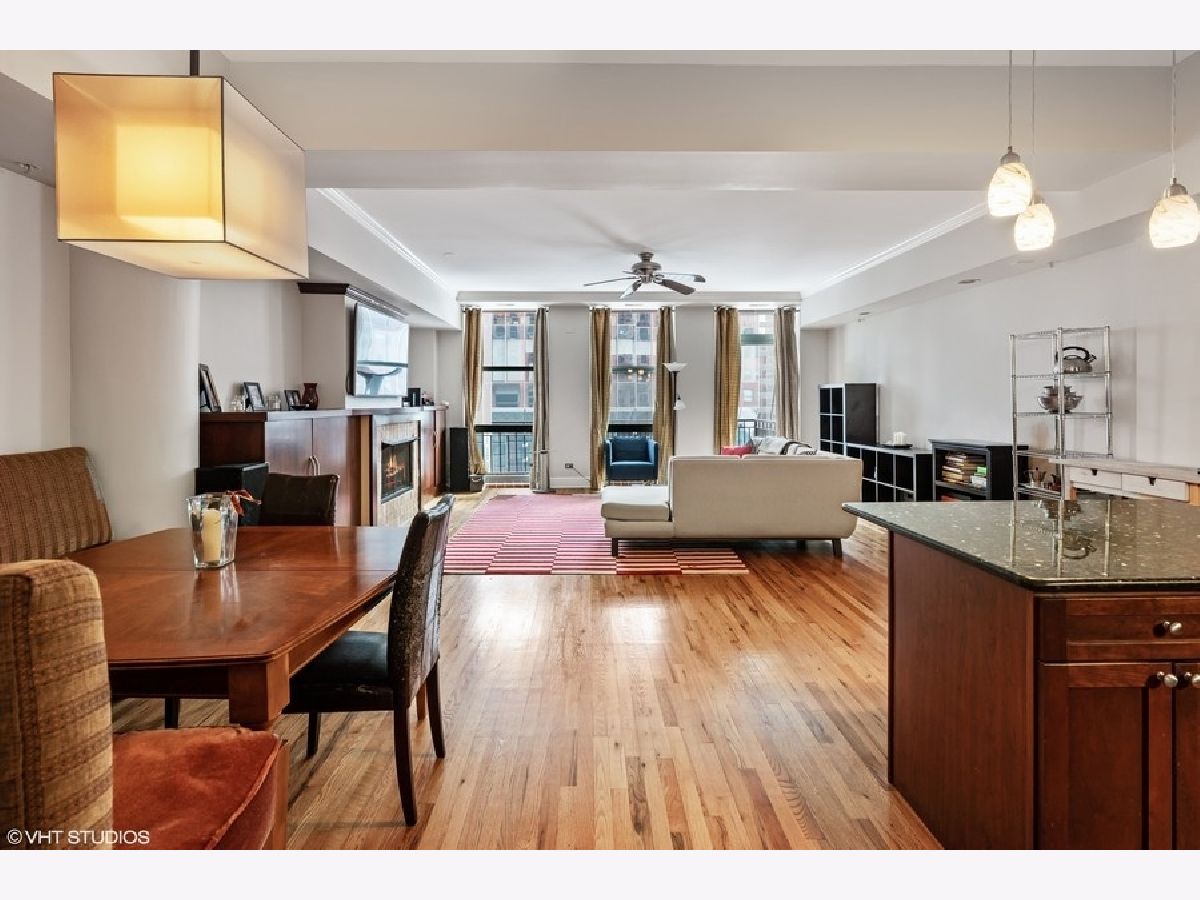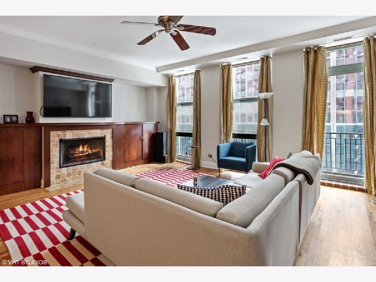 Spacious 1250 sqft east-facing 1-bedroom plus den, ideal for a home office or flexible living space. This thoughtfully designed home features high ceilings, hardwood floors, and an extra-wide living area with a dedicated dining space complete with a built-in banquette. The kitchen offers wood cabinetry, granite countertops, and stainless steel appliances. Enjoy floor-to-ceiling windows that flood the space with natural light, a fireplace with custom built-ins, an in-unit washer and dryer, and a large private balcony. The bath includes a double-bowl granite vanity, separate soaking tub, and walk-in shower. Full-amenity building with 24-hour door staff, fitness center, on-site management, and bike storage. Pet-friendly building. Heated garage parking included. Ideally located near the dining, shopping, and nightlife of West Loop and Fulton Market, with easy access to public transportation.