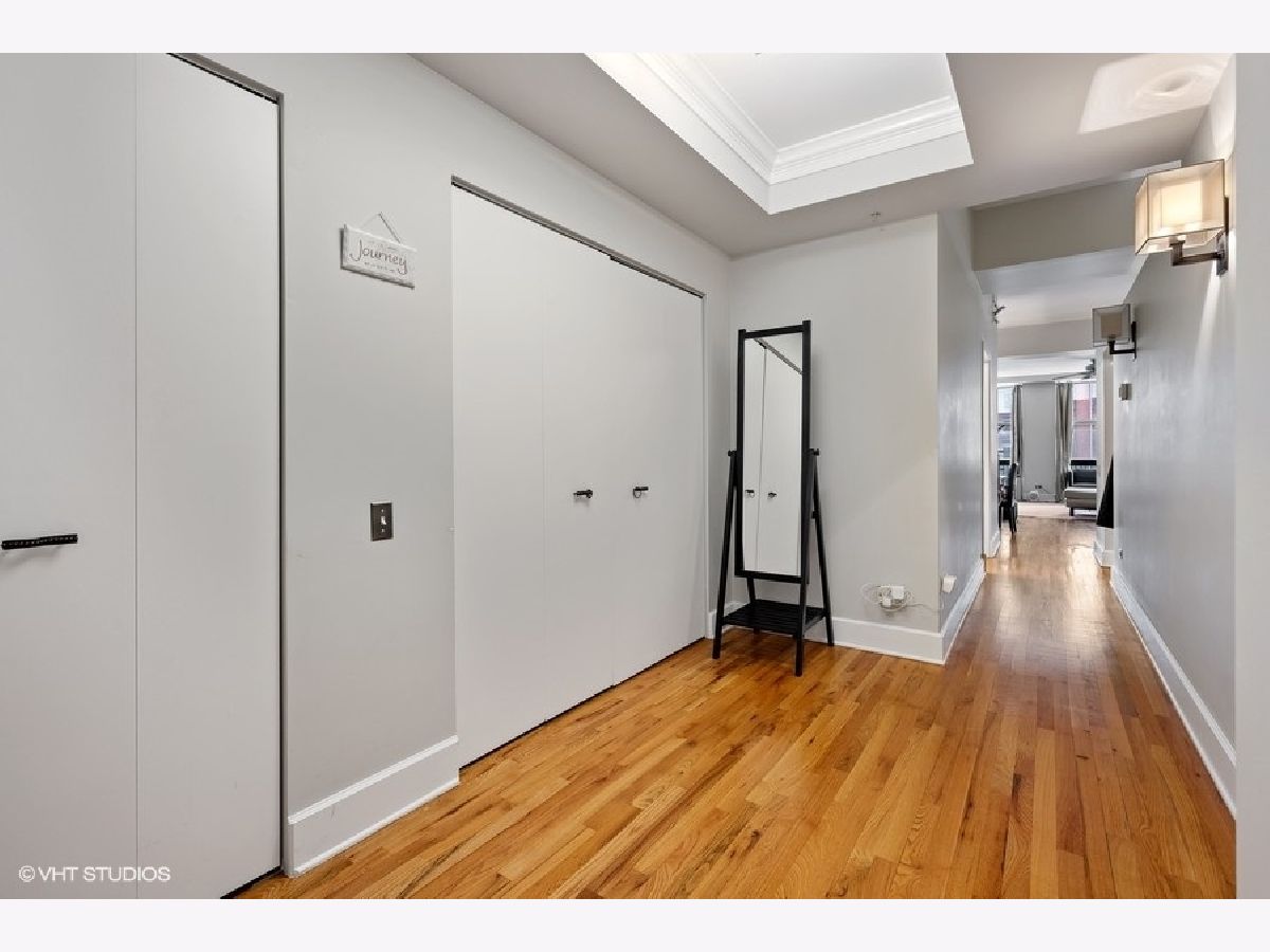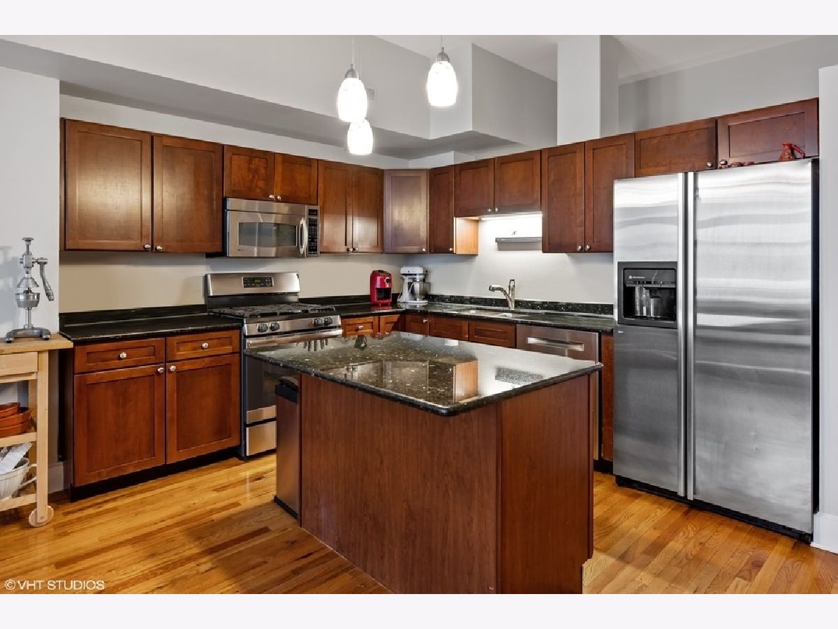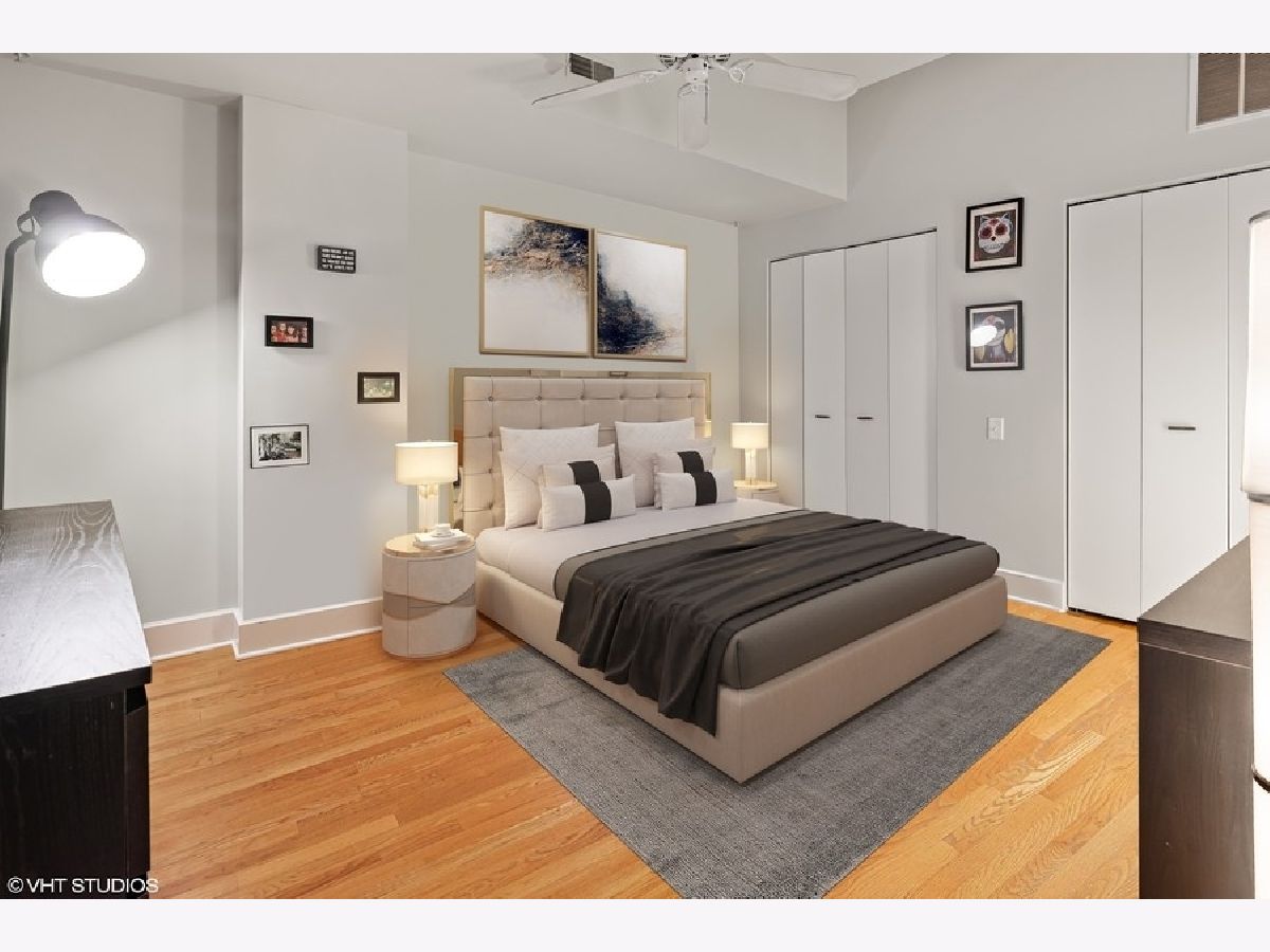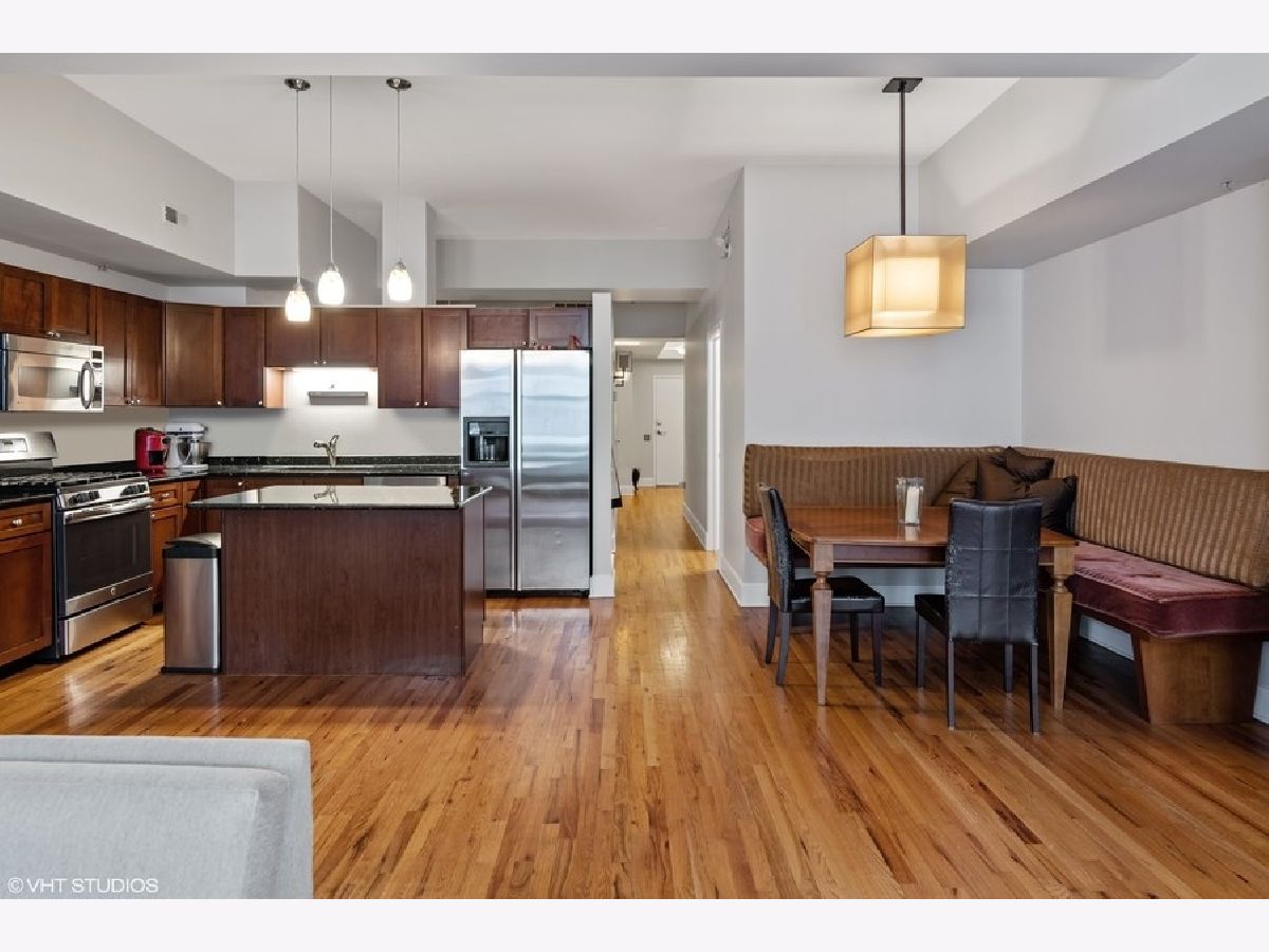 Spacious 1250 sqft east-facing 1-bedroom plus den, ideal for a home office or flexible living space. This thoughtfully designed home features high ceilings, hardwood floors, and an extra-wide living area with a dedicated dining space complete with a built-in banquette. The kitchen offers wood cabinetry, granite countertops, and stainless steel appliances. Enjoy floor-to-ceiling windows that flood the space with natural light, a fireplace with custom built-ins, an in-unit washer and dryer, and a large private balcony. The bath includes a double-bowl granite vanity, separate soaking tub, and walk-in shower. Full-amenity building with 24-hour door staff, fitness center, on-site management, and bike storage. Pet-friendly building. Heated garage parking included. Ideally located near the dining, shopping, and nightlife of West Loop and Fulton Market, with easy access to public transportation.