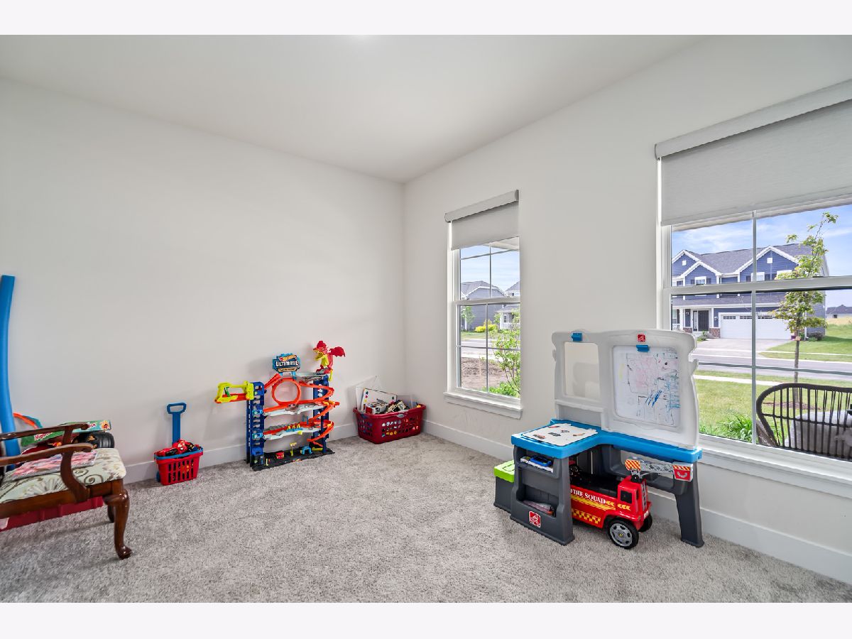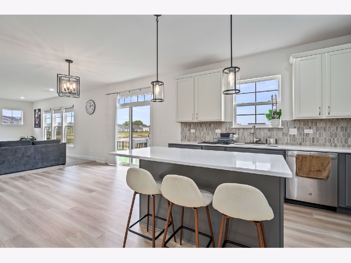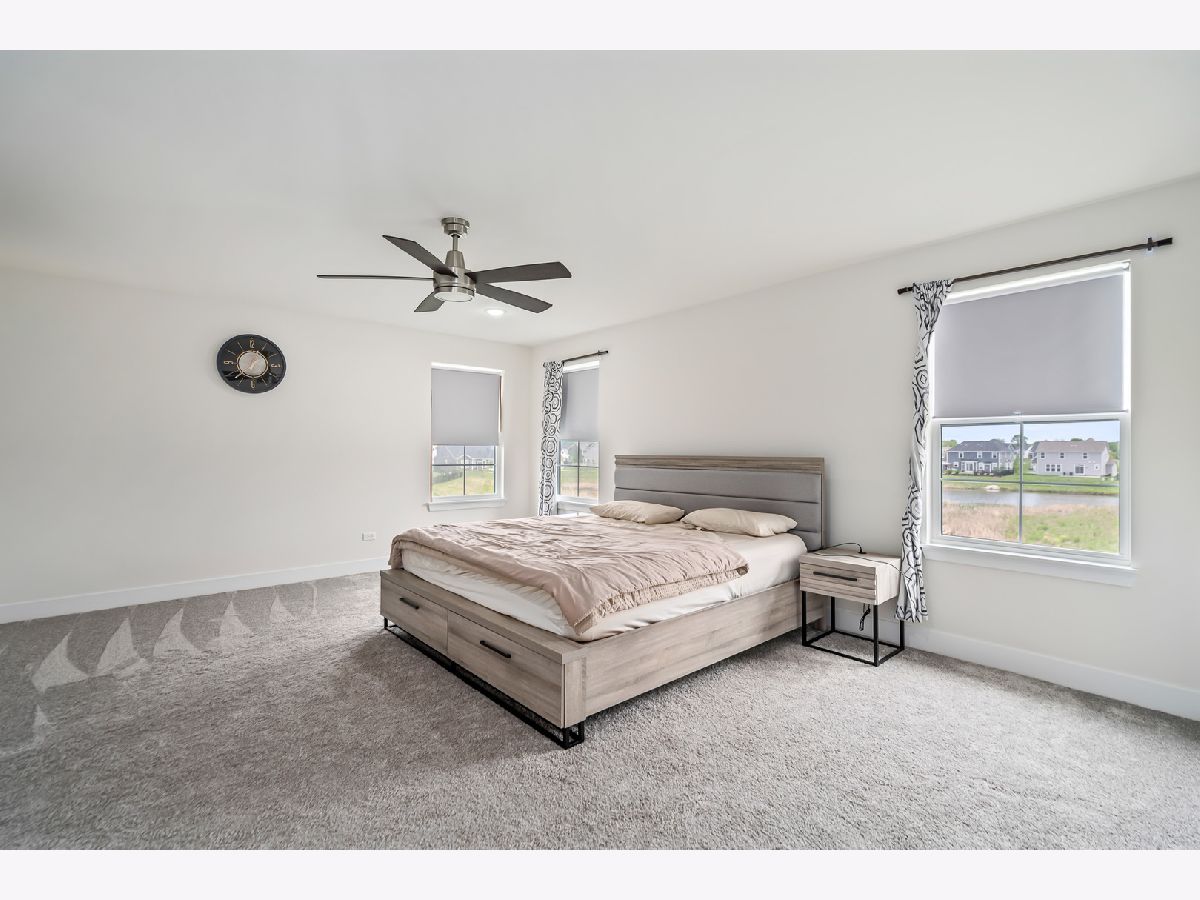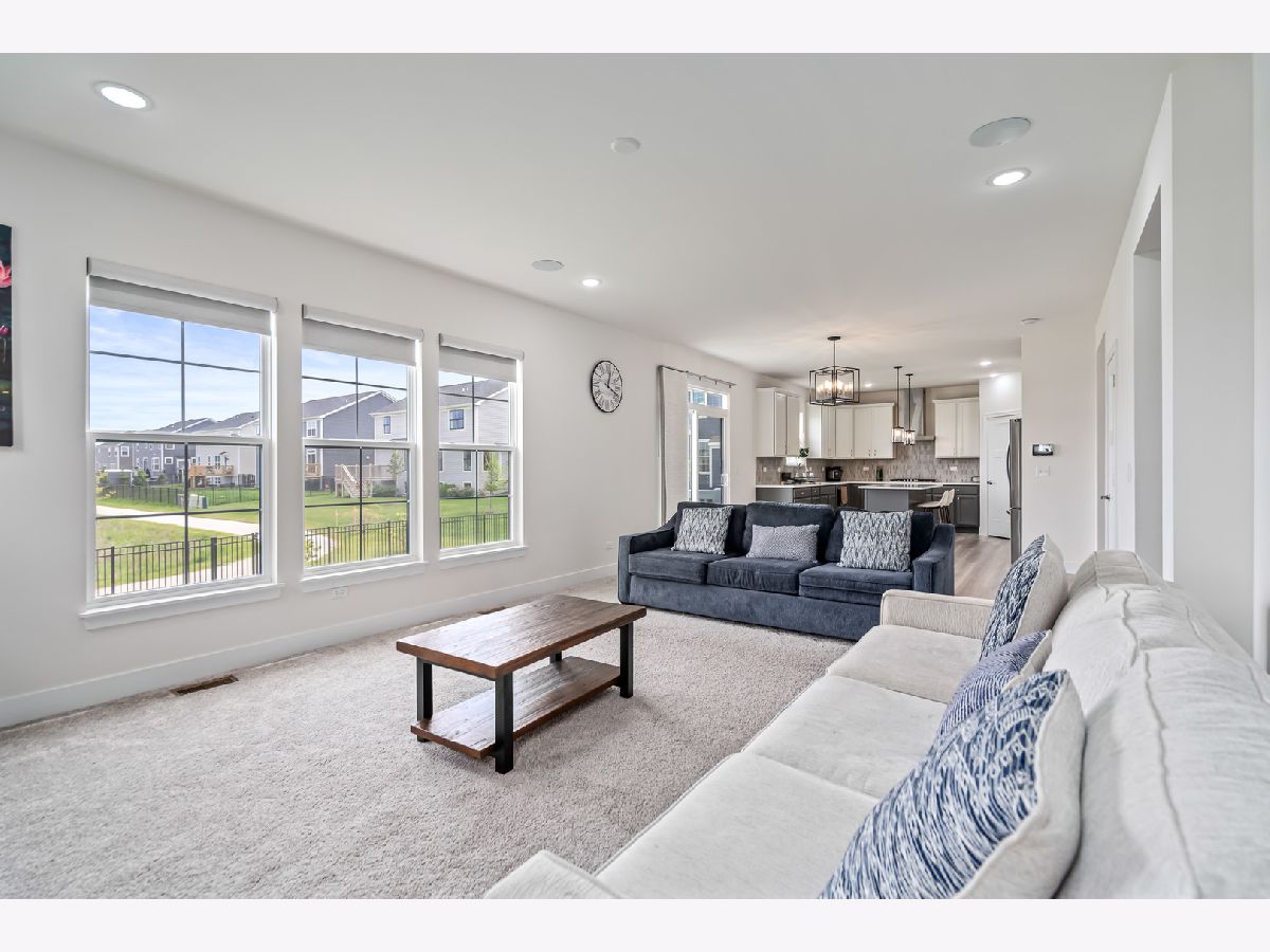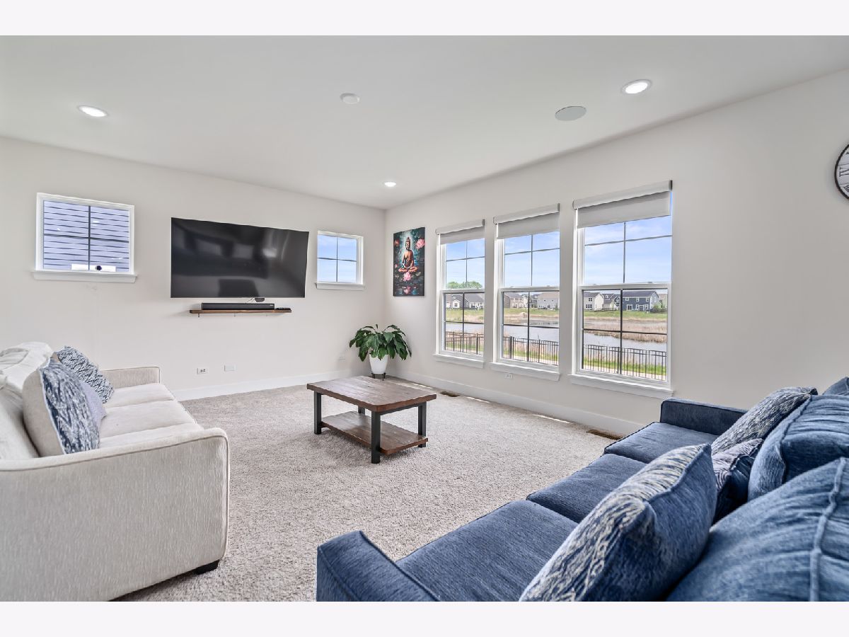 Discover this nearly new farmhouse-style upscale home perfectly situated on a premium lot overlooking a peaceful pond and scenic walking path in the highly sought-after Silo Bend subdivision. From its inviting covered front porch and beautiful stone front detail to its thoughtfully designed interior, this home offers both style and functionality. Step inside to find a light-filled, open-concept layout featuring a gourmet kitchen with 42-inch white cabinets topped with crown molding, sleek white quartz countertops, high-end stainless steel appliances (including a premium refrigerator), a large center island, and a spacious pantry. The adjoining breakfast area opens to the backyard, where you can enjoy picturesque views of the pond and trail. The expansive family room is ideal for gatherings, while the formal dining room with bay window sets the stage for entertaining. A versatile flex room with double door entry offers the perfect space for a home office, playroom, or formal living room. Convenience is key with a first-floor mudroom and laundry room (complete with utility sink) and a spacious 3-car garage. A full basement with rough-in plumbing awaits your finishing touches. Upstairs, you'll find a generous loft area and a luxurious primary suite featuring a double-door entry to the spa-like bath with double raised quartz vanities, an oversized walk-in shower, water closet, and a walk-in closet. The second bedroom also includes its own walk-in closet, and the hall bath offers a double quartz vanity perfect for sharing. This home checks all the boxes-prime location, upscale finishes, and a timeless farmhouse design. Don't miss the chance to make it yours!