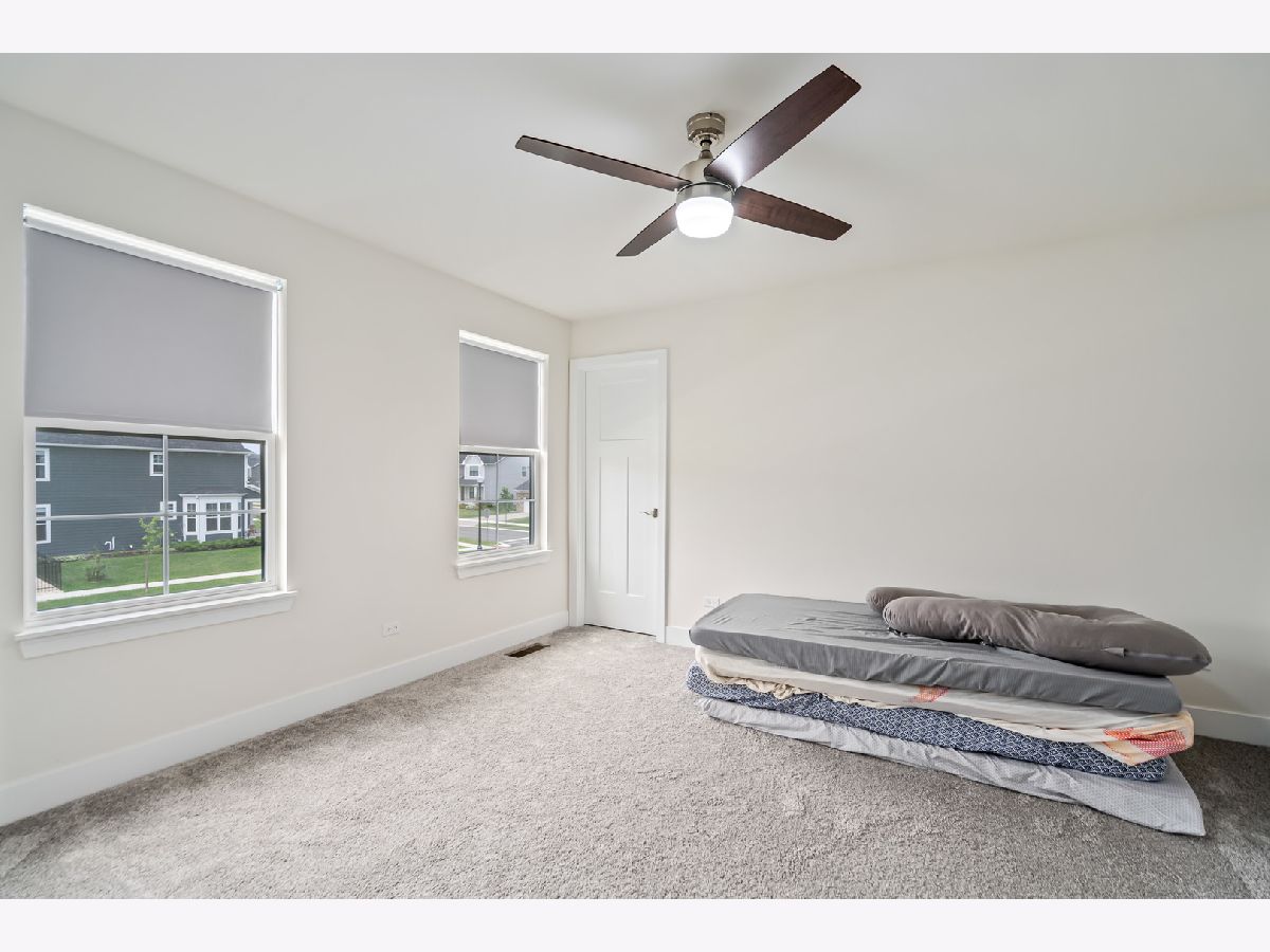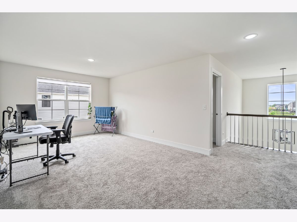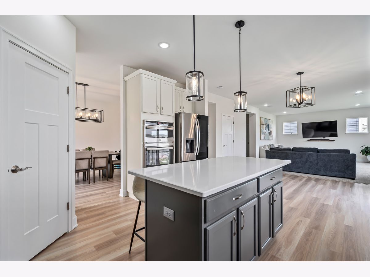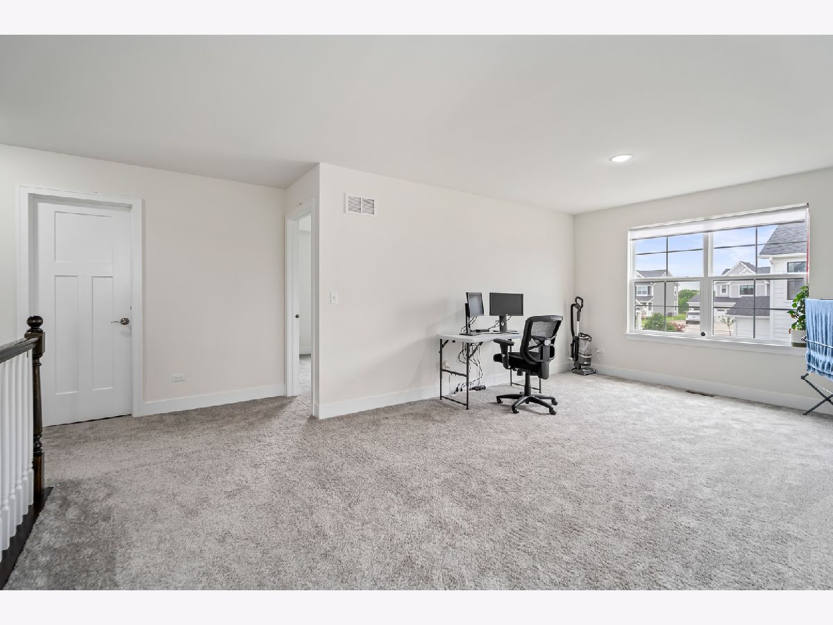 Discover this nearly new farmhouse-style upscale home perfectly situated on a premium lot overlooking a peaceful pond and scenic walking path in the highly sought-after Silo Bend subdivision. From its inviting covered front porch and beautiful stone front detail to its thoughtfully designed interior, this home offers both style and functionality. Step inside to find a light-filled, open-concept layout featuring a gourmet kitchen with 42-inch white cabinets topped with crown molding, sleek white quartz countertops, high-end stainless steel appliances (including a premium refrigerator), a large center island, and a spacious pantry. The adjoining breakfast area opens to the backyard, where you can enjoy picturesque views of the pond and trail. The expansive family room is ideal for gatherings, while the formal dining room with bay window sets the stage for entertaining. A versatile flex room with double door entry offers the perfect space for a home office, playroom, or formal living room. Convenience is key with a first-floor mudroom and laundry room (complete with utility sink) and a spacious 3-car garage. A full basement with rough-in plumbing awaits your finishing touches. Upstairs, you'll find a generous loft area and a luxurious primary suite featuring a double-door entry to the spa-like bath with double raised quartz vanities, an oversized walk-in shower, water closet, and a walk-in closet. The second bedroom also includes its own walk-in closet, and the hall bath offers a double quartz vanity perfect for sharing. This home checks all the boxes-prime location, upscale finishes, and a timeless farmhouse design. Don't miss the chance to make it yours!