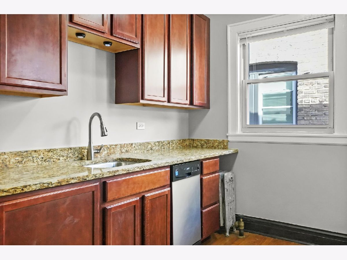 Condo quality spacious 1br with great layout! Unit features: granite counters, 42" cabinets, hardwood floors, dishwasher & microwave, and space for a small dining room table. Responsive maintenance staff, and beautifully landscaped courtyard. Laundry on-site. Free street parking, and municipal parking lot one block south with parking spaces for rent (45 dol./quarter, 150 dol./year). Heat and water included! Don't miss this! Available April 1st!