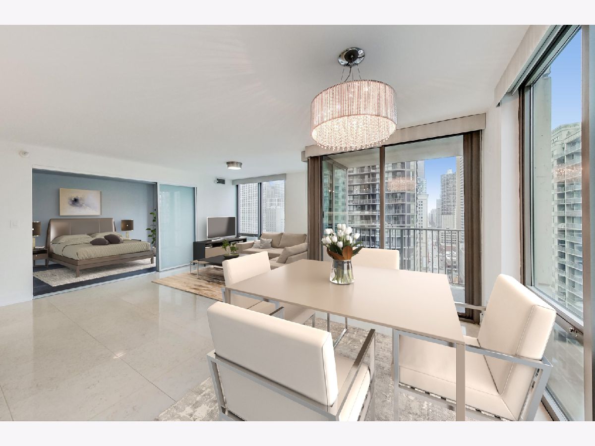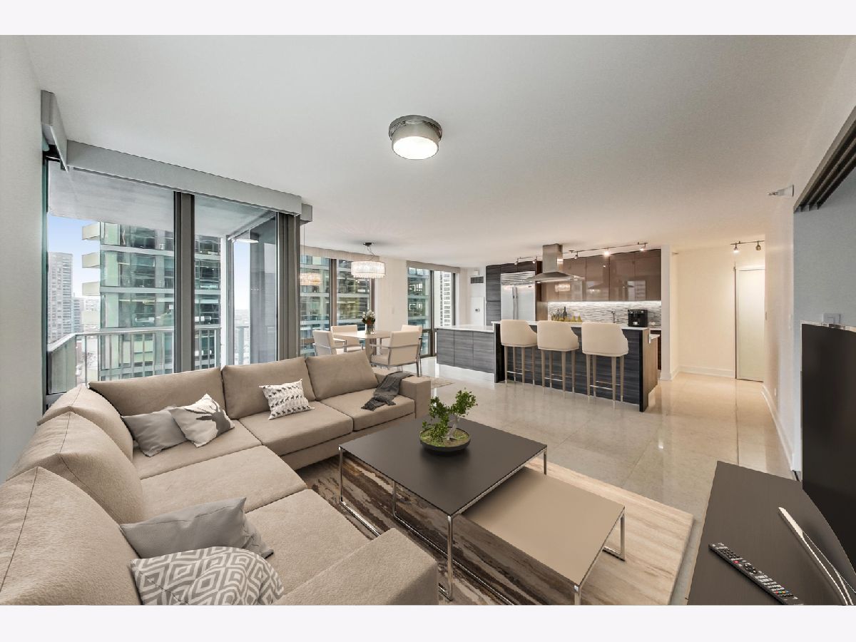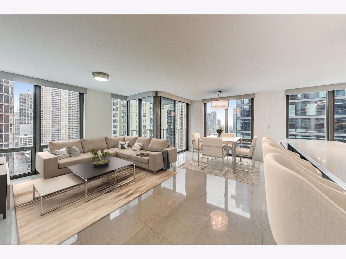 Welcome to this ultra-modern two unit condo conversion that created a spacious, high-floor, SW corner 3 bedroom / 3 full bathroom contemporary home in the heart of River North. With luxury finishes, this high-end condo offers floor to ceiling windows, providing amazing natural light throughout the day. The incredible chef's kitchen boasts striking custom cabinetry, quartz countertops, counter height island for meal prep and bar height island for entertaining. An induction cooktop and Wolf/Sub-Zero appliances complete the gourmet level kitchen. The open living/dining room maintains elegant, low-maintenance marble flooring, a private balcony and easy access to the third bedroom/den. The massive primary suite includes two organized walk-in closets and en-suite bathroom with heated flooring and an incredible 8x8 rainfall shower with body sprays. The second bedroom comes with a huge organized walk-in closet and en-suite bathroom with heated flooring as well. The third bedroom/den can be opened/closed off with opaque glass sliding doors, allowing an option for a bigger space for sophisticated living and entertaining. With abundant closet space, this home also provides convenient in-unit laundry and 2 additional storage cages. Full-amenity building with 24-hour door person, newer fitness room, party room and common rooftop deck with knockout views. Seconds to some of Chicago's best dining, shopping and entertainment with Lake Michigan a short stroll away. Premium attached garage parking space (fits 2 cars) is an additional $250/month. The best of modern city living in a tremendous location.