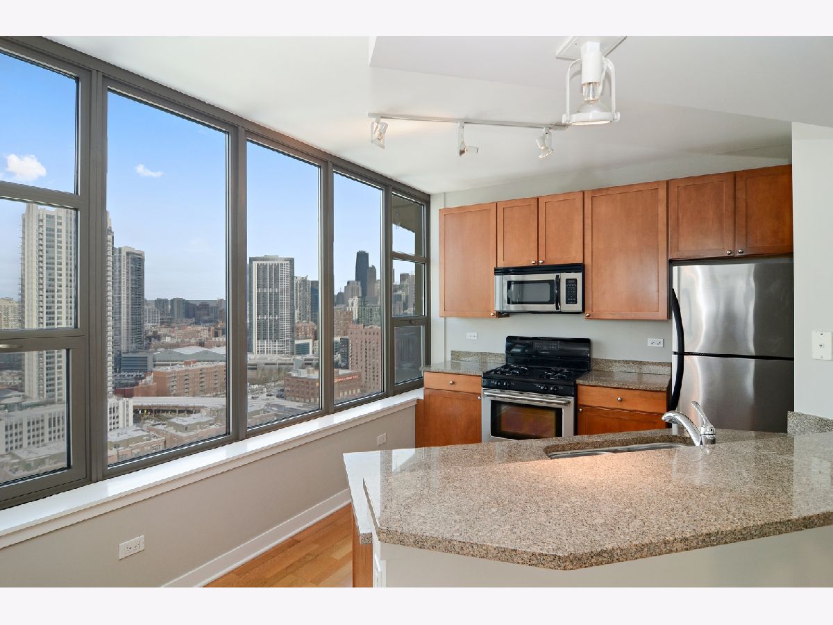Rarely available one bed/one bath corner unit with spanning north, east and west skyline views in desired Fulton River District/West Loop. This spacious unit has wrap around windows allowing for tons of natural light and amazing views throughout the unit. Updated kitchen has 42" cabinets, granite countertops and stainless steel appliances. Other unit features include, hardwood floors throughout living area, in-unit washer/dryer, central heat/air and large balcony with gorgeous city and Chicago River views from the north and the west. Primary bedroom has large walk-in closet, newer carpet and leads into an upgraded marble bath with double vanity. Rent includes heat, air gas & garage parking. Tenant only responsible for internet & electric. Full amenity building includes on site management, doorstaff, package receiving, exercise room, bike room, sundeck, Starbucks, additional storage and cleaners. Walk to everything location in the heart of the Fulton Market steps from the West Loop & River North. Close to the loop, public transportation/Metra stations/expressways, all the amazing Randolph St. & Fulton St. restaurants, expanded Chicago Riverwalk which leads east to Lake Michigan, several grocery stores, retail shopping and green space parks.