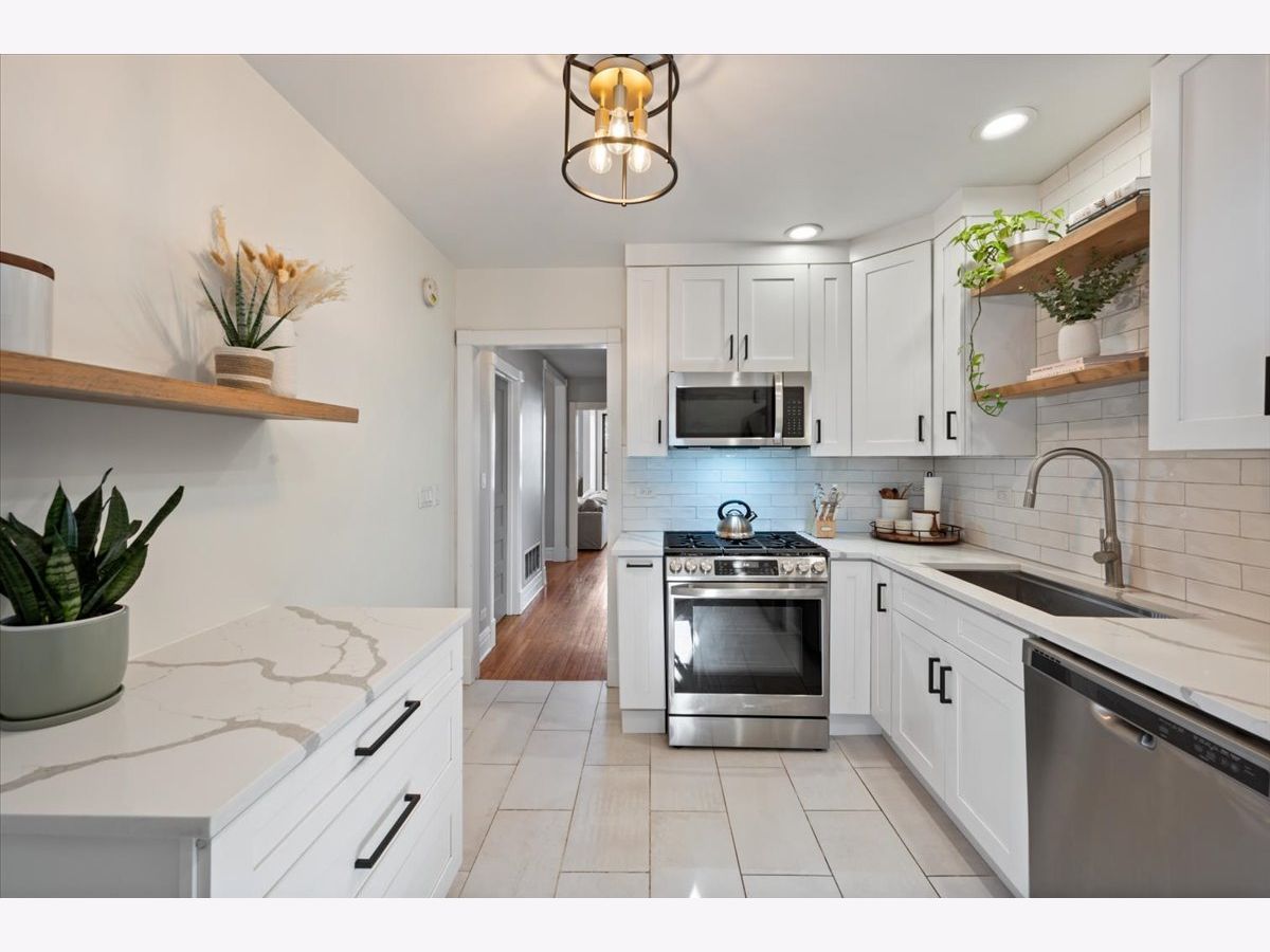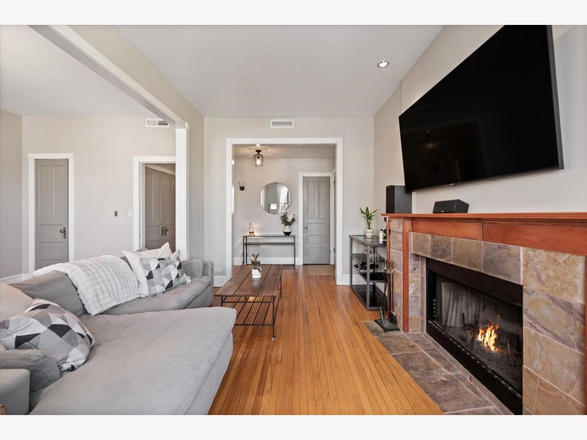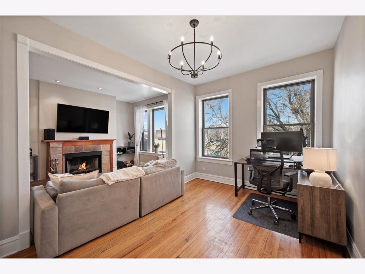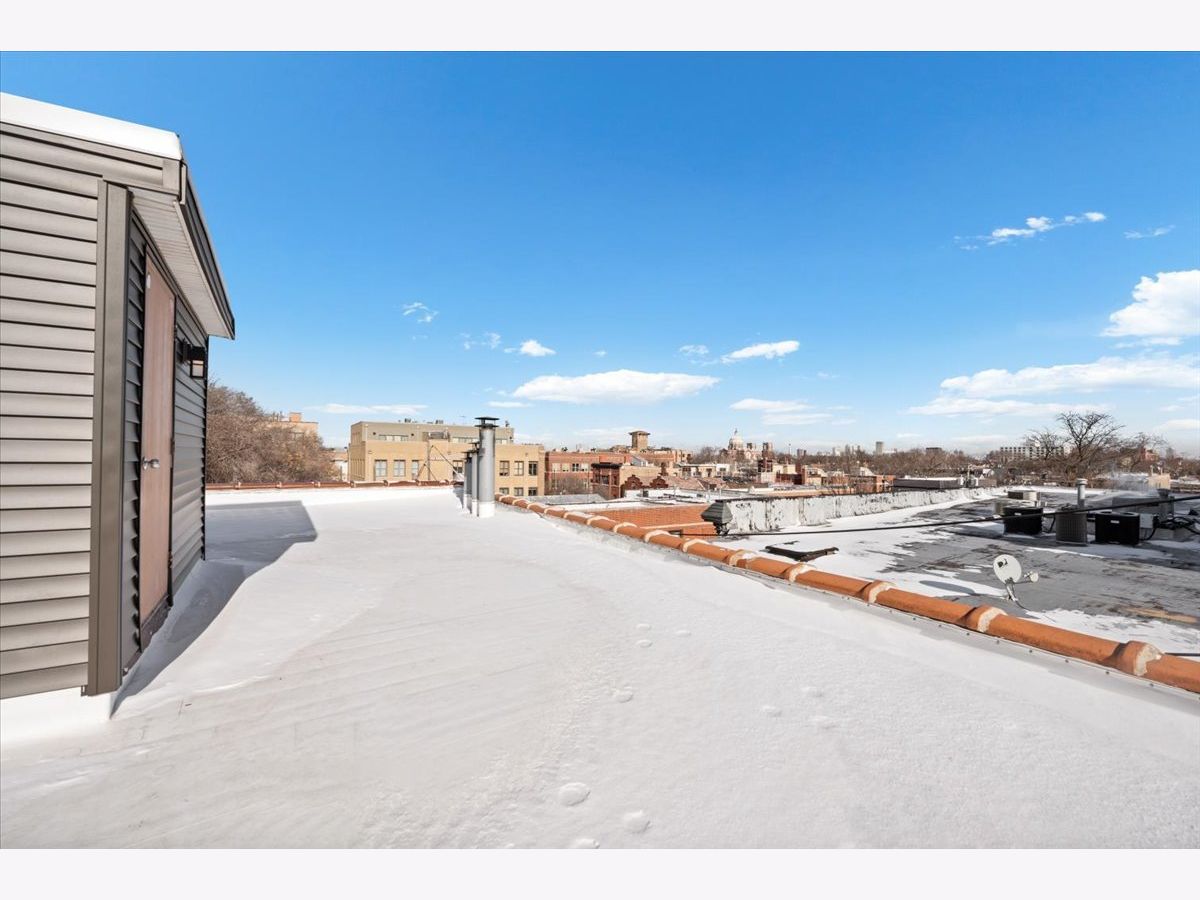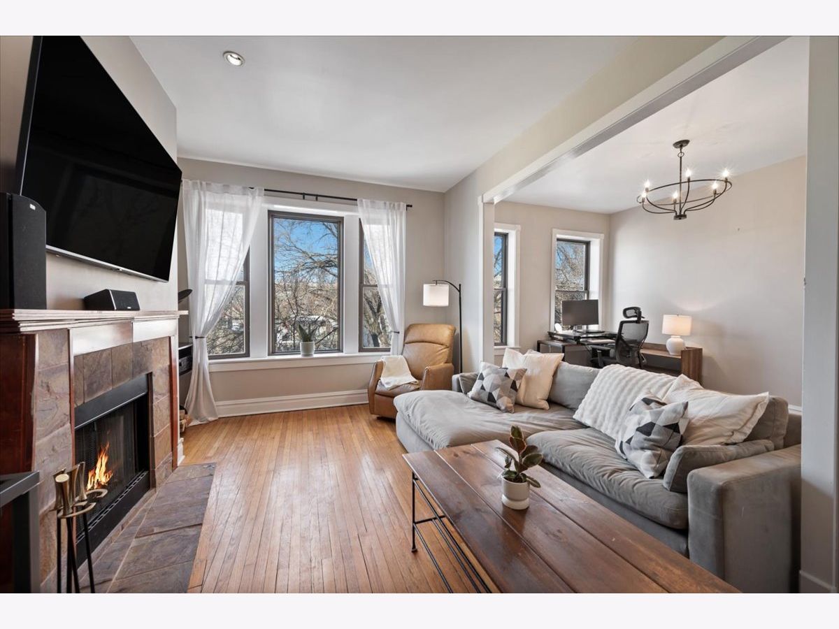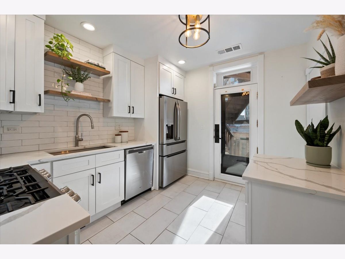 Amazing penthouse available in the heart of Bucktown! This sun-drenched home features soaring high ceilings, gorgeous vintage details, original woodwork, stunning hardwood floors throughout, and a wood-burning fireplace anchoring the living room. The recently redone kitchen shines with white cabinetry, quartz countertops, stainless steel appliances, and an island-perfect for everyday living and entertaining. The kitchen opens through a large glass door with screen to a deck, ideal for grilling and outdoor dining. The expansive living room flows seamlessly into a formal dining room, creating a wonderful sense of space-perfect for hosting, dining, or a home office setup. The crisp bathroom includes a skylight, and the home also offers in-unit washer/dryer, central air, and abundant storage throughout. Custom-painted interiors and tons of windows bring in incredible natural light on this charming, quiet street just off Damen, North, and Milwaukee. Coming this spring is an exciting new common roof deck offering stunning skyline views-perfect for entertaining or relaxing above it all. An exceptional opportunity to live in a character-filled penthouse in one of Chicago's most vibrant neighborhoods. Steps from top restaurants, coffee shops, boutique shopping, the 606, dog parks, Big Star, Wicker Park, and the Blue Line.
