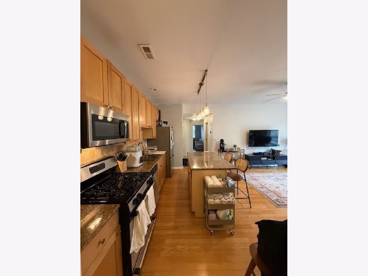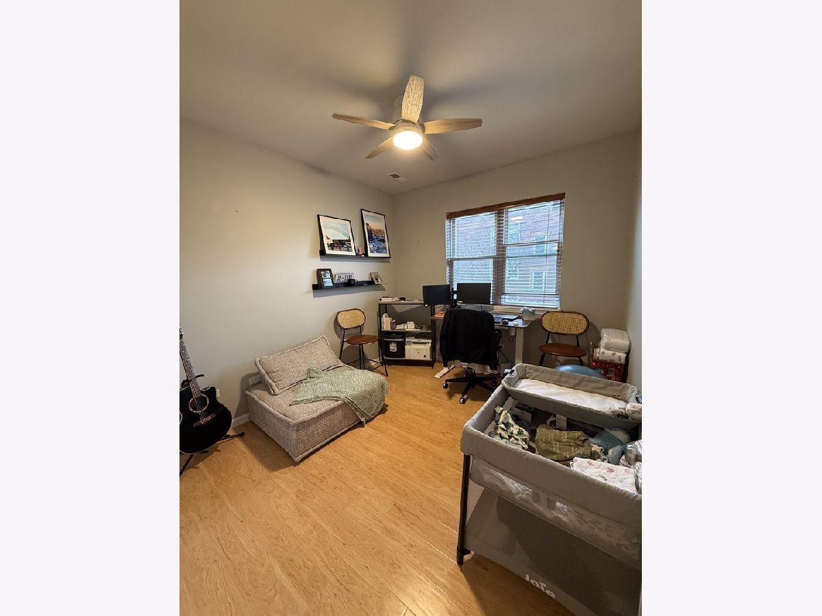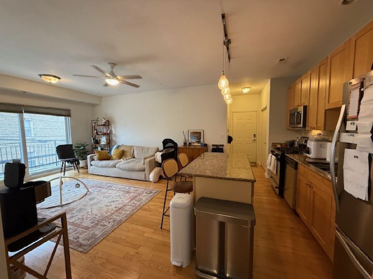 Beautiful and bright Logan Square 2 Bed 1 Bath corner unit available June 1st move in. Nice open layout with hardwood floors throughout. Elegant kitchen with quartz countertops and stainless appliances. New modern lighting and google fiber for high speed internet. Well-sized private balcony off living room plus enormous roof top deck with stunning skyline views. Updated modern bathroom and washer / dryer. Elevator in building for convenience! Prime gated outdoor assigned parking is included. Quick walk to California and Western CTA blue line, and bus stops. Enjoy nearby top-notch Logan Square restaurants, shops and nightlife! Building is on quiet, tree lined street. Nothing to do but move right in!