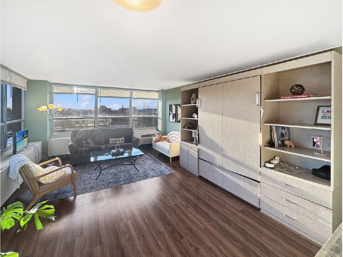 Check out the 3D virtual tour! This southwest corner studio at 3550 N Lake Shore Drive has amazing views from its 11 oversized windows. This condo has a great floor plan with a large living area and a built-in Murphy bed. The unit has excellent closet space, an oversized walk-in closet, and two large hallway closets. The kitchen is extra clean and has plenty of cabinet space. The unobstructed views of the city, lake, Wrigley Field, sunrises, and sunsets will never get old. The building has 24-hour door staff, two rooftop decks, two laundry rooms, a new workout room, and valet parking available for $160 per month. Easy access to the lake path and express buses downtown right out front.