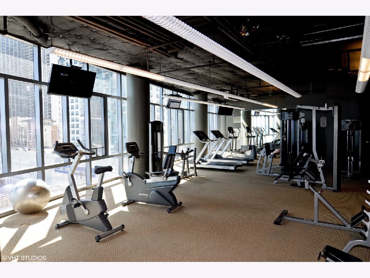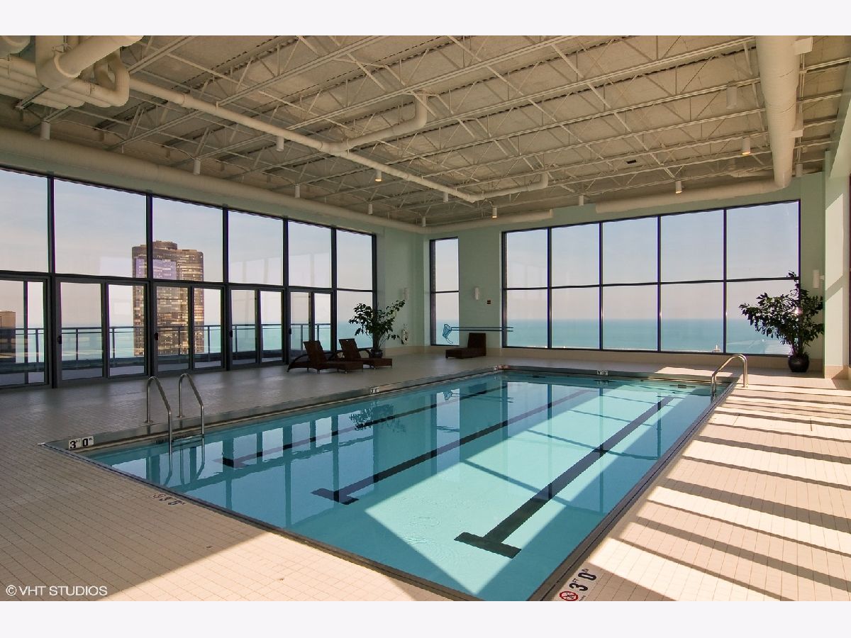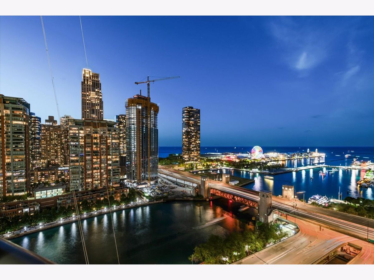 Rare split bedroom and bathroom floor plan with additional power room for guests. Best directional positioning at the prized Chandler facing north with east exposure to Lake Michigan, west down the Chicago River, and Chicago's skyline. Enjoy the city lights at night, unobstructed and permanent views. Interior features include formal entry, ample closet storage, open kitchen concept, all 42" wood cabinetry, peninsula with room for seating, stainless steel appliances, gas cooking, straight edge stone counters. Full bathrooms dressed in marble. Walk in closet. Garage parking and storage locker included in rent. Tenant only pays for electricity. Freshly painted, professionally deep cleaned including bedroom carpeting. In-unit full size washer/dryer. This is a full amenity building including onsite property manager, engineer, maintenance and 24 hour doorstaff. Penthouse level lap pool, sun terraces, and outdoor whirlpool, gym, community room for private events, contemporary wing outfitted with amazing array of seating, gaming, screening room, work spaces. AVAILABLE IMMEDIATELY.