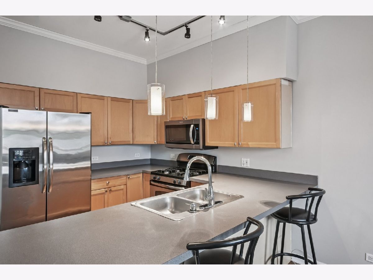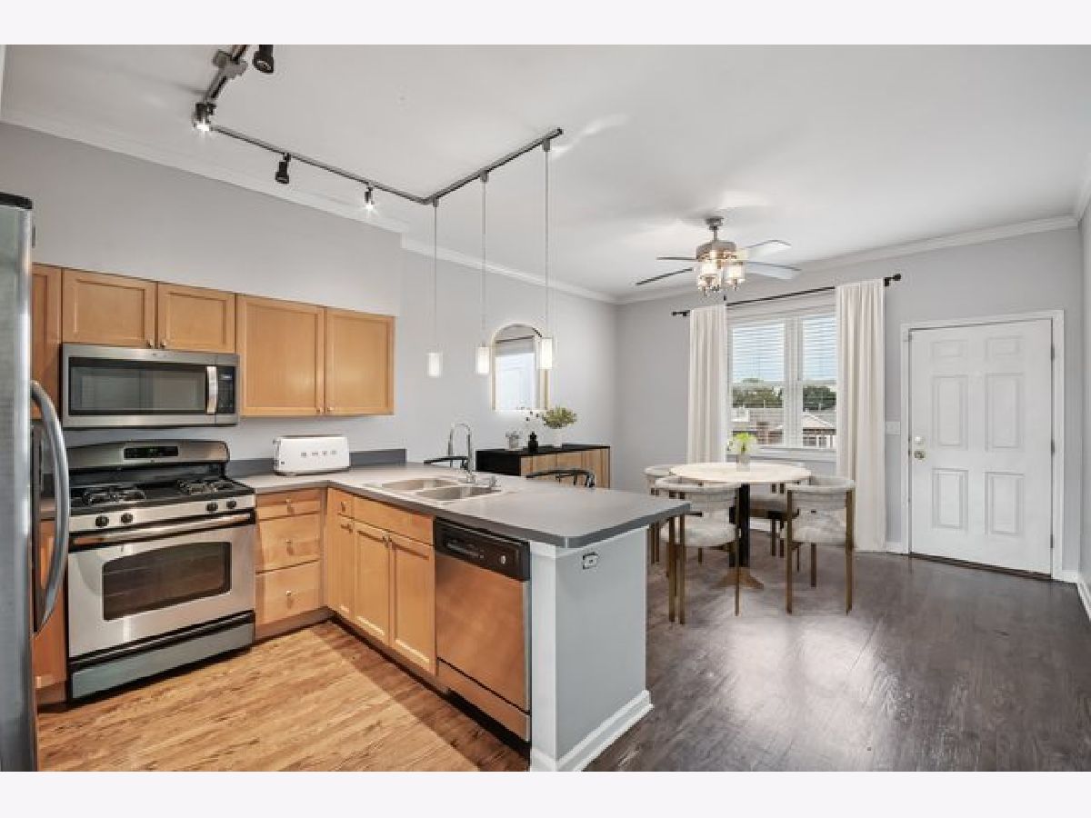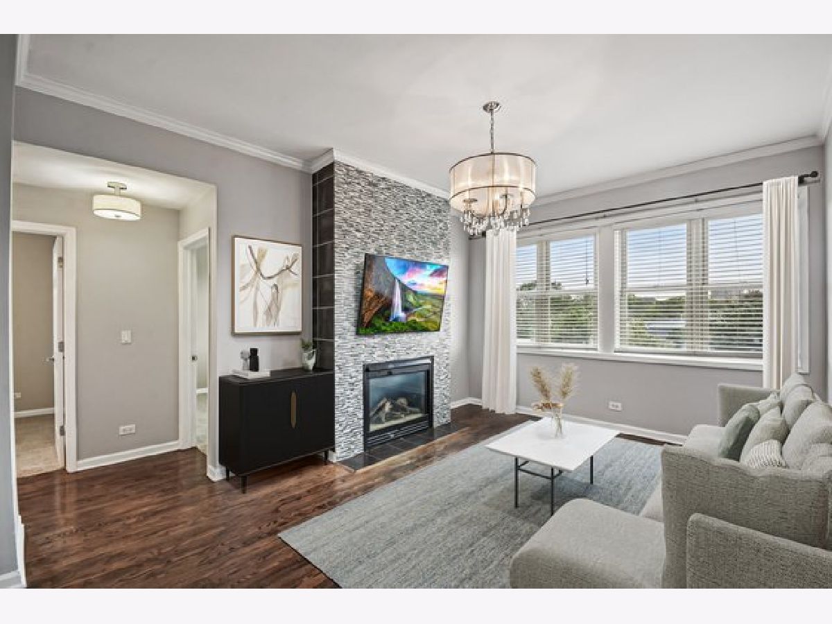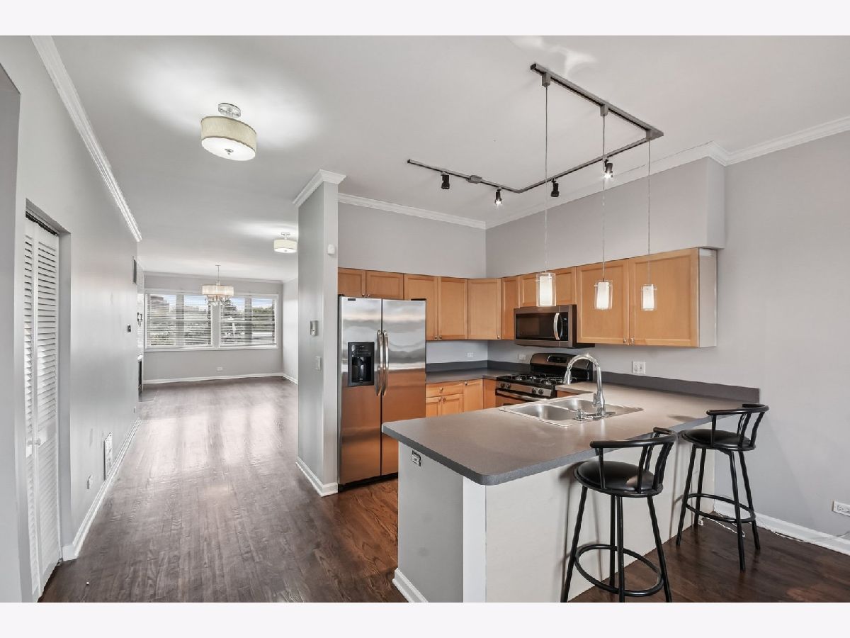 Location, location, location! This airy, sun-drenched top-floor 3BR/2BA condo with soaring ceilings is perfectly situated in North Kenwood. Bright and spacious living room features a stunning floor-to-ceiling stone fireplace and flows seamlessly into the dining area, creating an ideal space for entertaining. The large kitchen offers a peninsula with breakfast bar, stainless steel appliances and additional space for a table or sitting area. The primary suite includes dual closets and a private ensuite with a relaxing soaking tub. Two additional bedrooms share a well-appointed hall bath. Step outside to your expansive private deck-fully rebuilt in 2024-or enjoy the shared common yard. Additional features include one detached garage space, a large private storage room in the basement and gated front entry. The building completed staircase repairs in 2024. Unbeatable location - just two blocks from Lake Shore Drive, the lake front, 47th Street Metra & multiple bus lines. Enjoy the convenience of being minutes to grocery stores, dry cleaners, shopping, fitness centers and restaurants!