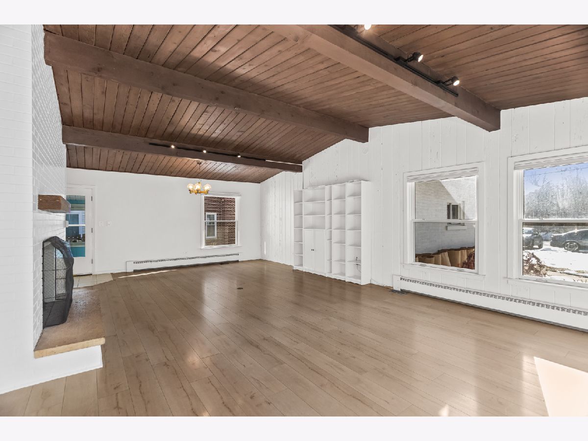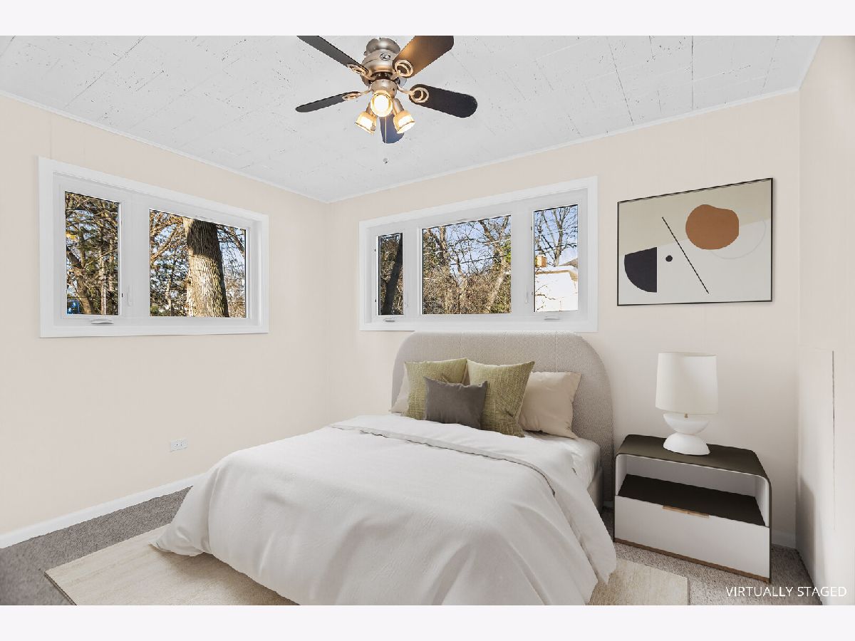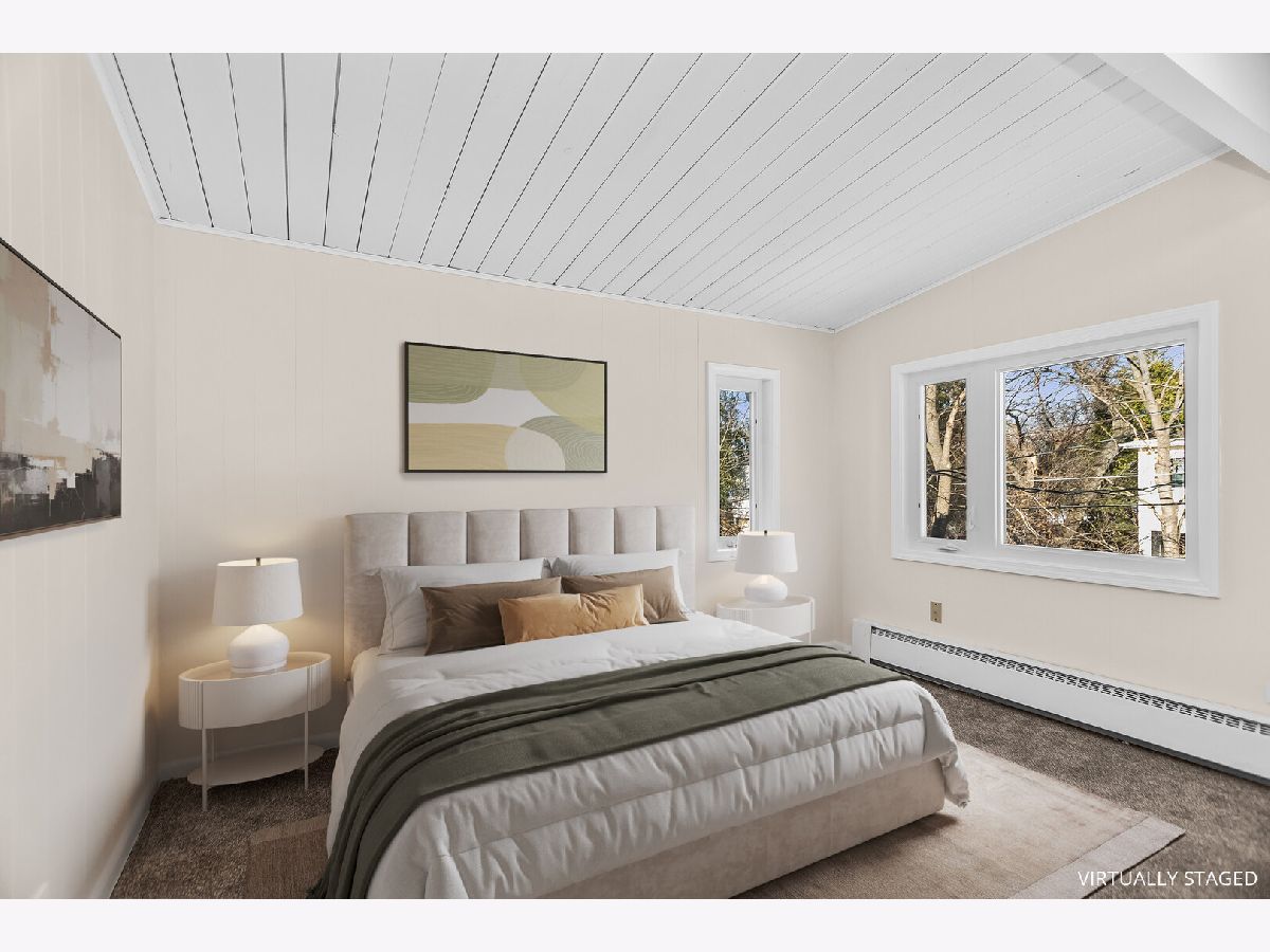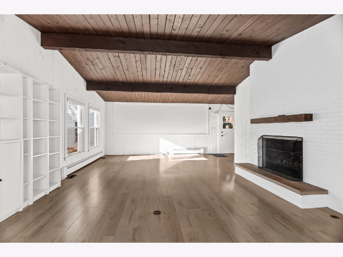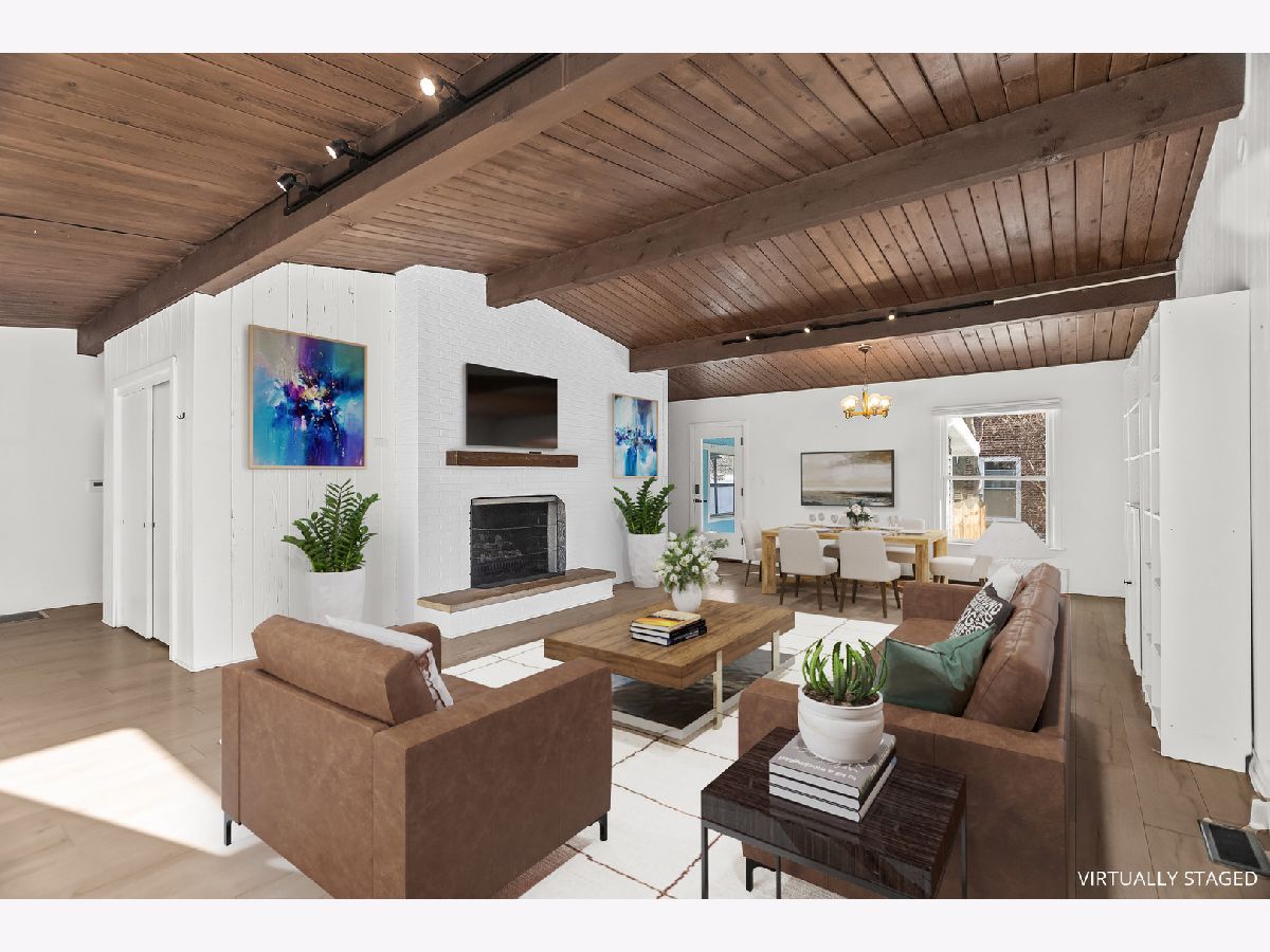 This charming mid-century home offers 4 bedrooms, 2 updated baths, and a thoughtful blend of character, light, and modern comfort. Step inside and feel the difference. Updated energy-efficient windows, fresh paint in all bedrooms and baths, and abundant natural light throughout. The stunning great room features 10-ft vaulted ceilings, exposed beams, Pecky cypress walls, and a floor-to-ceiling brick gas fireplace-perfect for everyday living and entertaining. The dining area flows into the updated kitchen with stainless steel appliances, Italian granite countertops, two-tone cabinetry, blue glass backsplash, and a walk-in pantry/baker's nook. The main level includes two bedrooms with custom closets, an updated bath, new carpet, and a versatile 3-season room ideal for an office or sun porch. Upstairs are two additional bedrooms (including one with an oversized closet), and a brand new Bosch mini-split for added comfort. A fully renovated bath, brand new windows flooding the floor with natural light. A fully finished basement (429 s.f.) offers flexible living space with many built-ins, storage, a second fridge, and newer washer/dryer. Set across from a forest preserve with walking and biking trails, the home also features a large fenced yard, brick-paver patio, pergola, and one-car garage. Major updates include a recent 30-year roof and gutters (2024), finished basement, 200-amp electrical, and EverDry waterproofing. Prime Highland Park location-near the Chicago Botanic Garden, forest preserves, great schools and walking distance from Metra! Warm, bright, and move-in ready. No pets, no smokers, please.