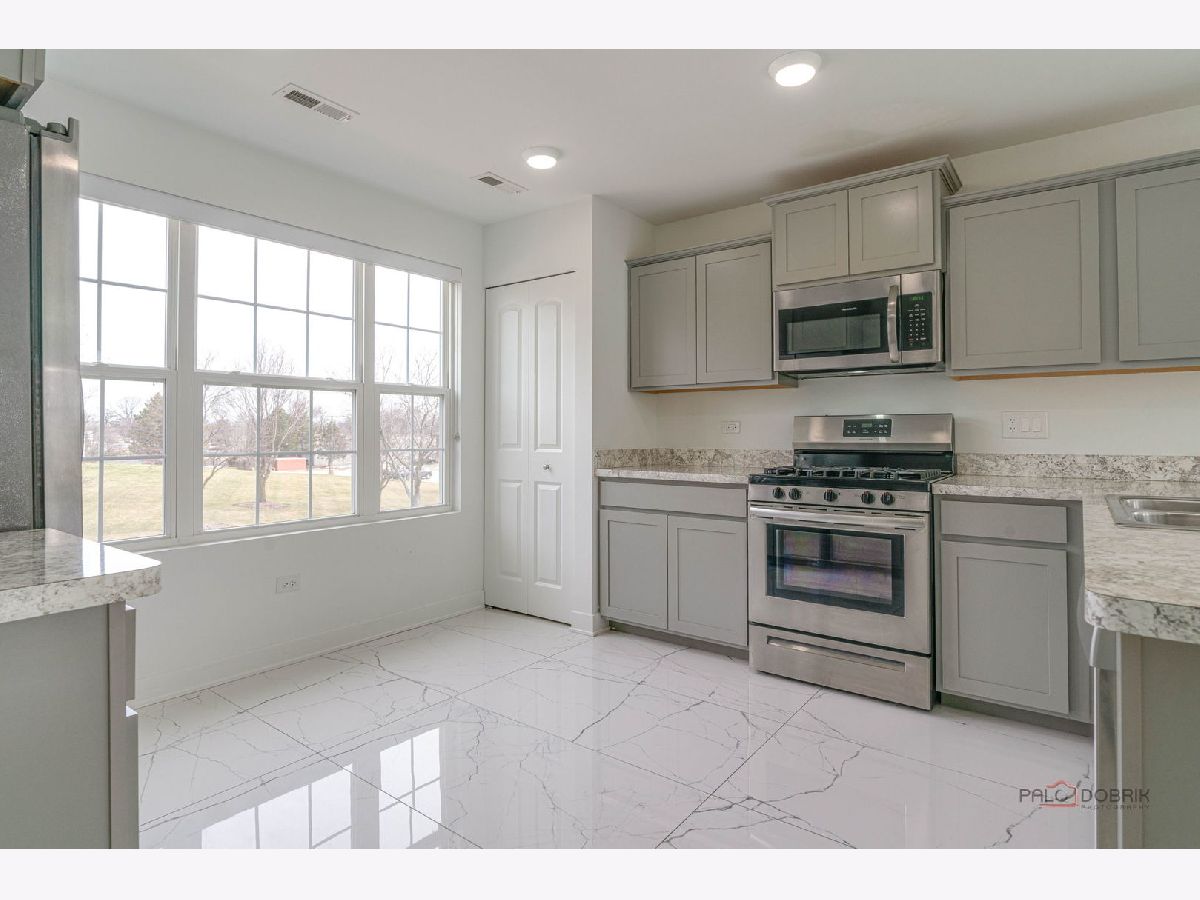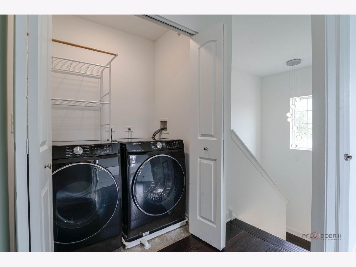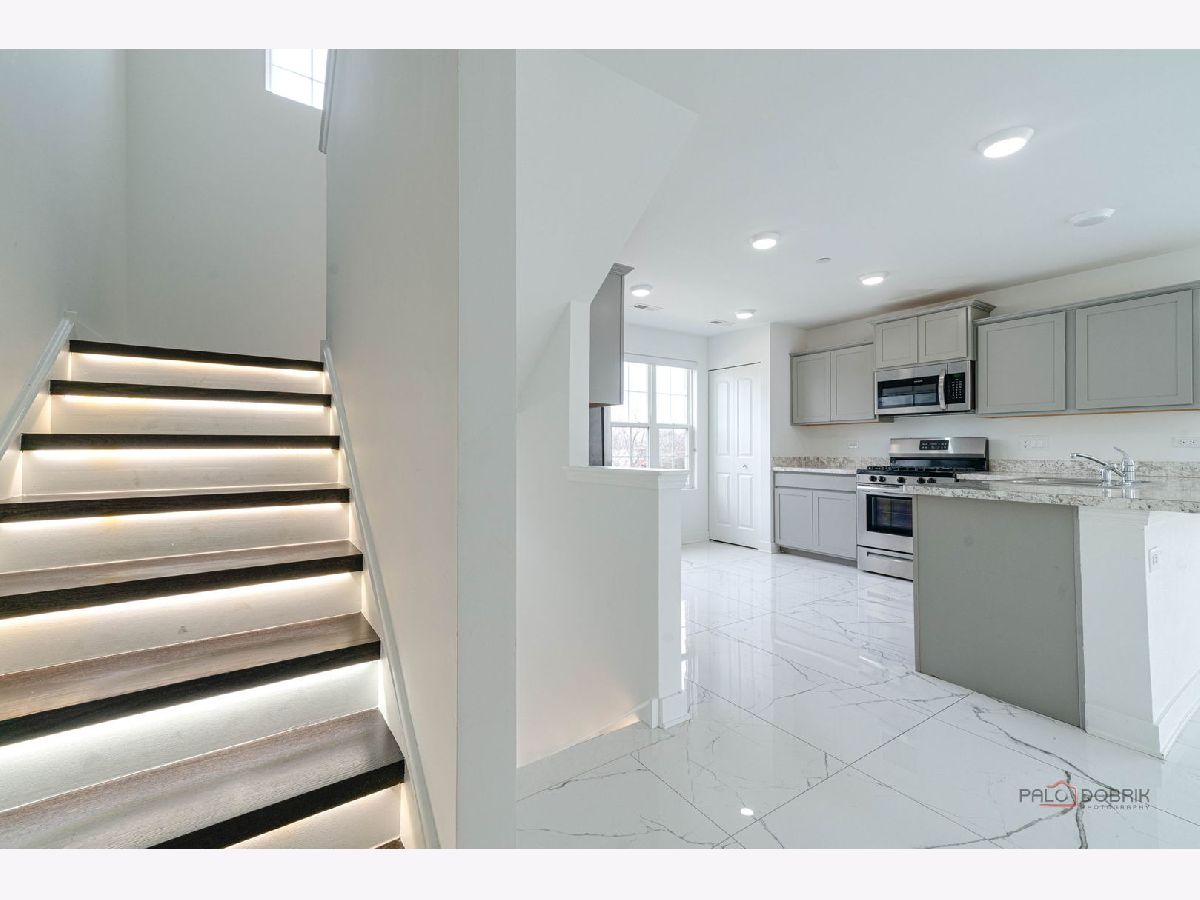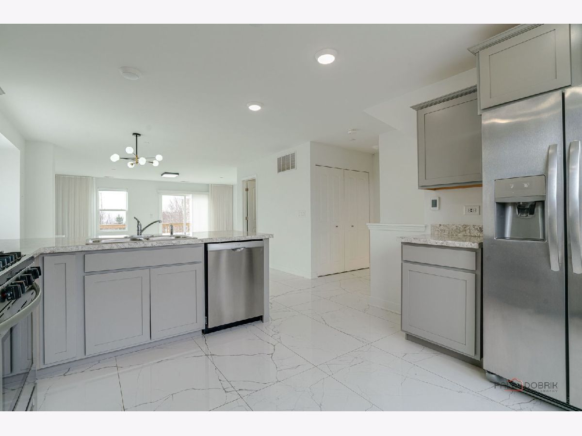 This stunning three-bedroom, two-and-a-half-bathroom, three-story, end-unit townhome in the desirable Lake Ridge Townhome subdivision of Mundelein offers a sleek, contemporary design throughout. The main level features an open-concept layout highlighted by a modern kitchen with gray Shaker cabinetry, stainless steel appliances, and a breakfast bar overlooking the dining area. The dining room flows seamlessly into the living room, creating an ideal space for both everyday living and entertaining. Gleaming, heated tile flooring enhances the home's clean, contemporary aesthetic. A sliding glass door off the living room leads to a private deck with pond views. Upstairs, you are welcomed by illuminated stair treads and hardwood flooring throughout the bedroom level. The spacious primary suite includes a walk-in closet and an ensuite bathroom with gray Shaker cabinetry and a walk-in shower with clear glass doors. Two additional bedrooms, a full hall bathroom, and a convenient laundry closet with a front-load washer and dryer complete this level. The lower level offers a versatile space, perfect for a home office, featuring built-in shelving. The attached two-car garage includes an electric vehicle charger. Ideally located near restaurants and shopping, this property is available for immediate occupancy with a one-year lease.