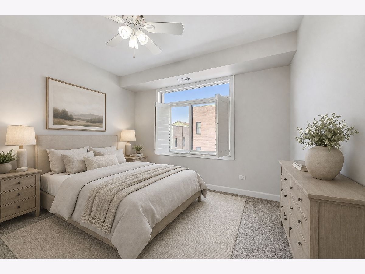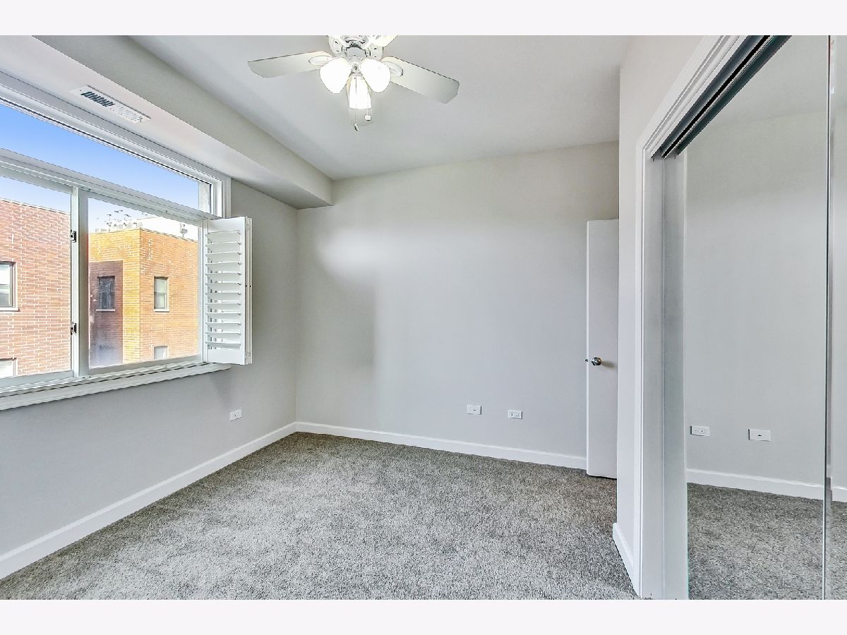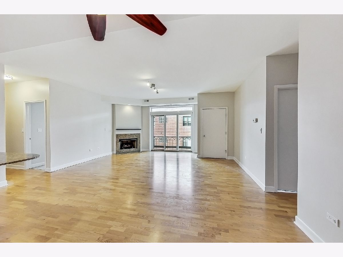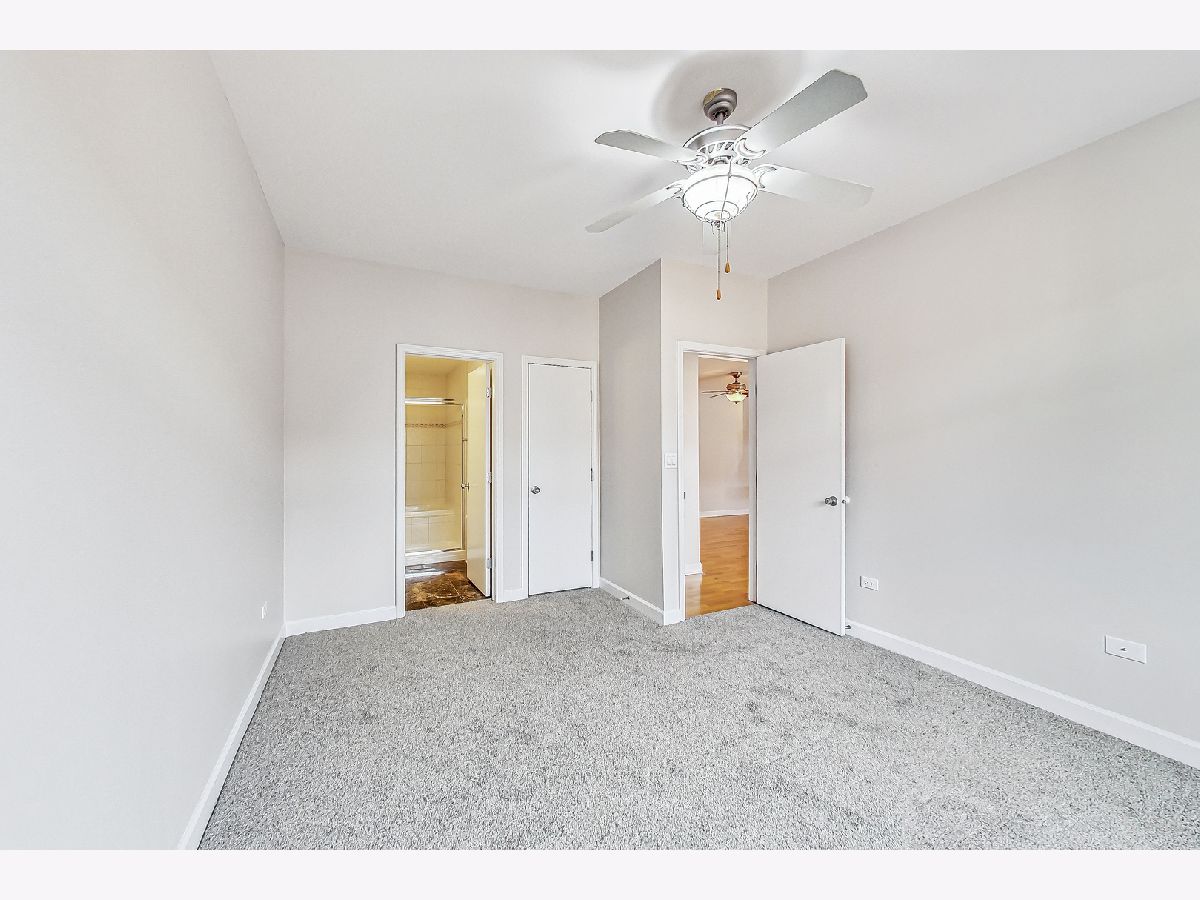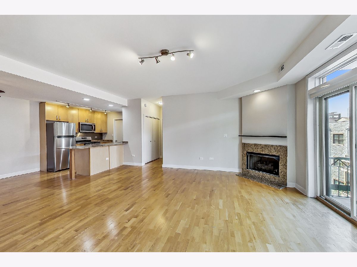 River West bright and spacious 2 bed, 2 bath condo in elevator building with (1) garage parking space #65 included! This split 2 bedroom floor plan has newer stainless steel appliances, new carpeting in the bedrooms, updated baths with new vanities and lighting. The condo has hardwood floors throughout living room and kitchen. Open kitchen with granite counters, stainless steel subway tile backsplash, breakfast bar, and room for a separate dining area. Additional features include plantation shutters in each bedroom, gas fireplace, balcony, in-unit walk-in laundry closet with pantry space for additional storage. Primary bedroom has en-suite bath and walk-in closet. Elevator building with common rooftop deck with great city views, and shared grills and seating for summer cookouts. 1 block to Blue Line, Expressway, shopping, dining & nightlife. Additional bike storage area. (WiFi included in rent thru Everywhere Wireless or can upgrade for additional cost with Comcast) - tenant pays for gas and electric. Unit available 1st week of May. (No pets)