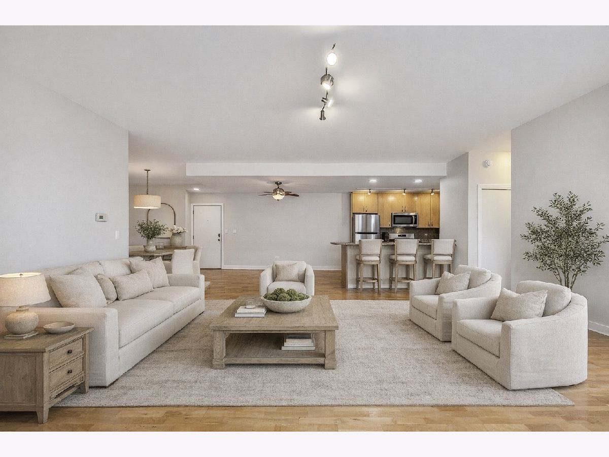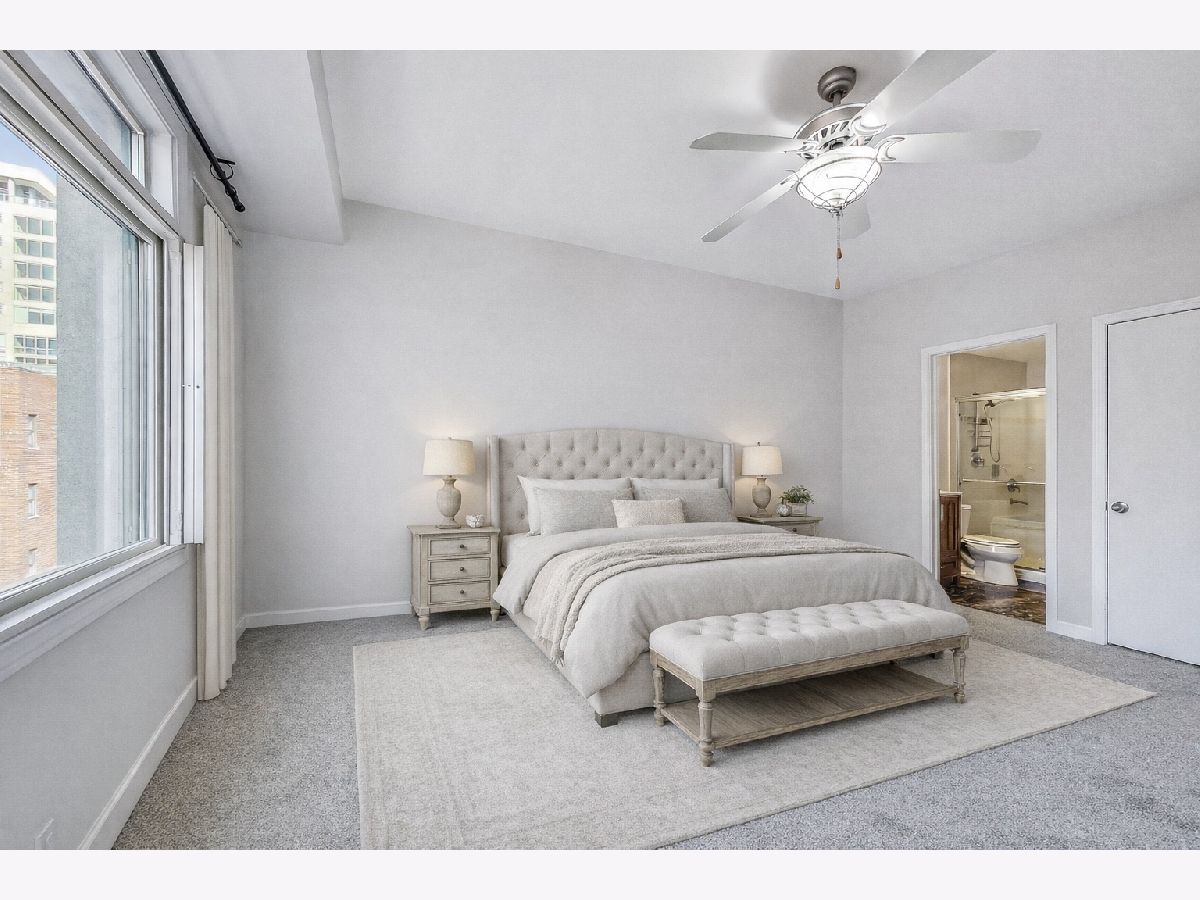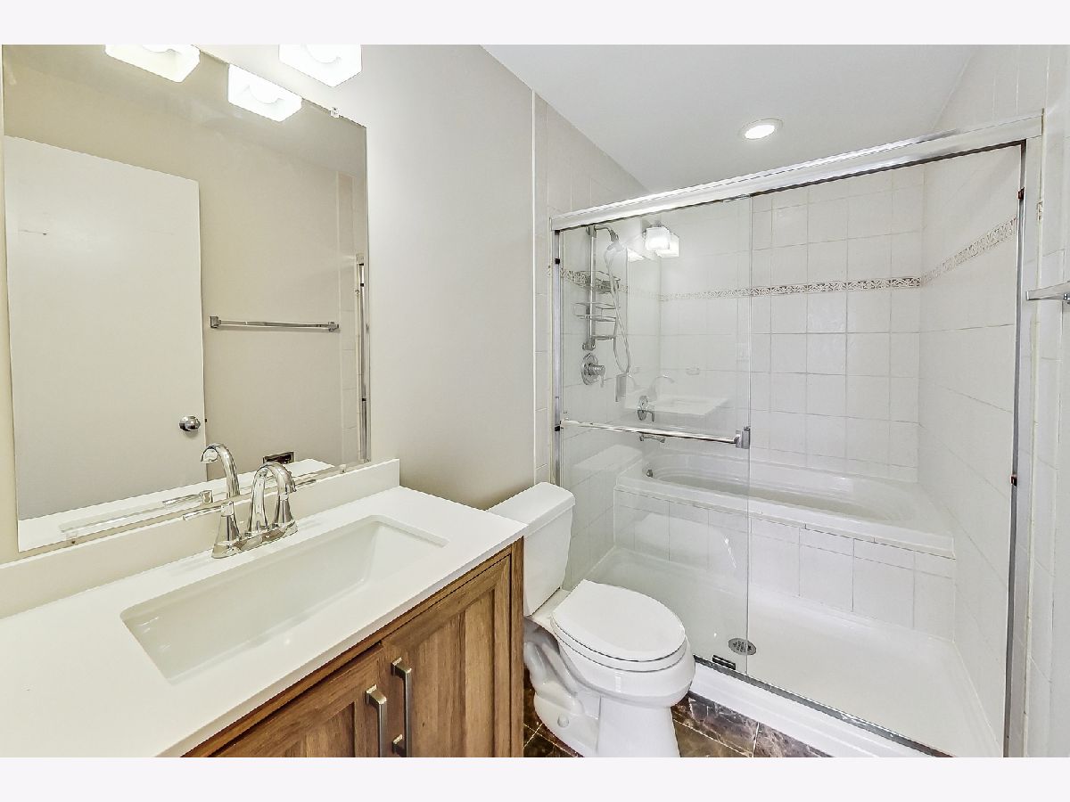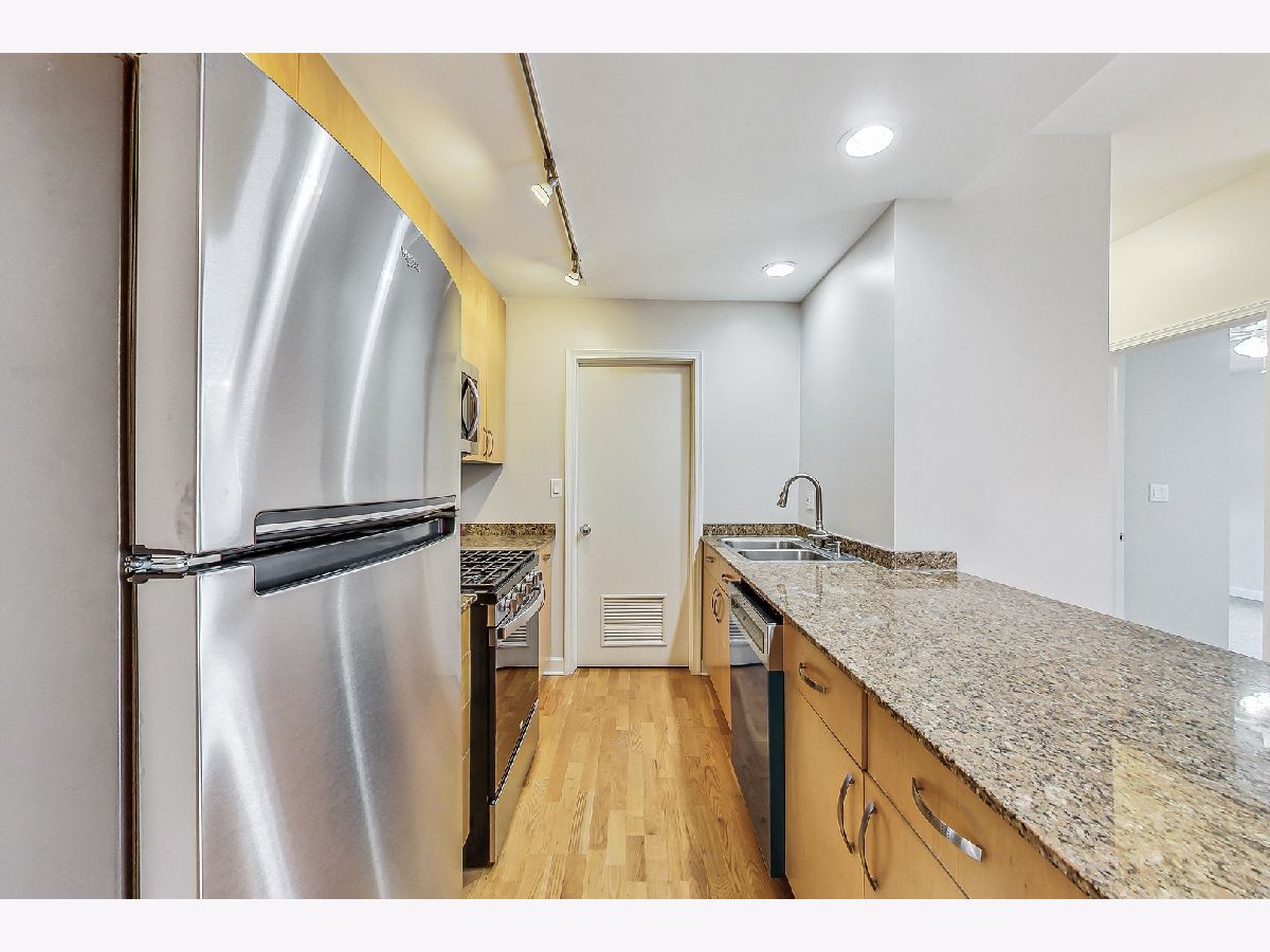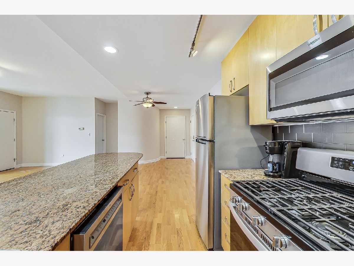 River West bright and spacious 2 bed, 2 bath condo in elevator building with (1) garage parking space #65 included! This split 2 bedroom floor plan has newer stainless steel appliances, new carpeting in the bedrooms, updated baths with new vanities and lighting. The condo has hardwood floors throughout living room and kitchen. Open kitchen with granite counters, stainless steel subway tile backsplash, breakfast bar, and room for a separate dining area. Additional features include plantation shutters in each bedroom, gas fireplace, balcony, in-unit walk-in laundry closet with pantry space for additional storage. Primary bedroom has en-suite bath and walk-in closet. Elevator building with common rooftop deck with great city views, and shared grills and seating for summer cookouts. 1 block to Blue Line, Expressway, shopping, dining & nightlife. Additional bike storage area. (WiFi included in rent thru Everywhere Wireless or can upgrade for additional cost with Comcast) - tenant pays for gas and electric. Unit available 1st week of May. (No pets)
