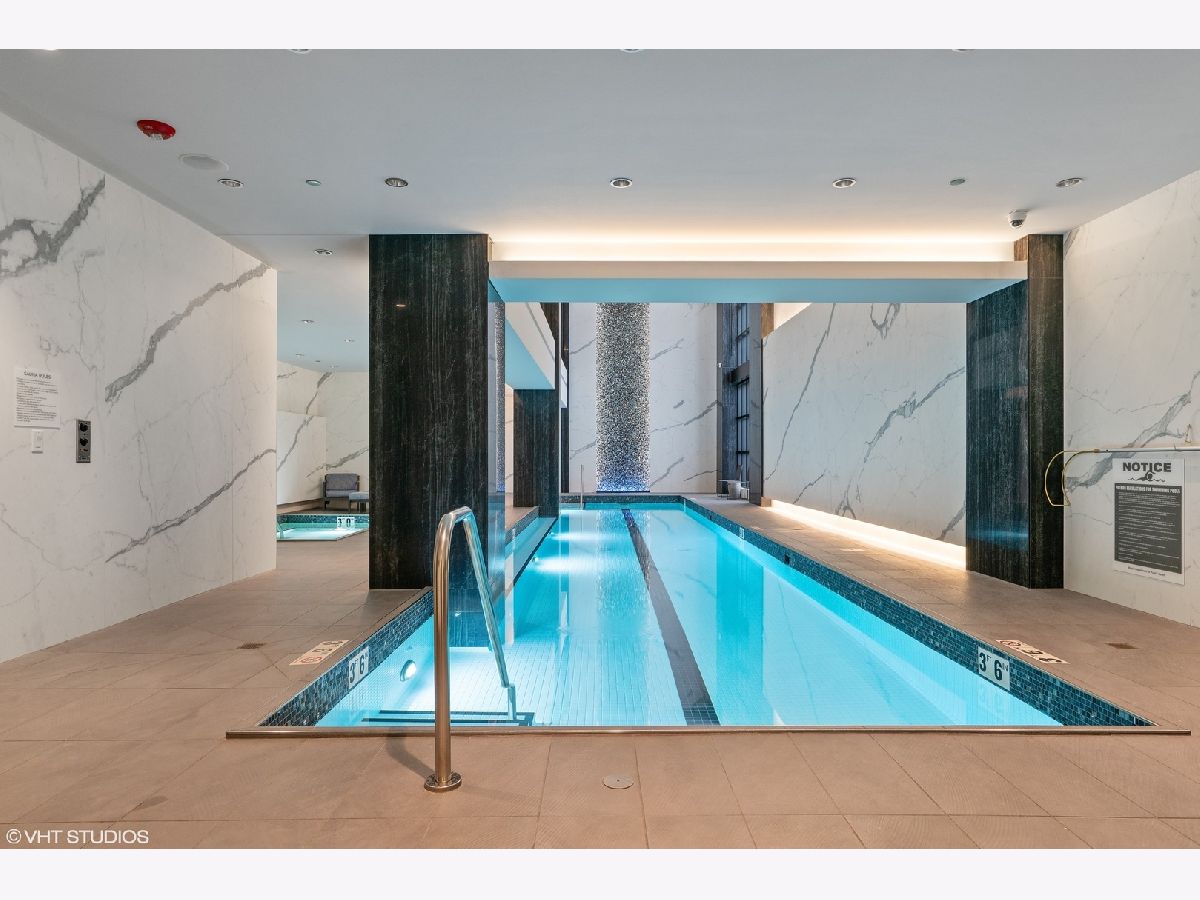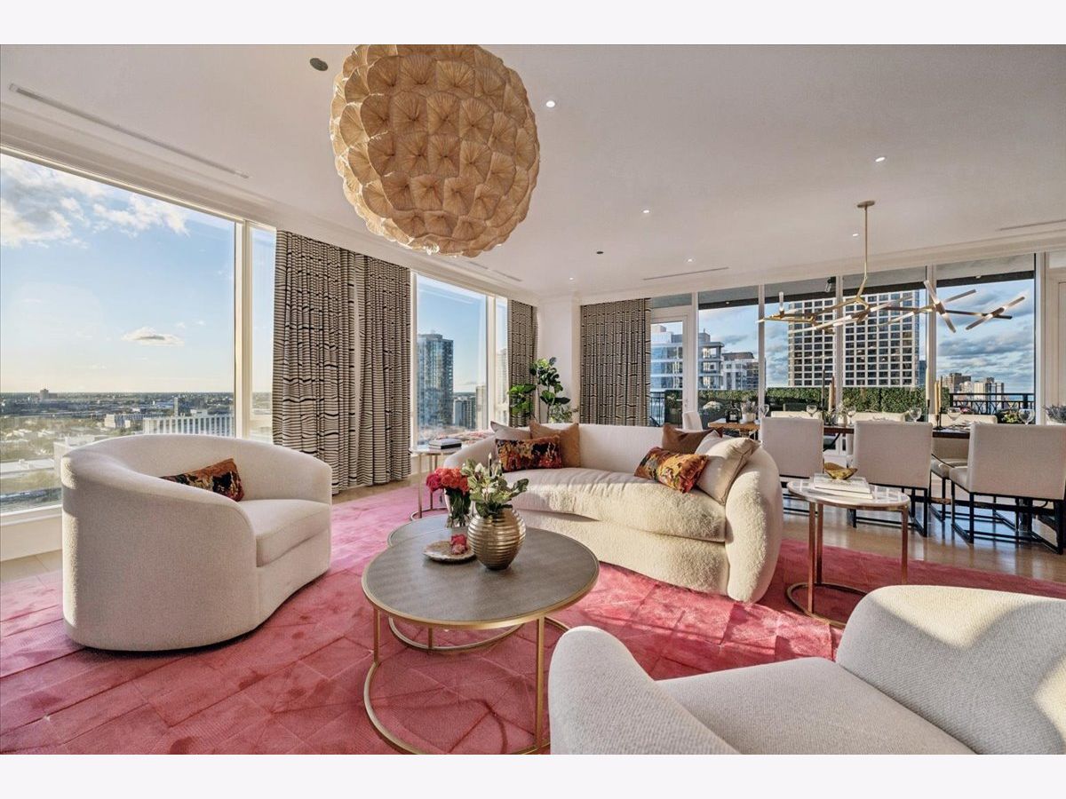 This remarkable 4-bedroom plus office, 4.1-bath corner residence is perfectly positioned on the 22nd floor of one of the Gold Coast's most prestigious addresses, capturing breathtaking lake and sunset city views. Rarely available, the expansive layout is bathed in natural light, with bespoke black and white marble mosaic tile setting a tone of refined sophistication from the moment you are welcomed by the foyer. With wide-plank white oak floors leading you through abundant storage within the entry halls, distinctive touches abound, such as the frontmost powder room adorned with hand-painted Paul Montgomery wallpaper and a collection of thirty carefully curated pendant lights from Design within Reach, Rejuvenation, Lightology, and 1st Dibs including antiques from Italy and France. The chef's kitchen is a true showpiece, appointed with O'Brien Harris custom solid walnut kitchen cabinetry and Buster + Punch brass hardware, Wolf appliances-including dual ovens-and a striking Calacatta marble island with an integrated stovetop and pop-up hood. Practicality meets luxury with two 30" Designer Over-and-Under Sub-Zero Legacy Model Refrigerator/Freezers and a plentiful walk-in pantry. While cooking dinner at sunset, one looks out at floor-to-ceiling windows framing sweeping panoramas across the open living and dining areas. The perfect setting for relaxation and entertaining is enhanced by custom drapery throughout, crafted with designer fabrics including Dedar Milano silks and Jean-Paul Gaultier for Lelievre. Entering each living space through solid maple double doors surrounded by custom-carved millwork, the family room and study extend the home's versatility while each bedroom boasts its own full ensuite with radiant heated floors, ensuring privacy and comfort. Custom floating walnut vanities are topped with marble and accompanied by bespoke tile and hardware finishes. The primary suite occupies its own wing, complete with terrace access, a custom walk-in dressing room with storage for all seasons, and a spa-inspired bath featuring an extra large soaking tub with lake views. Additional conveniences include Control4 integration for commanding lights, shades, curtains, TVs, and the state-of-the-art sound system with invisible speakers throughout the home and on the deck, a full laundry room with new Samsung SmartThings washer & dryer and sink, and two assigned parking spaces. Residents enjoy full-service living with five-star amenities and white-glove service: 24-hour door staff, optional valet, an indoor pool and spa, a two-story fitness center, golf simulator, guest suites, and beautifully designed entertaining spaces including a catering kitchen, bar, and expansive hosting terrace. Just moments from Chicago's celebrated restaurants, cultural destinations, parks, and Lake Michigan, this residence offers a rare combination of scale, sophistication, and service creating an unparalleled opportunity for luxury city living.