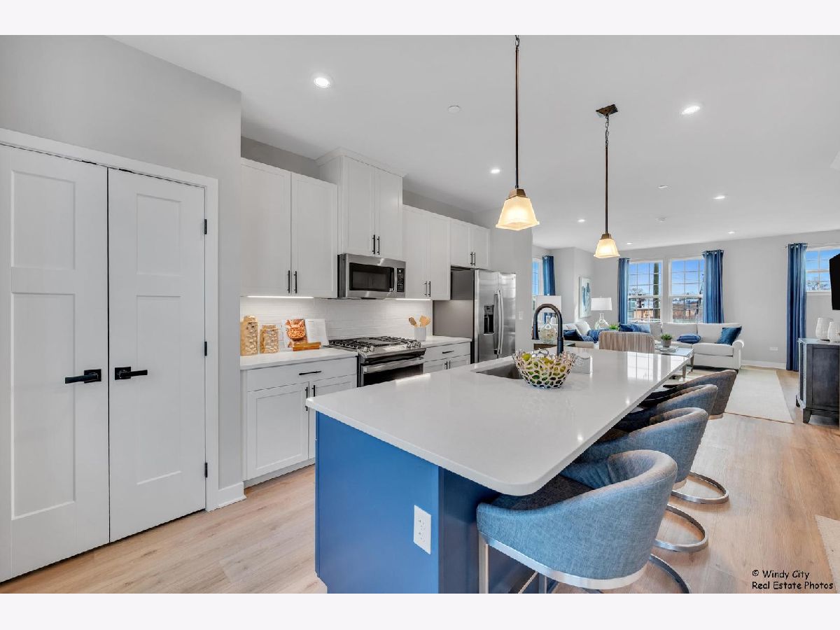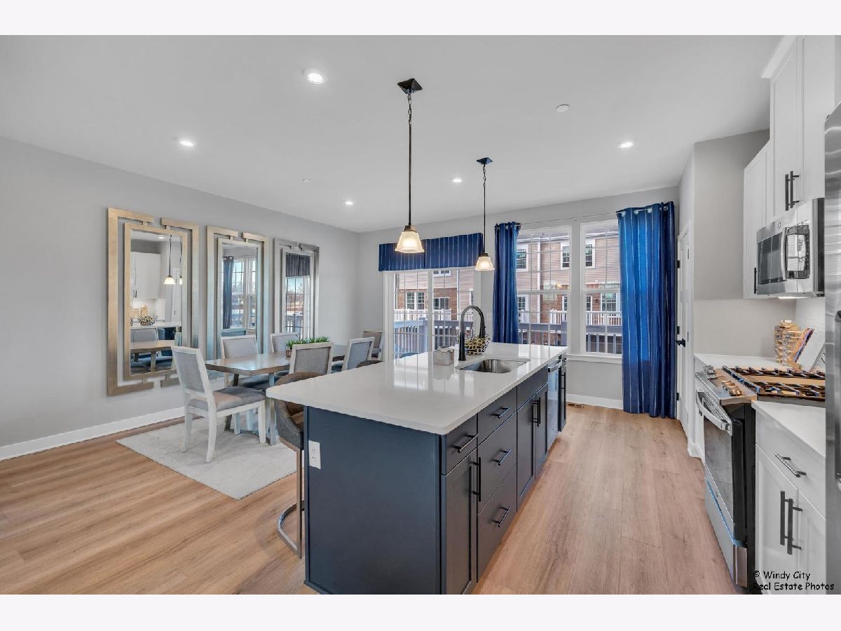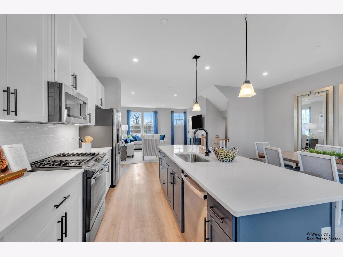 Come see this new construction former model unit and discover the perfect blend of convenience and luxury in this stunning end-unit, 2-car garage townhome in Wheeling! The Mozart offers all the benefits of townhome living with the added features of a single-family home. Step into the spacious first floor recreation room ideal for additional living space or entertaining guests. - the level also offers garage access. On the second floor, an expansive kitchen with a large island seamlessly flows into the bright and airy living room, creating the perfect space for relaxation or hosting gatherings. The kitchen is a chef's dream, featuring upgraded cabinets, sleek stainless steel appliances, and gorgeous quartz countertops. A convenient powder room is also located on this level. Upstairs, you'll find two spacious bedrooms with generous closet space, a full hall bath, and a luxurious owner's suite. The owner's bedroom boasts a huge walk-in closet, while the private owner's bath offers a spa-like experience with a dual vanity and a spacious 5' shower. Located in the desirable London Crossing community, this townhome offers easy access to major roads and is just 1 mile from the Metra, making commuting a breeze. Don't miss your chance to own this low-maintenance home in a prime location! No pets and no smoking in the unit.
