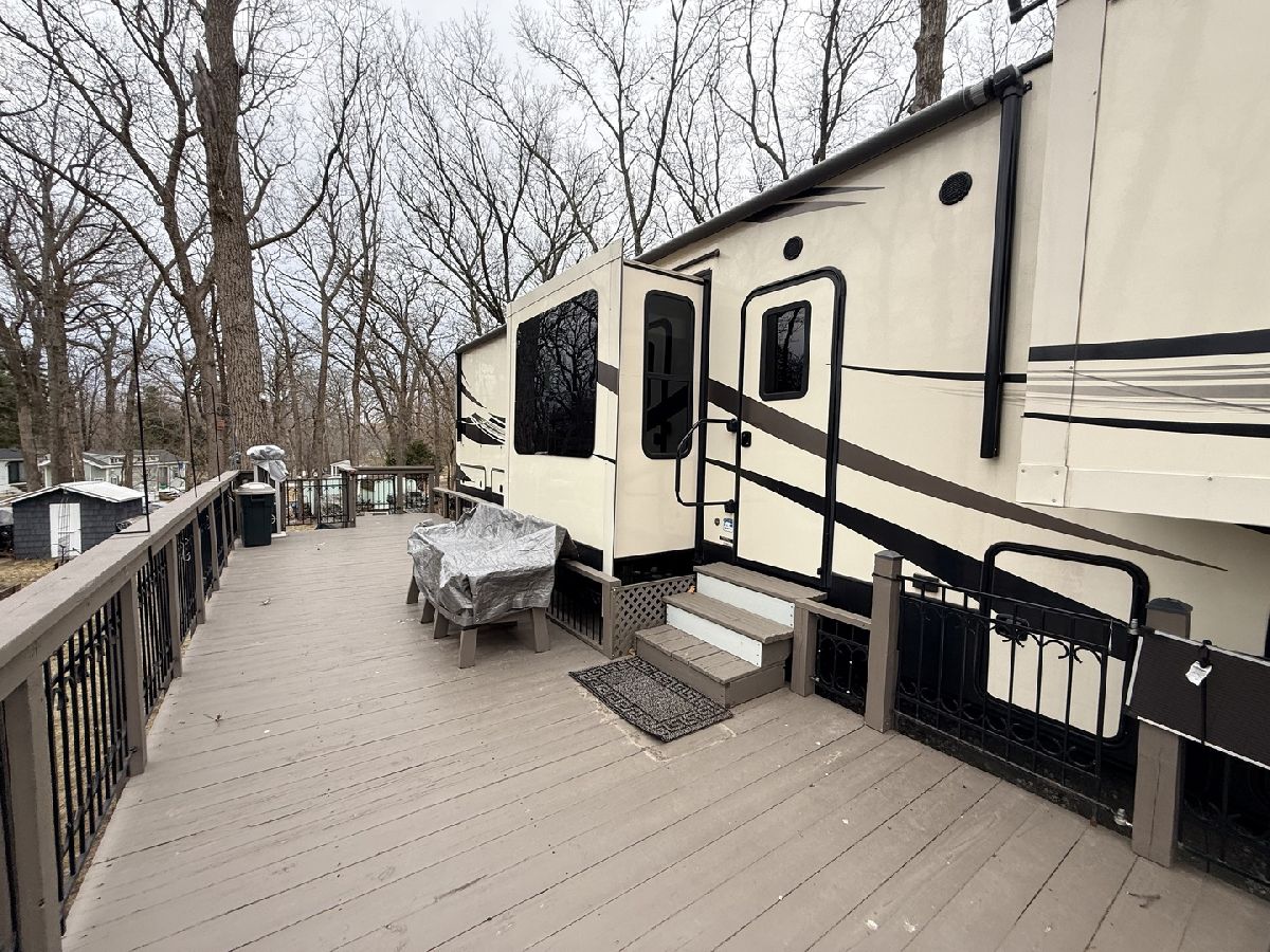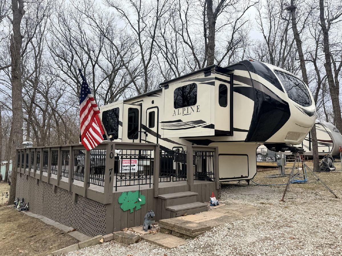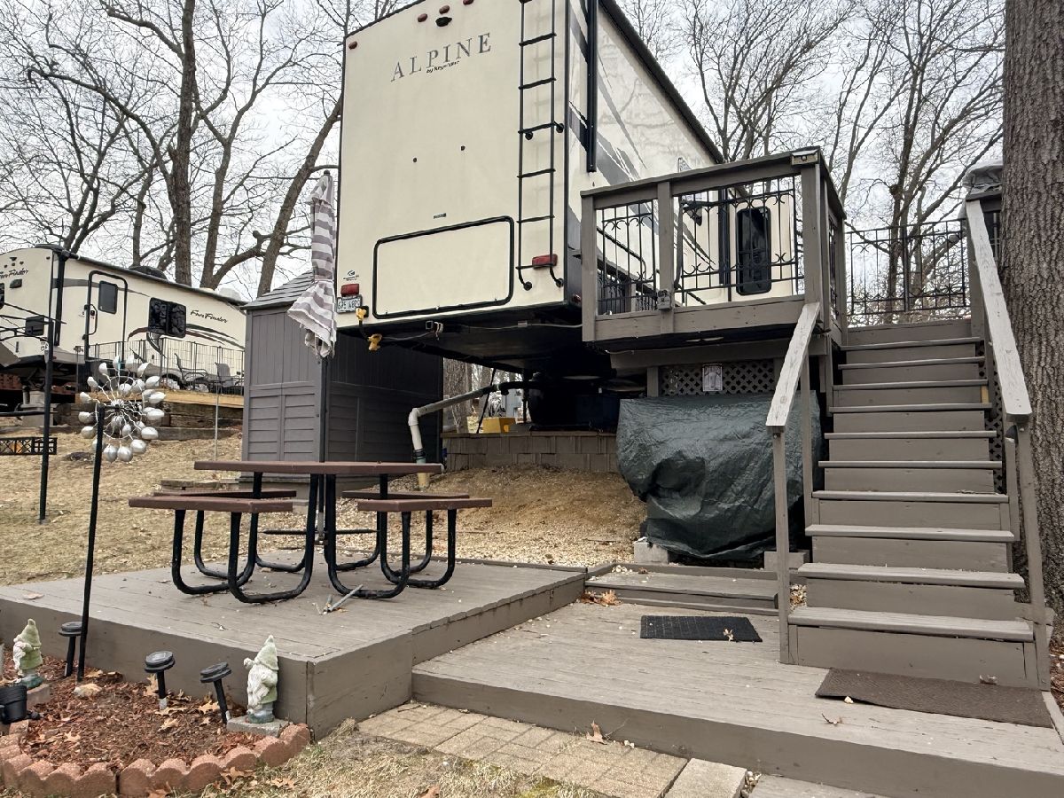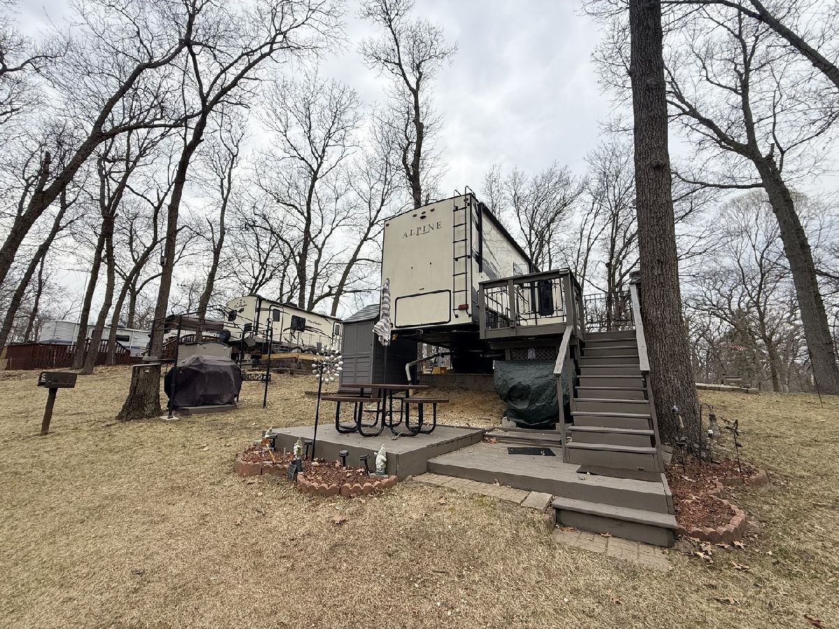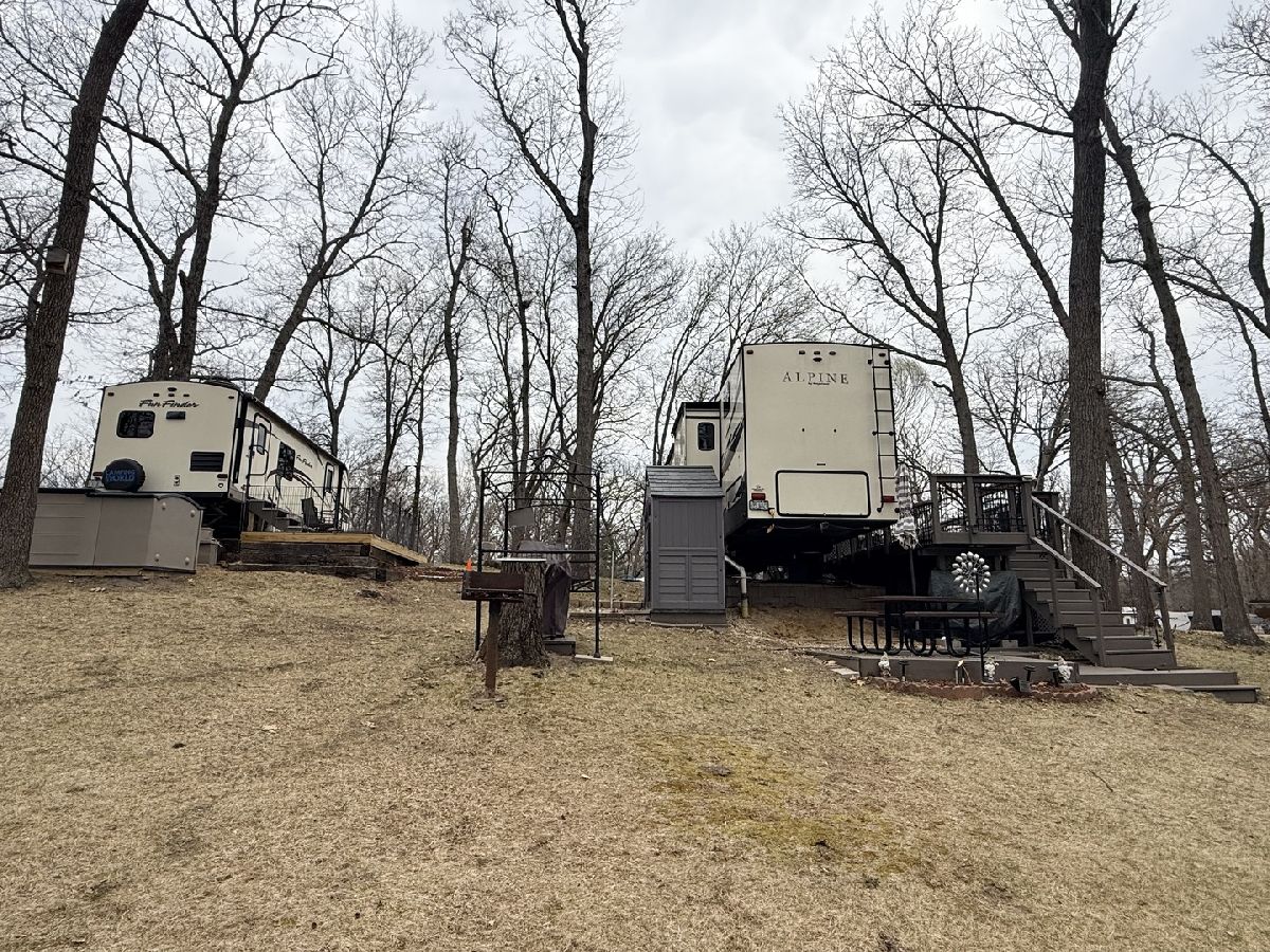 Discover the perfect getaway with two well-maintained, sewered lots in Section 10, offering comfort, space, and everything you need to relax or entertain. One lot features a 2019 Alpine 3700FL travel trailer with five slides, a spacious one-bedroom layout, stunning kitchen area, and an elevated living room that creates a bright, open feel. The second lot includes a 2015 Fun Finder 241LRK travel trailer with one slide, ideal for guests or additional living space. Bedroom includes a features a Tempur-Pedic mattress($2,000). Enjoy the outdoors with three decks throughout the property, a large patio block area with a fire pit, and plenty of firewood neatly stored under tarps to the rear. The property also includes a grill gazebo, gravel driveway, and beautiful landscaping that enhances the overall setting. Additional features include two small sheds (no contents) for extra storage, central A/C and heat with propane gas, roof A/C units, and ample sleeping space throughout both units. All furniture and appliances stay, making this a truly move-in-ready retreat. No outdoor furniture besides the two chairs on the deck of the fun finder. Both winter covers for travel trailer's will stay. Located just a short distance from Bass Lake, this property is perfect for weekend escapes or extended stays-call today to schedule your private showing! Picnic table, Grill, small table on deck does not stay. Please note that Woodhaven Lakes is a gated recreational community and cannot be used as a primary residence or homestead. You must be accompanied by a broker to view any properties, YOU CANNOT ACCESS THE CAMPGROUND WITHOUT A PASS. The property owner pays the association fees.