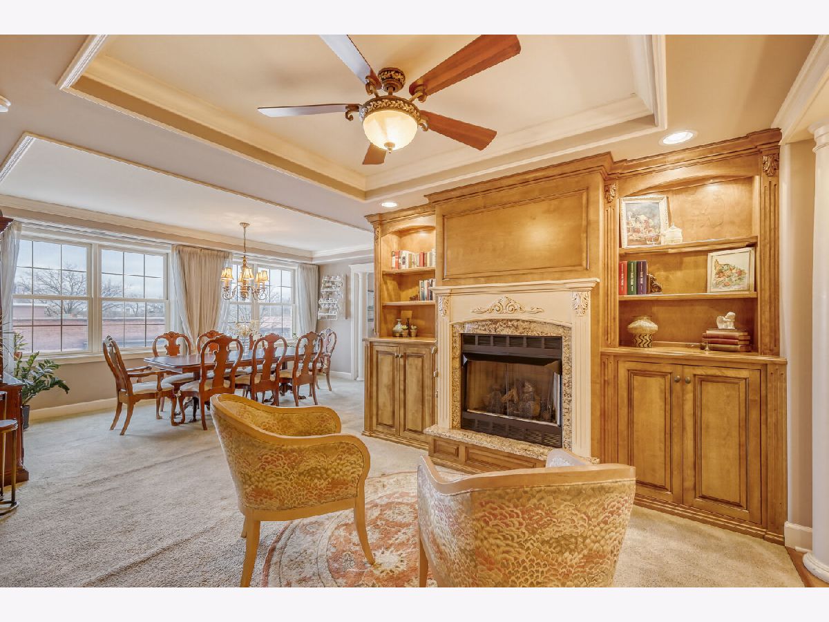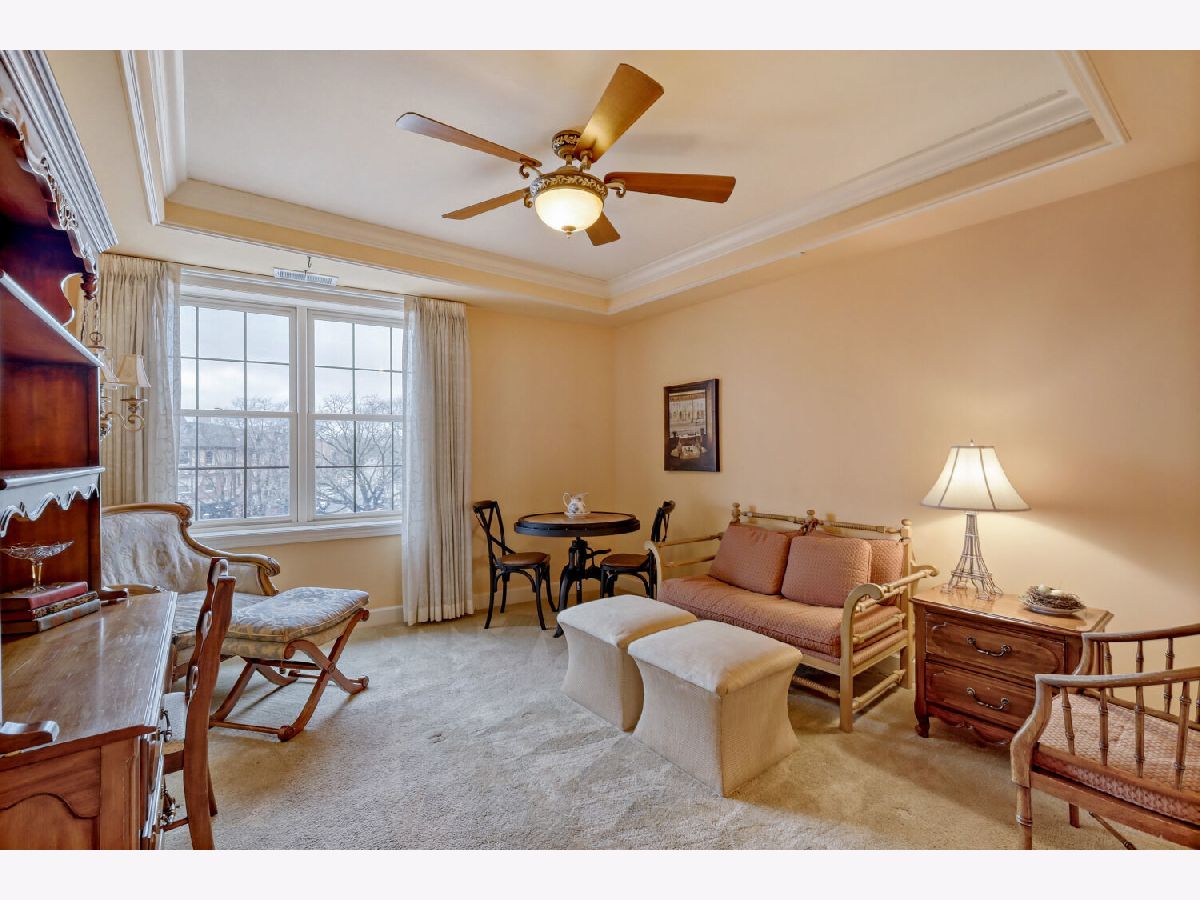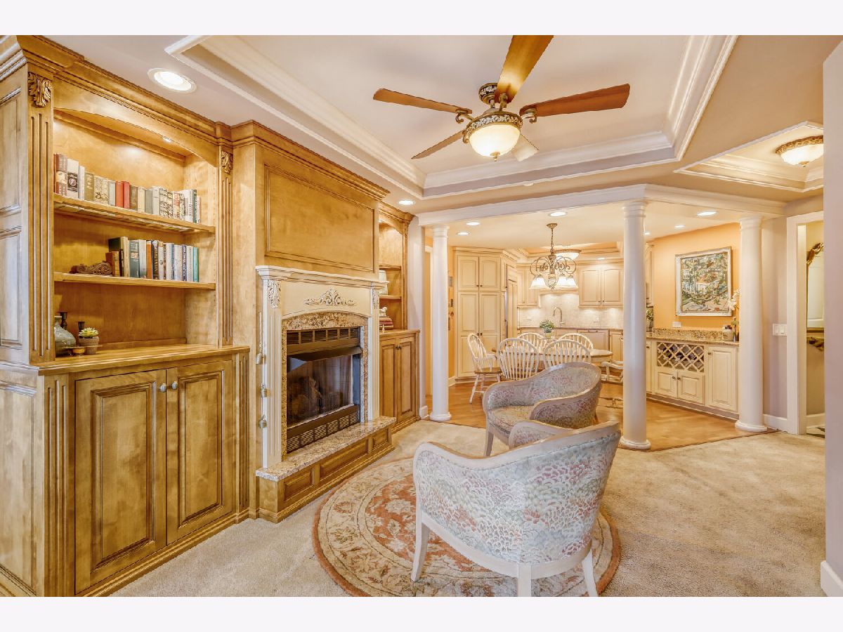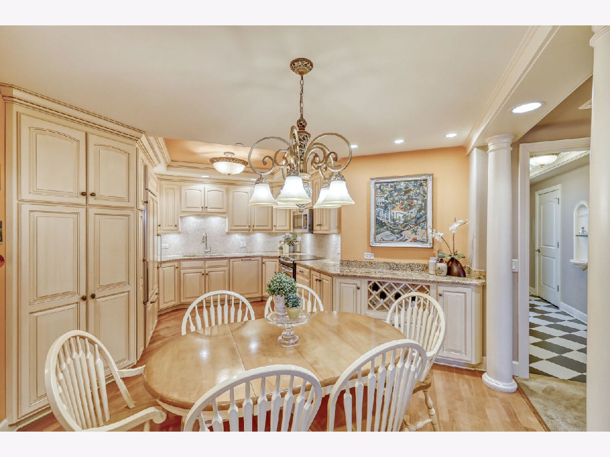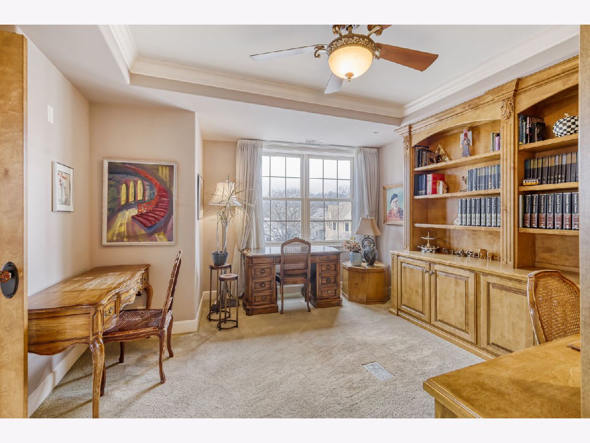 Located in one of the nation's first planned suburbs just nine miles from Chicago and surrounded by natural beauty, this exceptional end-unit luxury condo offers a seamless blend of classic elegance and modern comfort. A bold black-and-white tiled entryway makes a striking first impression, opening to sun-filled interiors with tall ceilings, rich detailing, and exquisite custom millwork throughout. The thoughtfully designed floor plan includes three ensuite bedrooms, each with custom-organized closets. The serene primary suite features volume ceilings and a spa-like bath with a soaking tub, oversized walk-in shower, and double vanities. A charming French country eat-in kitchen, with custom Das Holz Haus beveled door cabinetry, granite counters, high-end appliances including a Sub Zero cabinet paneled refrigerator, and tile backsplash, flows effortlessly into a cozy fireplace sitting area and a formal dining room, perfect for entertaining. A bright and inviting living room with graceful rounded lines adds character and warmth, while French doors lead to a dedicated office or flexible third bedroom suite. With windows on multiple exposures, natural light fills every corner of the home. Set within an elegant, well-maintained building just steps from dining, shopping, and the train, this residence offers a sophisticated, maintenance-free lifestyle in an unbeatable location. Major updates include HVAC 2025, Aprilaire humidifier 2025, Honeywell wireless thermostat 2025. Please find extended details sheet attached under additional info.