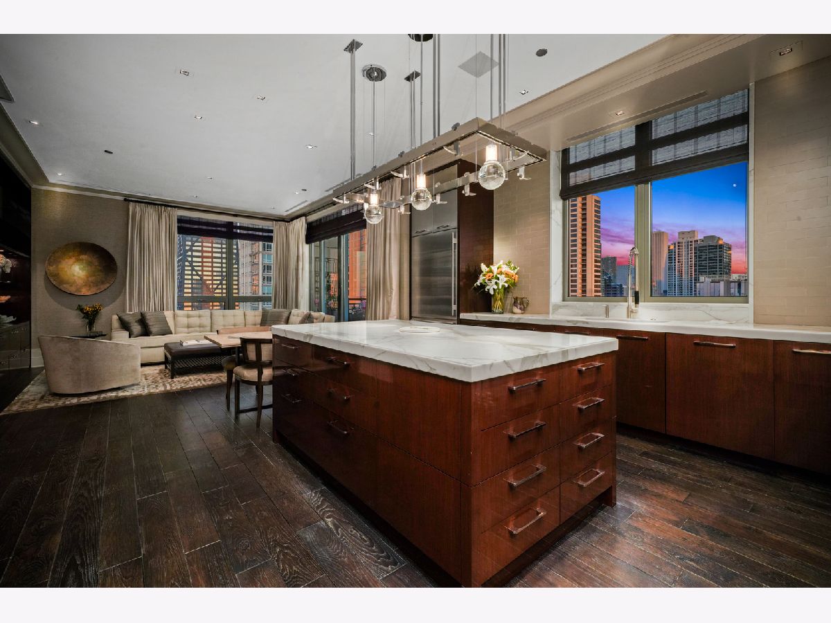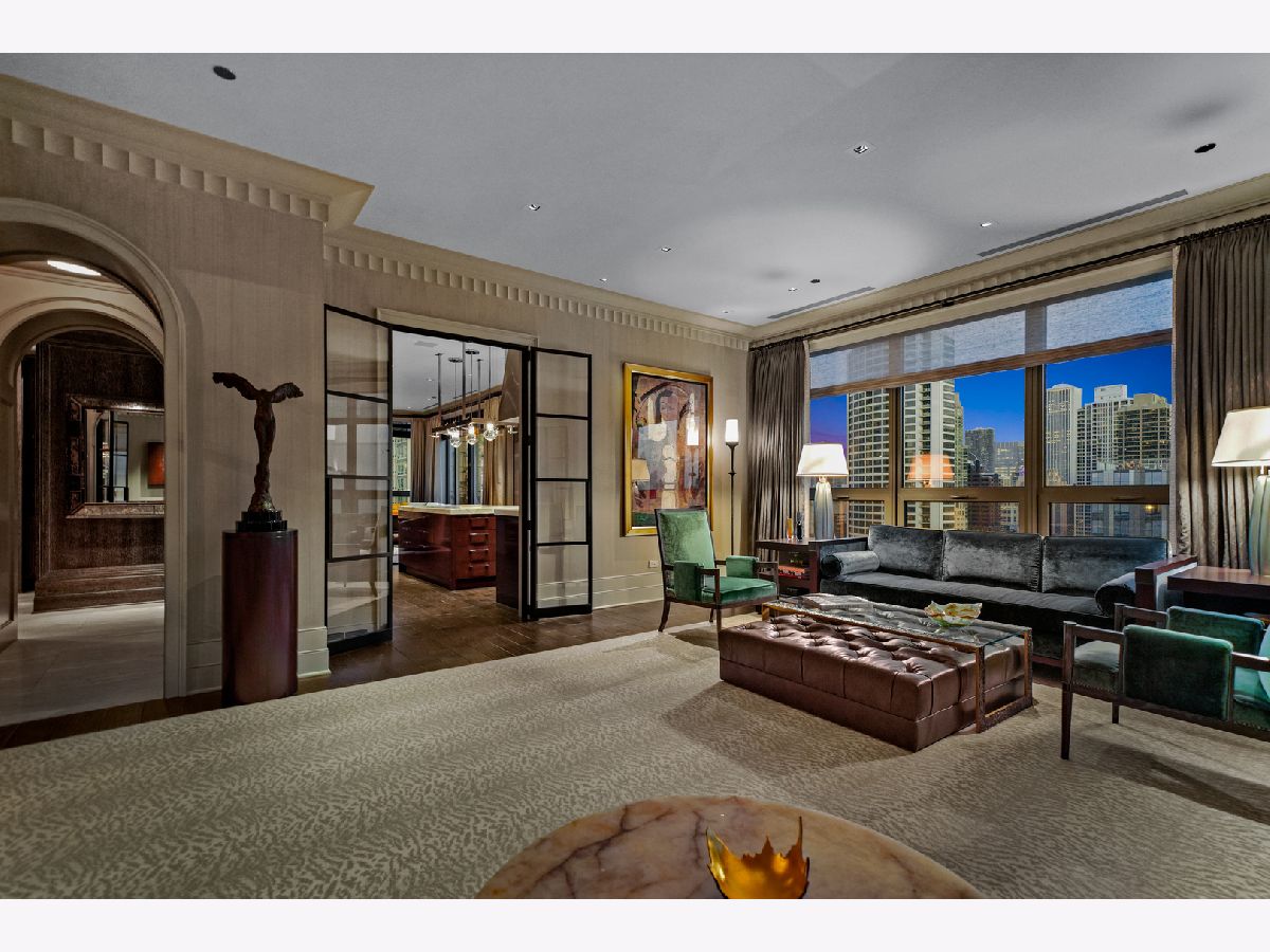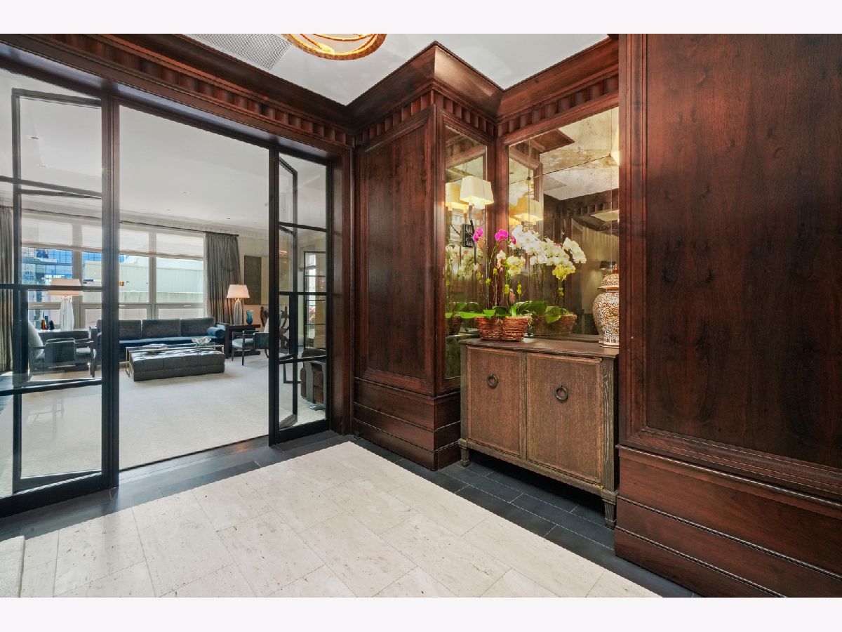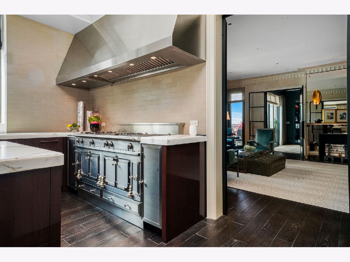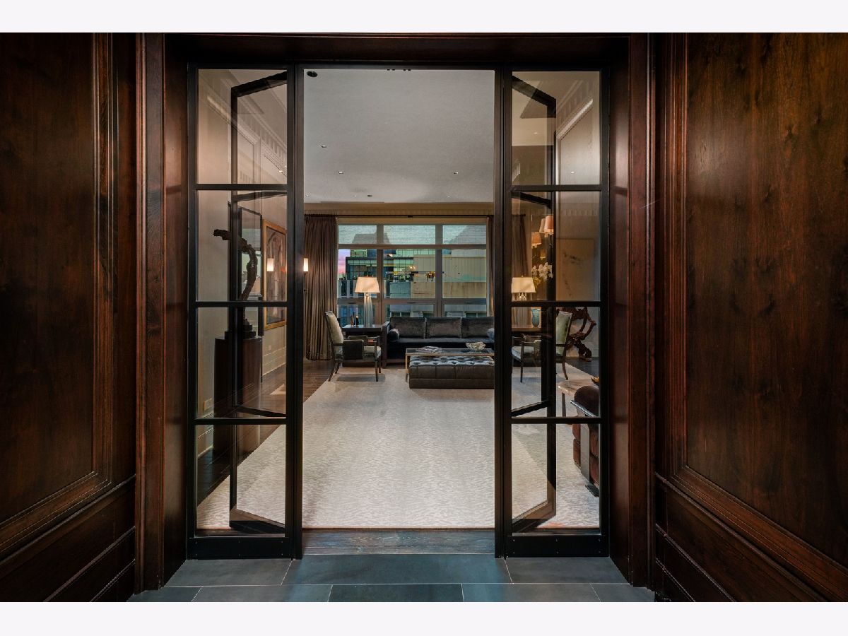 Perched atop the prestigious "10 East" in Chicago's sought-after Gold Coast, this extraordinary custom penthouse defines refined luxury. A dramatic foyer wrapped in rich walnut paneling sets the tone, opening into expansive living and entertaining spaces thoughtfully designed with impeccable craftsmanship throughout. The grand Living Room flows seamlessly into a warm, inviting Family Room and a showstopping chef's kitchen featuring custom Wenge cabinetry, striking 3-inch-thick Calacatta Gold countertops, and world-class appliances including a 60" La Cornue range and Sub-Zero refrigerator/freezer. Designed for both everyday living and elevated entertaining, the layout offers sophistication at every turn. Two oversized private terraces provide sweeping views of the Gold Coast, Chicago skyline, and Lake Michigan-an exceptional backdrop for outdoor dining or quiet mornings above the city. The primary suite is a true sanctuary, entered through a private den or office and enhanced by illuminated custom built-ins and exquisite millwork. A fully organized walk-in closet and a spa-caliber bath with Calacatta Gold stone slabs, heated floors, and a custom William Garvey teak Japanese soaking tub complete the retreat. Additional highlights include a custom wine room, wide-plank hand-scraped hickory flooring, Lutron touchpad lighting system, gas fireplace, and exceptional storage throughout. The residence includes two deeded parking spaces (available at additional cost) and a full-height storage locker. Residents of 10 East enjoy premier amenities including a rooftop pool, state-of-the-art fitness center, and 24-hour door staff-all moments from Michigan Avenue, Rush Street, and the lakefront. This is Gold Coast penthouse living at its finest. Explore the property in 3D-click the 3D tour to experience every detail.
