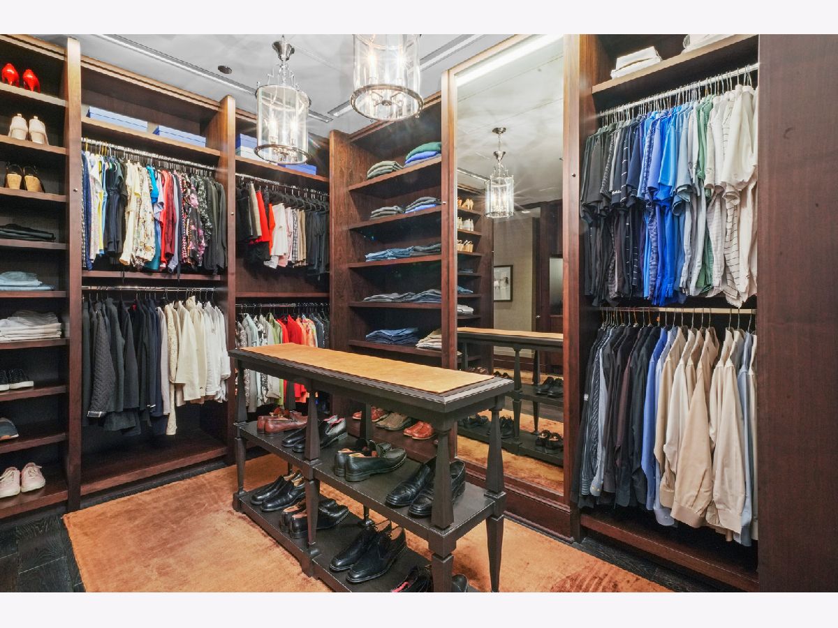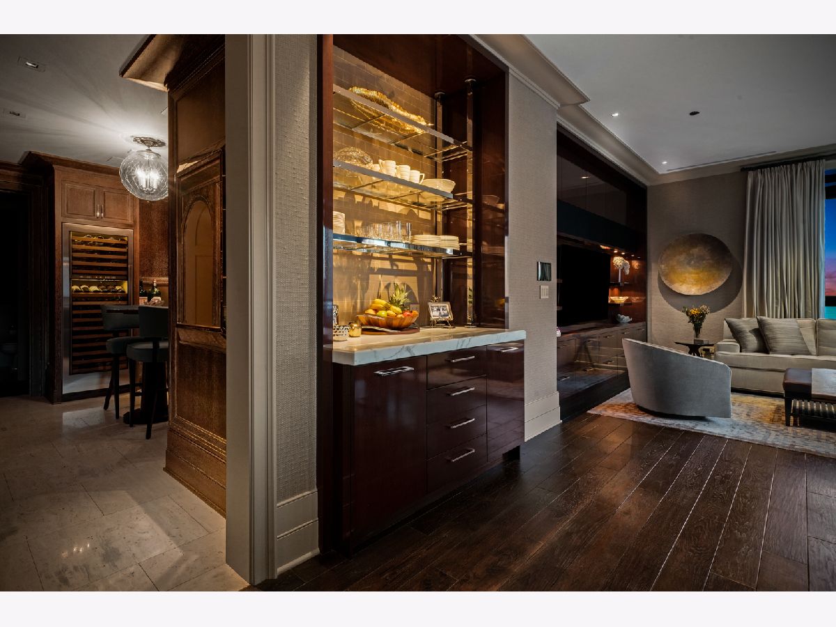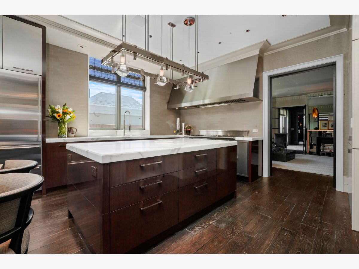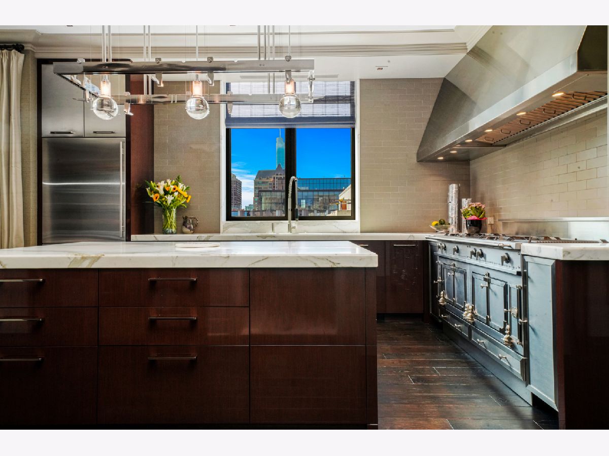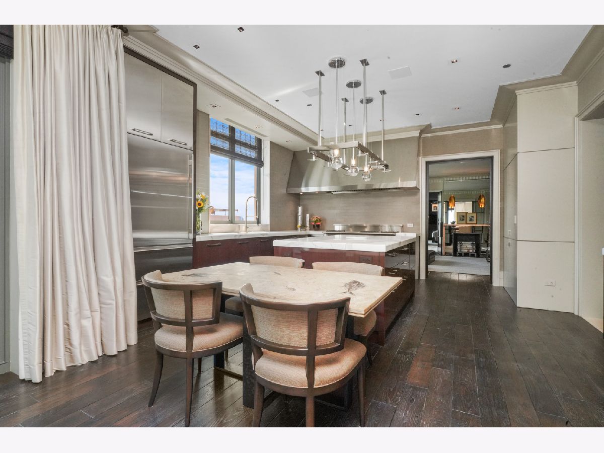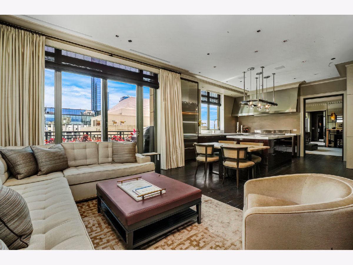 Perched atop the prestigious "10 East" in Chicago's sought-after Gold Coast, this extraordinary custom penthouse defines refined luxury. A dramatic foyer wrapped in rich walnut paneling sets the tone, opening into expansive living and entertaining spaces thoughtfully designed with impeccable craftsmanship throughout. The grand Living Room flows seamlessly into a warm, inviting Family Room and a showstopping chef's kitchen featuring custom Wenge cabinetry, striking 3-inch-thick Calacatta Gold countertops, and world-class appliances including a 60" La Cornue range and Sub-Zero refrigerator/freezer. Designed for both everyday living and elevated entertaining, the layout offers sophistication at every turn. Two oversized private terraces provide sweeping views of the Gold Coast, Chicago skyline, and Lake Michigan-an exceptional backdrop for outdoor dining or quiet mornings above the city. The primary suite is a true sanctuary, entered through a private den or office and enhanced by illuminated custom built-ins and exquisite millwork. A fully organized walk-in closet and a spa-caliber bath with Calacatta Gold stone slabs, heated floors, and a custom William Garvey teak Japanese soaking tub complete the retreat. Additional highlights include a custom wine room, wide-plank hand-scraped hickory flooring, Lutron touchpad lighting system, gas fireplace, and exceptional storage throughout. The residence includes two deeded parking spaces (available at additional cost) and a full-height storage locker. Residents of 10 East enjoy premier amenities including a rooftop pool, state-of-the-art fitness center, and 24-hour door staff-all moments from Michigan Avenue, Rush Street, and the lakefront. This is Gold Coast penthouse living at its finest. Explore the property in 3D-click the 3D tour to experience every detail.