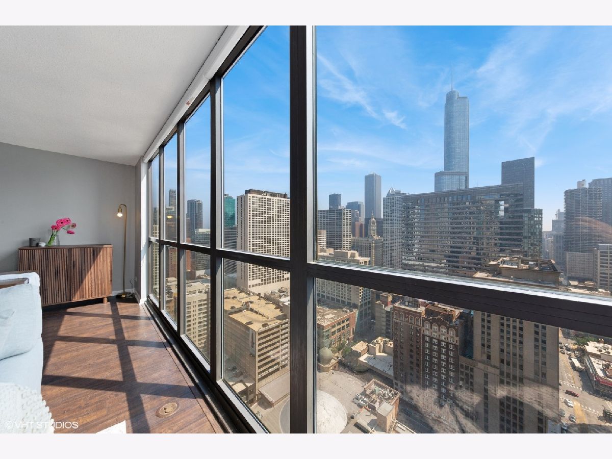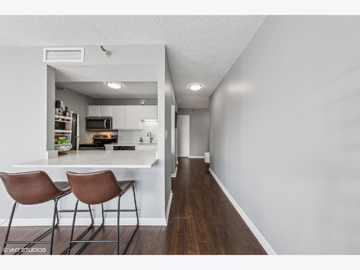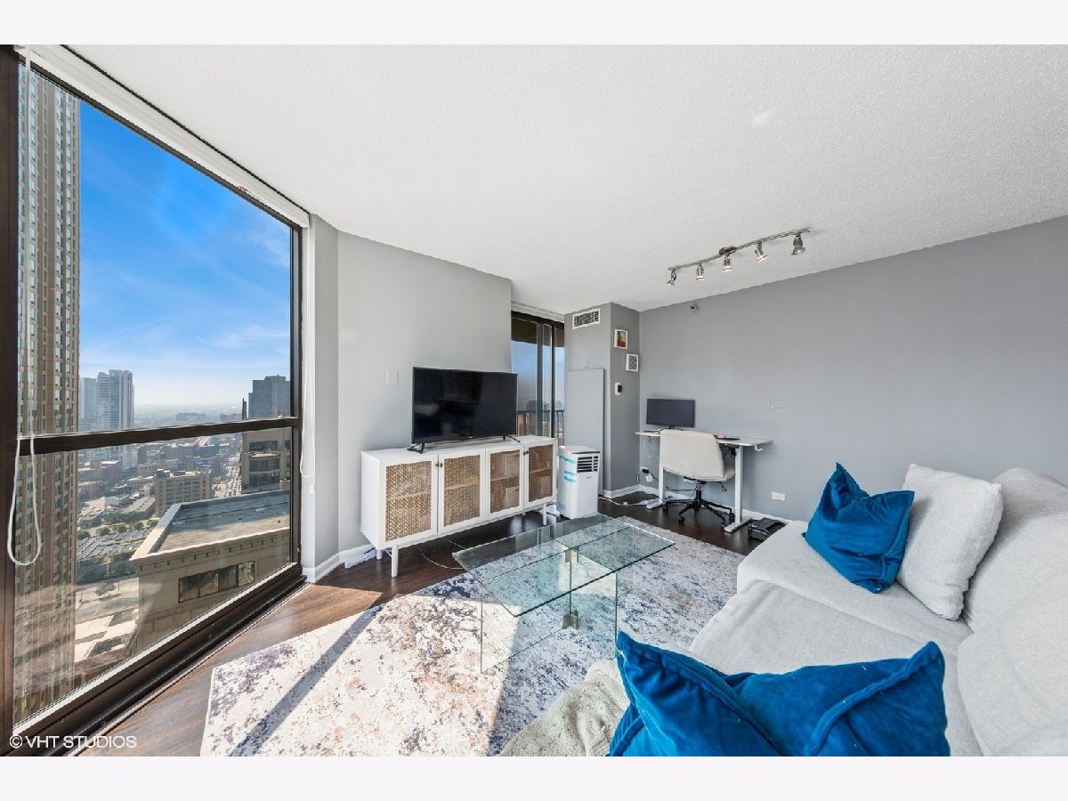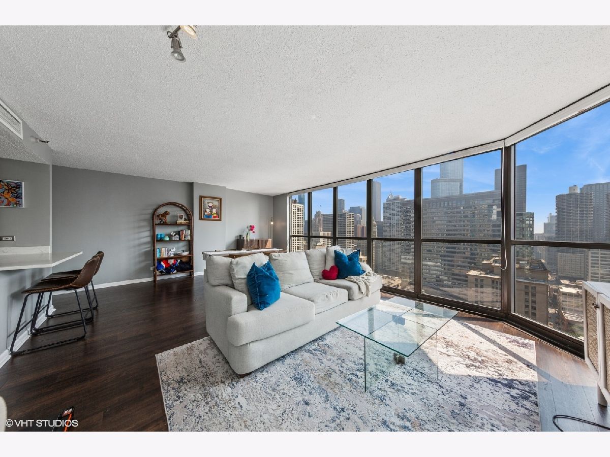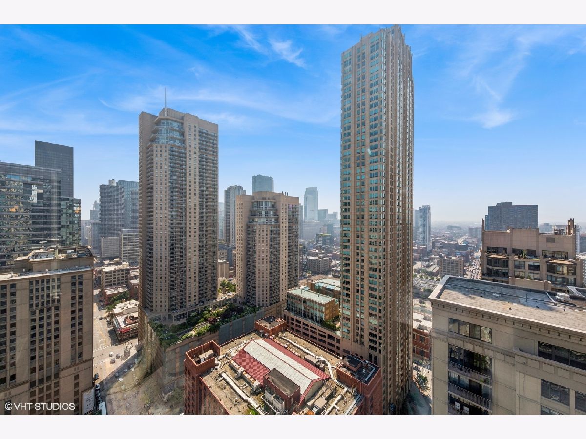 This RARE nearly 1000 square foot "05" tier CORNER unit with large balcony and stunning city views has been beautifully upgraded with lovely Pergot floors throughout, gorgeous white redone kitchen with quartz counters, stainless appliances and cool extended Breakfast bar with extra storage below and perfect for two bar stools... Huge living room with plenty of room for formal dining as well as room for large couch, chairs, entertainment center and more.... Unbeatable location in heart of River North with fabulous pool, park area with grilling stations, huge gym, business center, 7/11 within building, sauna and more! Steps to the best restaurants, clubs and Magnificent Mile shopping... Extra bonus! TraderJoe's is right next door! Can't beat that!!