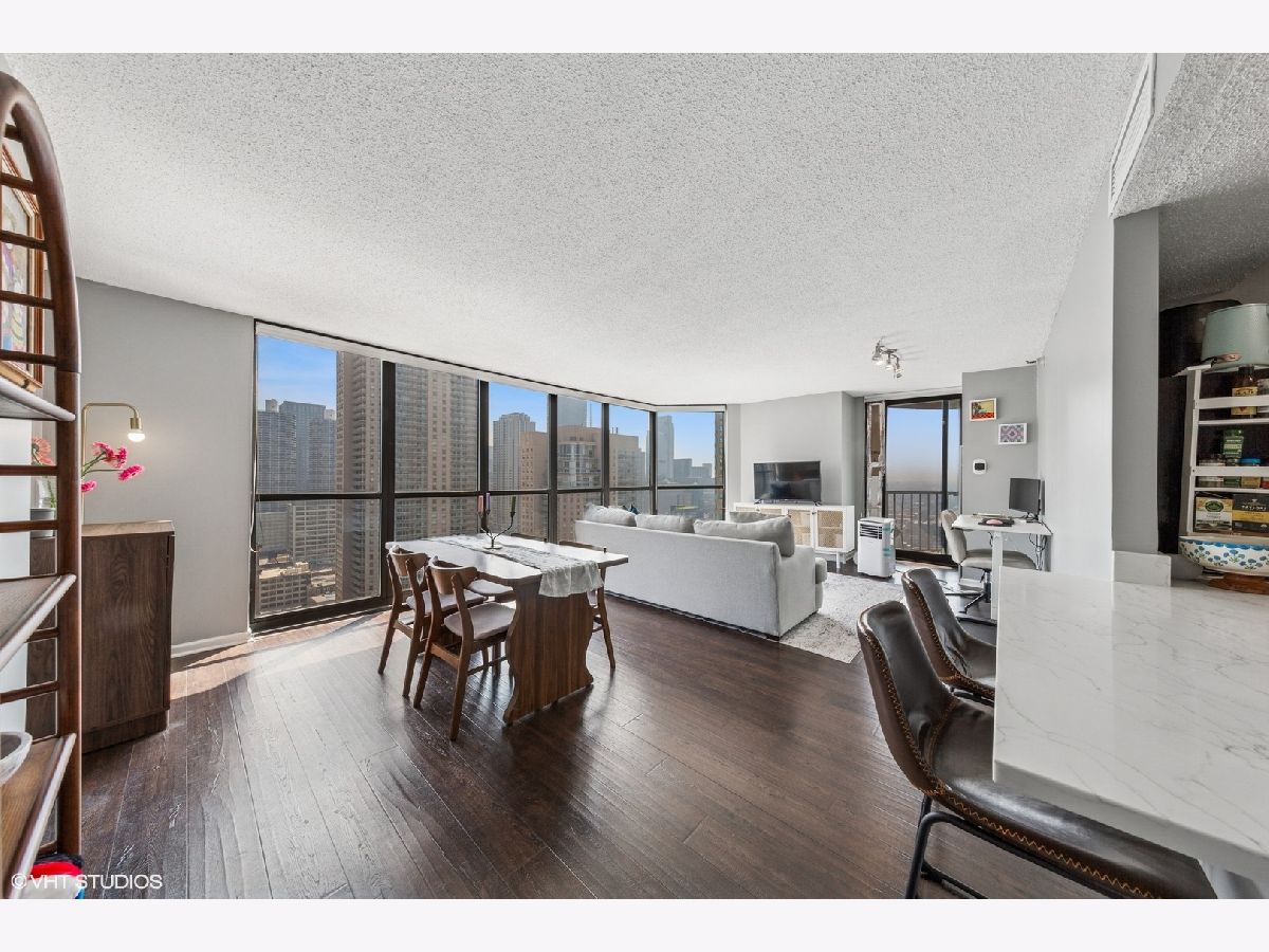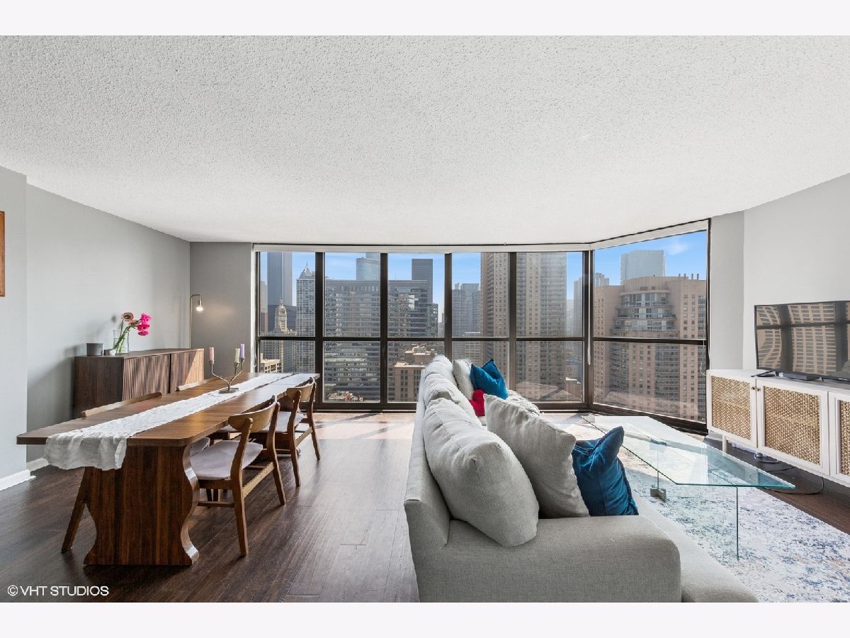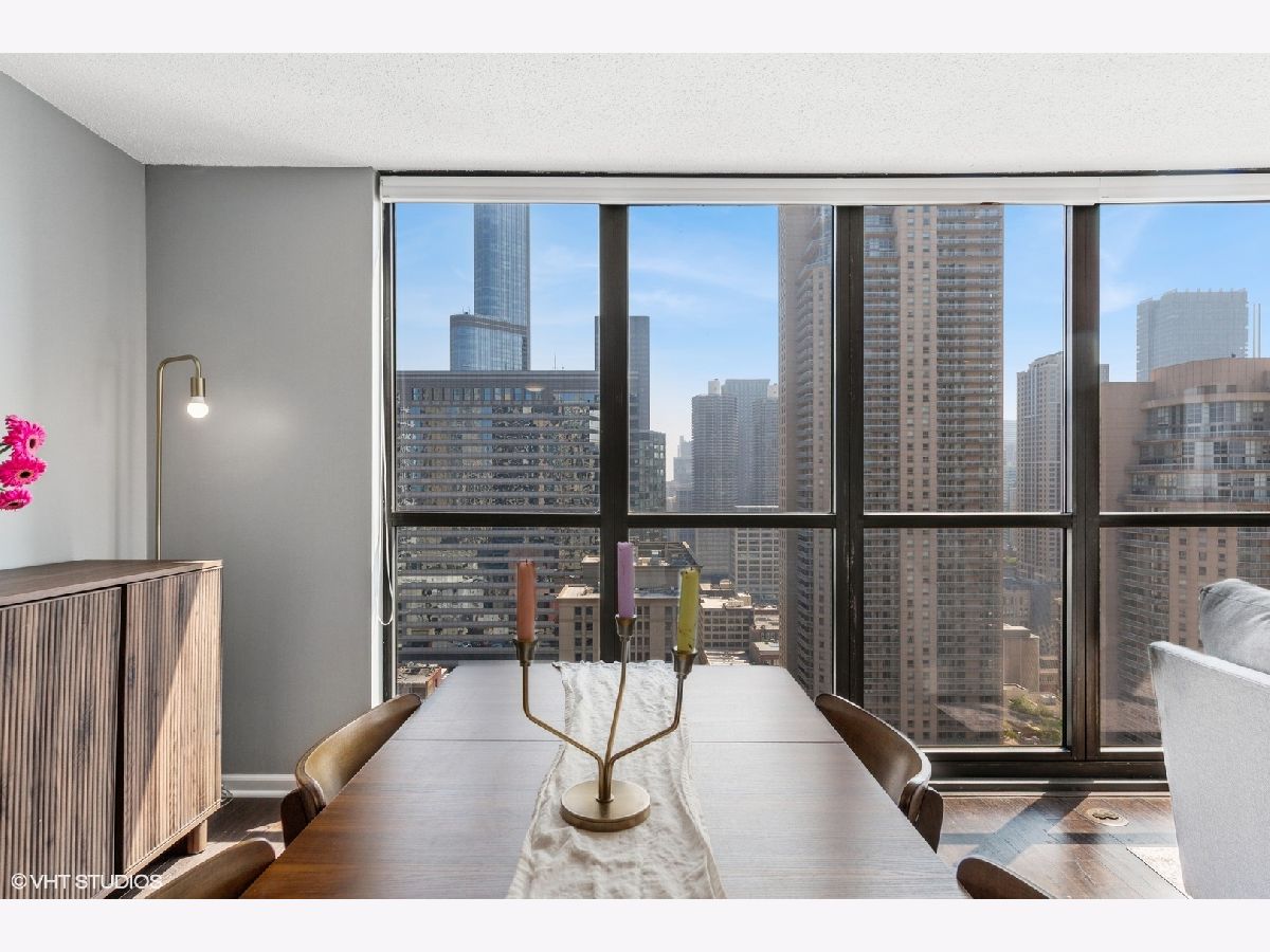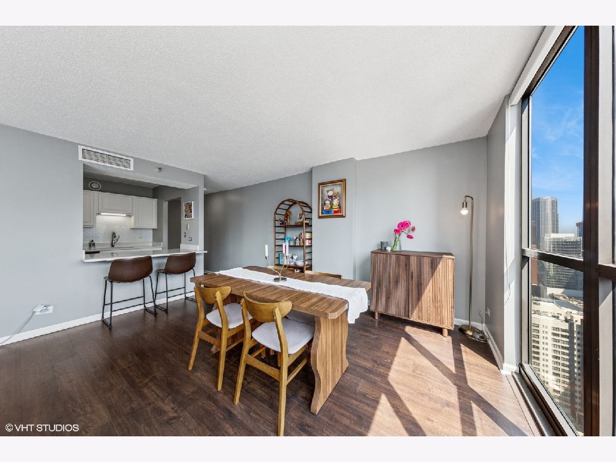 This RARE nearly 1000 square foot "05" tier CORNER unit with large balcony and stunning city views has been beautifully upgraded with lovely Pergot floors throughout, gorgeous white redone kitchen with quartz counters, stainless appliances and cool extended Breakfast bar with extra storage below and perfect for two bar stools... Huge living room with plenty of room for formal dining as well as room for large couch, chairs, entertainment center and more.... Unbeatable location in heart of River North with fabulous pool, park area with grilling stations, huge gym, business center, 7/11 within building, sauna and more! Steps to the best restaurants, clubs and Magnificent Mile shopping... Extra bonus! TraderJoe's is right next door! Can't beat that!!