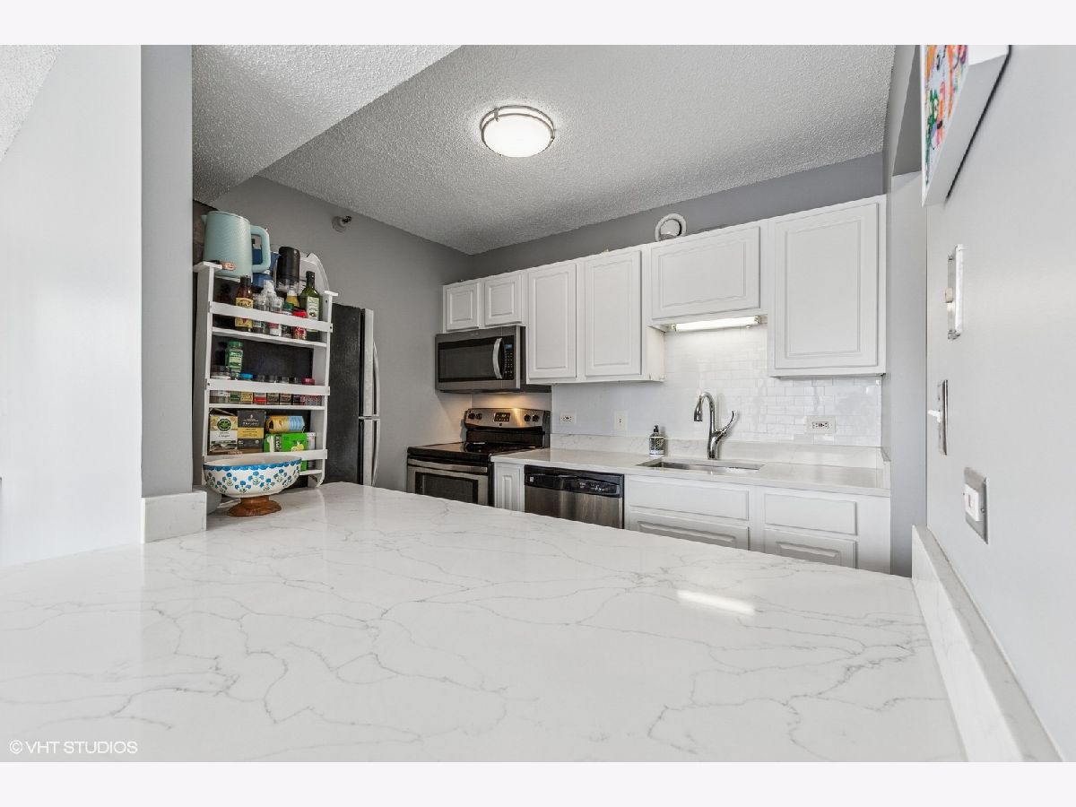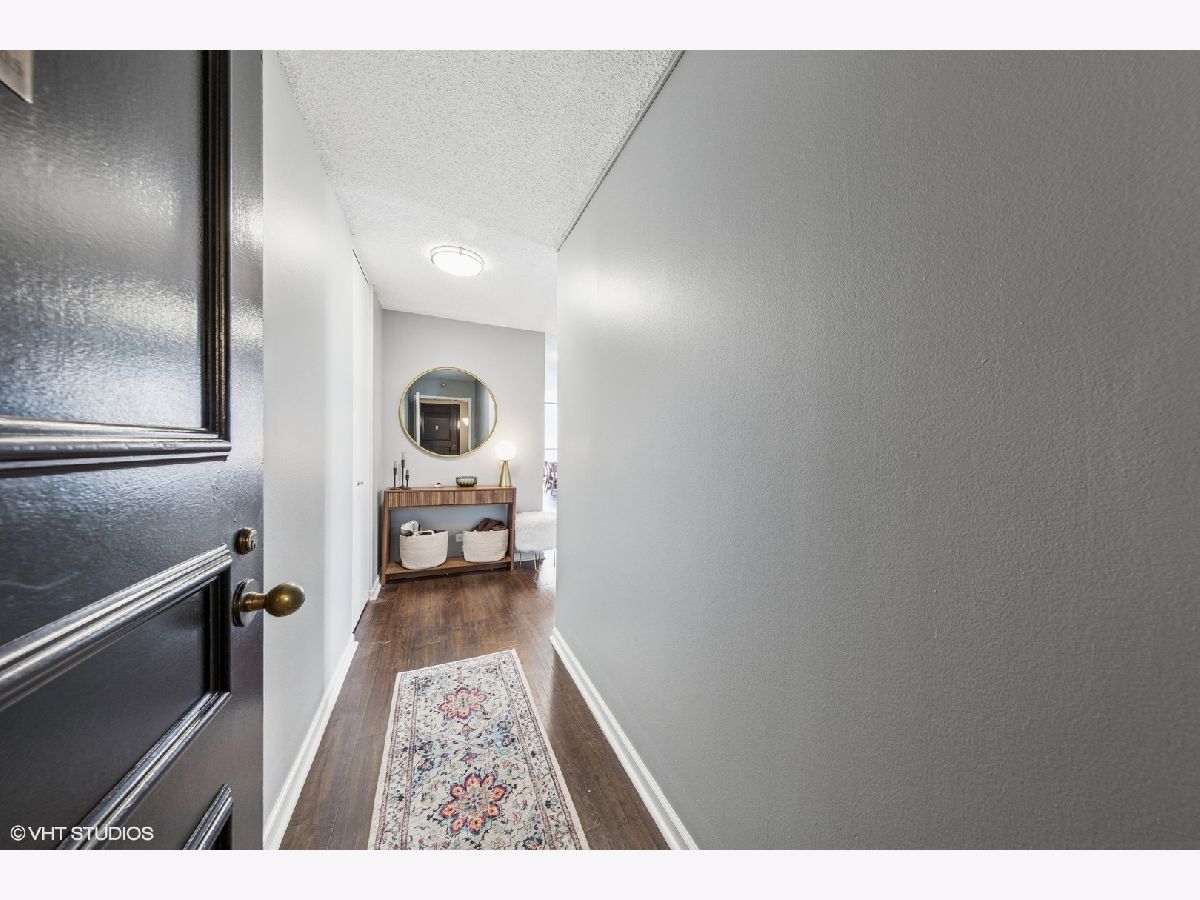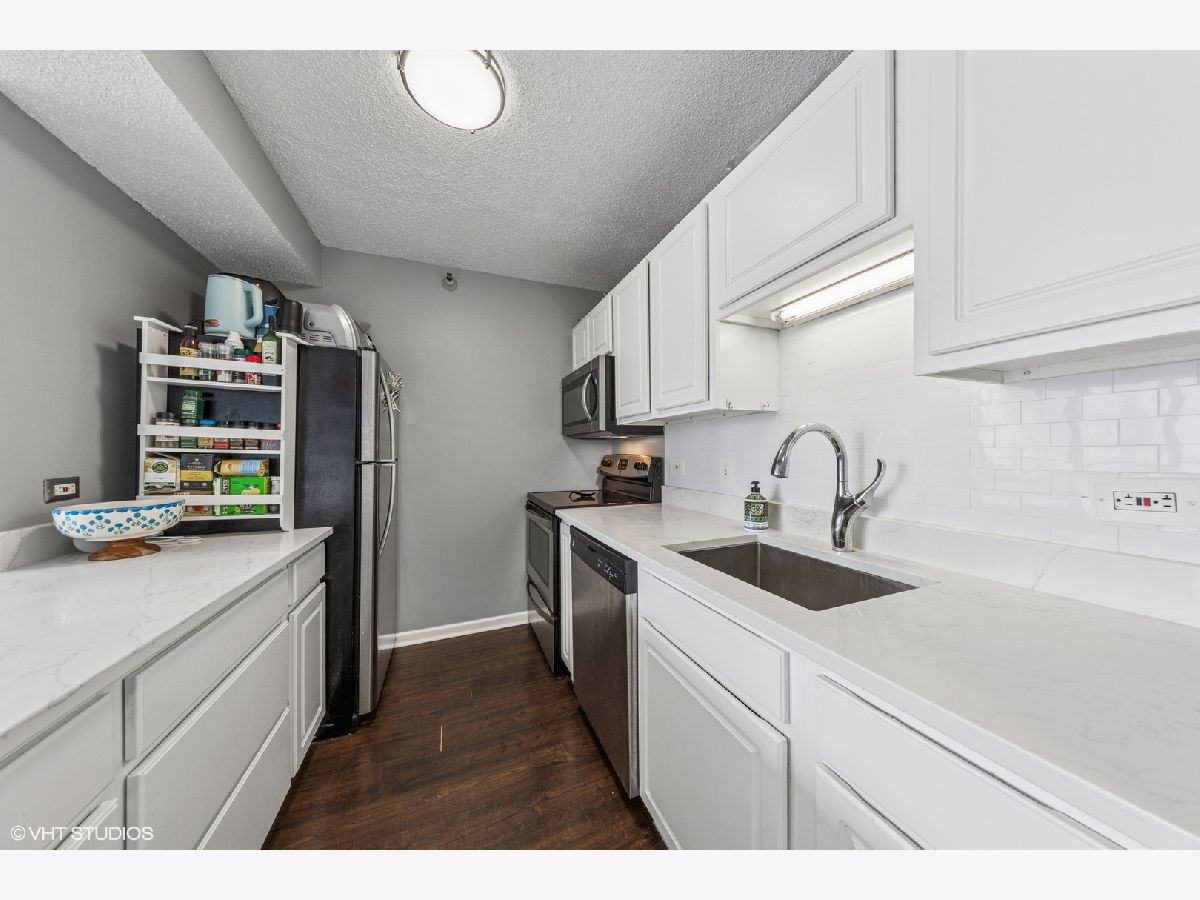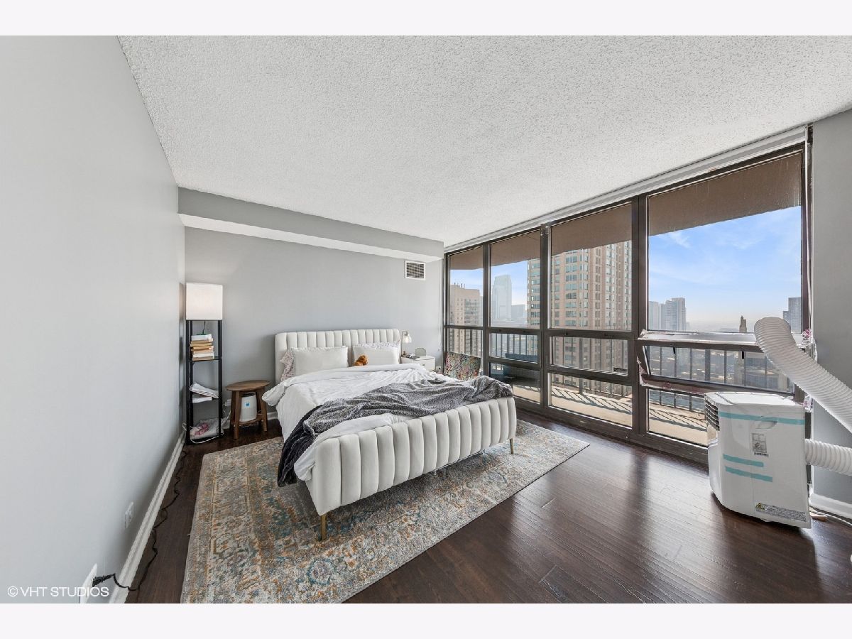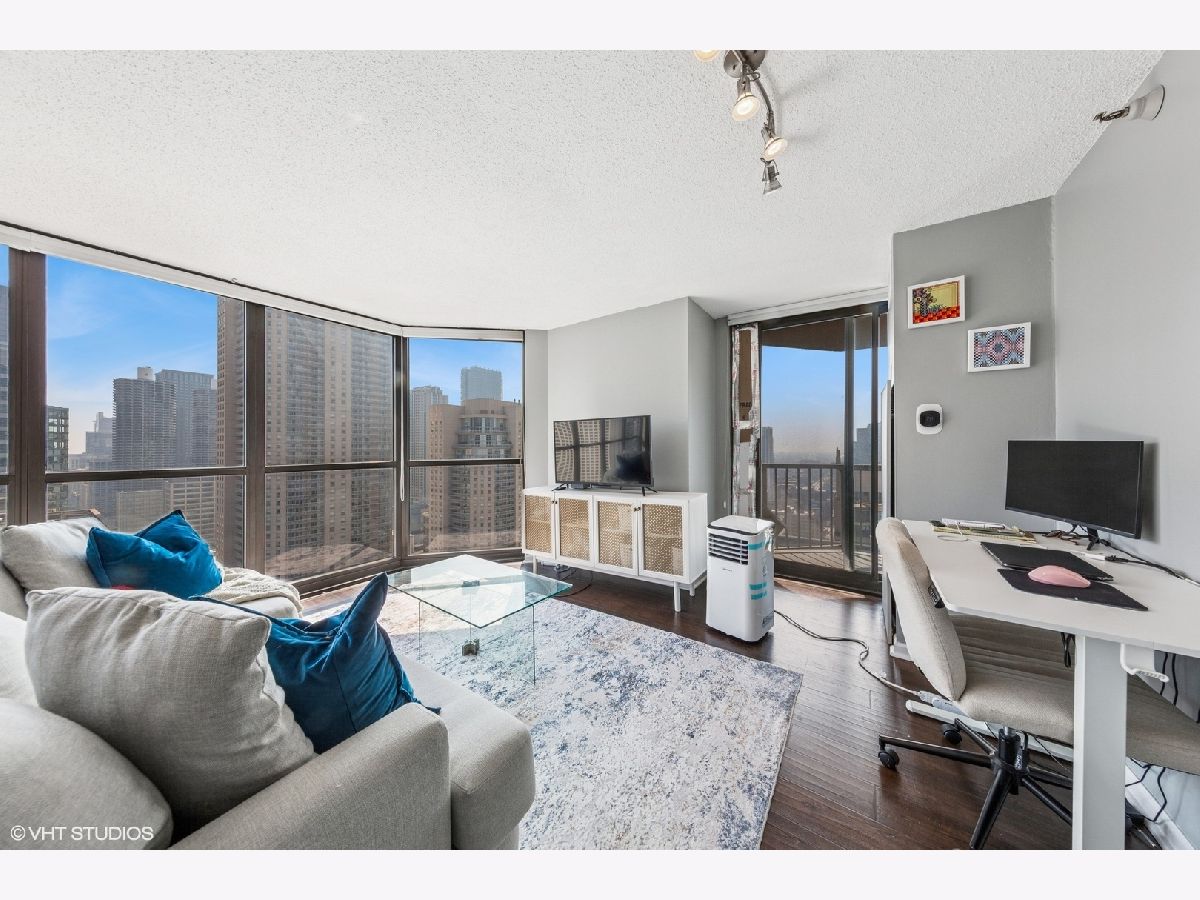 This RARE nearly 1000 square foot "05" tier CORNER unit with large balcony and stunning city views has been beautifully upgraded with lovely Pergot floors throughout, gorgeous white redone kitchen with quartz counters, stainless appliances and cool extended Breakfast bar with extra storage below and perfect for two bar stools... Huge living room with plenty of room for formal dining as well as room for large couch, chairs, entertainment center and more.... Unbeatable location in heart of River North with fabulous pool, park area with grilling stations, huge gym, business center, 7/11 within building, sauna and more! Steps to the best restaurants, clubs and Magnificent Mile shopping... Extra bonus! TraderJoe's is right next door! Can't beat that!!