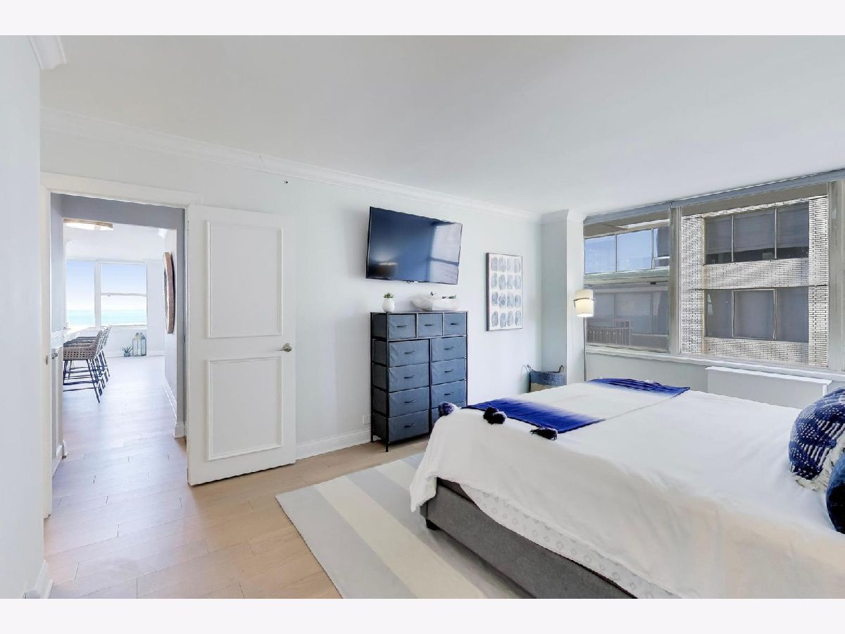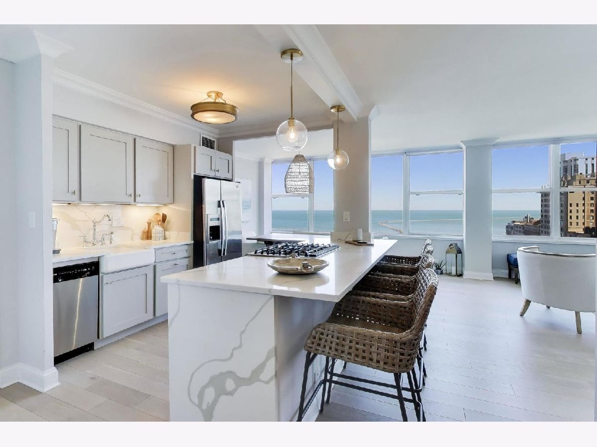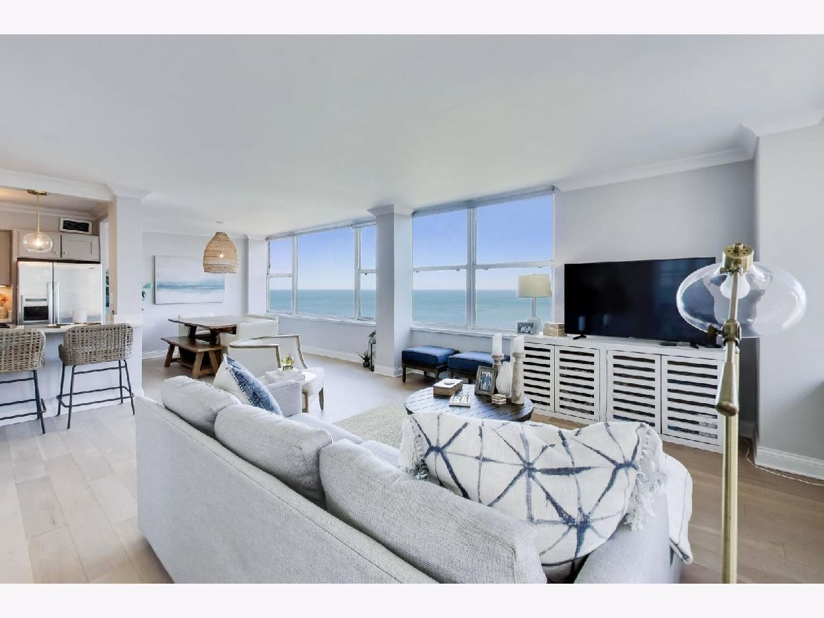 What if your home felt like a never-ending VACATION?! If you LOVE a coastal-chic vibe paired with breathtaking UNOBSTRUCTED vistas of Lake Michigan, Oak Street Beach & Chicago's timeless vintage architecture along east Lake Shore Drive, then this STUNNING southeast CORNER 2 bed / 2 bath residence is THE ONE you've been looking for. ***Completely renovated in 2018/2019, this home offers a wide open, sun-drenched floor plan designed to showcase the views from every angle.***The kitchen is striking AND functional, featuring QUARTZ waterfall countertops, a generous island, refreshed cabinetry with updated hardware & stainless steel appliances. ***A dedicated dining area easily accommodates a large table, all set against a postcard worthy backdrop of the lake & skyline.***Beautiful WIDE-PLANK wood floors & motorized blinds in every room, new chic lighting throughout & thoughtfully customized closets.*** Both bathrooms were FULLY GUTTED to the studs & rebuilt with NEW plumbing, elegant tile flooring, beautifully tiled shower surround, custom glass enclosures & elevated fixtures. ***Step onto your PRIVATE BALCONY and take in even more sweeping lake & city vistas. Start your day with a sunrise over Lake Michigan & wind down with evening cocktails as the city lights shimmer all around you.***Once warm weather officially arrives, get ready to soak up the sunshine, grill, chill and catch the air & water show from the fabulous COMMON ROOF TOP DECK. ***Well-run building has wonderful 24 hour door staff, convenient on-site valet parking, dry-cleaner/receiving room, extra storage cage and bike room.*** The building allows in-unit washer/dryer with HOA approval, although there is common laundry room in the building. ***PET friendly with restrictions. ***Come live your BEST LIFE at this iconic Gold Coast location where lakefront tranquility meets Chicago's most coveted dining, shopping & nightlife.***Outdoor enthusiasts will adore the 5 minute walk to the lakefront path/beach, enjoy sunrise yoga, cruise up to the tennis courts or play 9 holes at Waveland. Stroll along the harbors & admire the beautiful yachts *** It's impossible to overstate how truly AMAZING it is to live in this incredible LAKEFRONT location. QUIET when you want it. ELECTRIC when you don't! ***You'll love taking advantage of the city's finest culinary delights, cultural institutions, everyday amenities & buzzy new hotspots. Don't miss this RARE OPPORTUNITY. Views like this are not replicated. They are secured. This beautiful home is ready & waiting for lucky new owners! ( NOTE: Available FULLY FURNISHED)