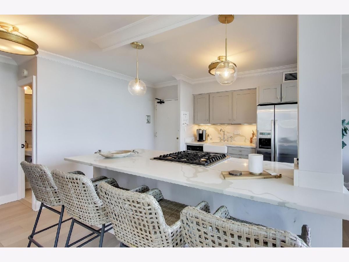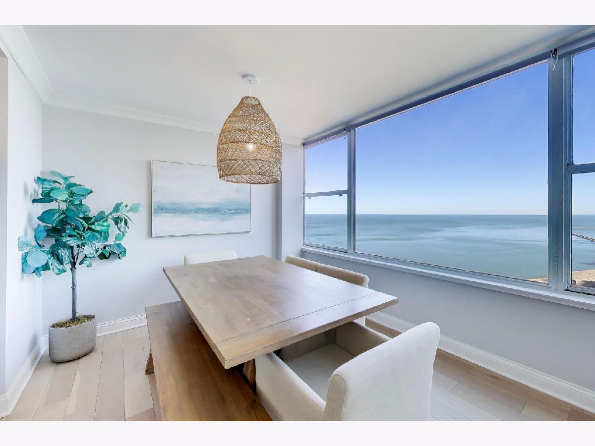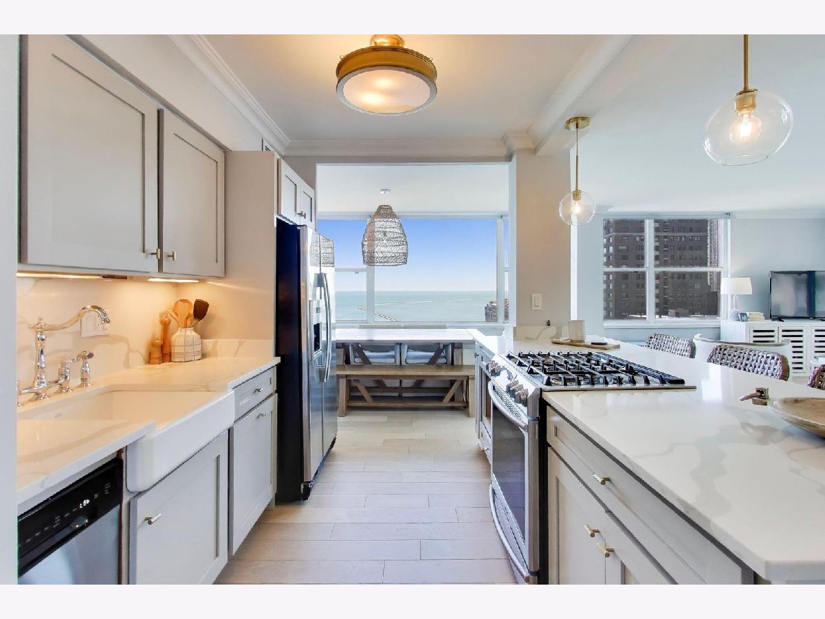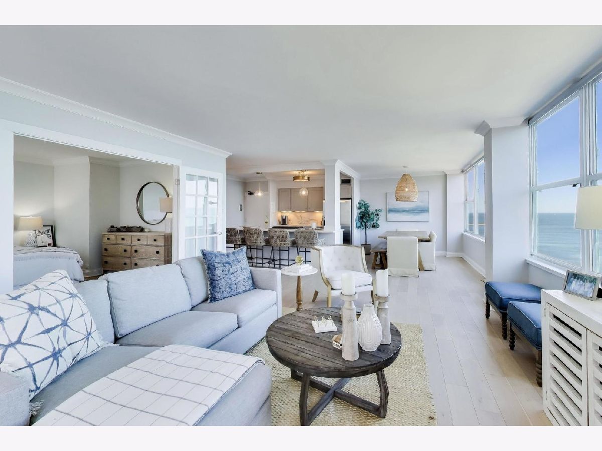 What if your home felt like a never-ending VACATION?! If you LOVE a coastal-chic vibe paired with breathtaking UNOBSTRUCTED vistas of Lake Michigan, Oak Street Beach & Chicago's timeless vintage architecture along east Lake Shore Drive, then this STUNNING southeast CORNER 2 bed / 2 bath residence is THE ONE you've been looking for. ***Completely renovated in 2018/2019, this home offers a wide open, sun-drenched floor plan designed to showcase the views from every angle.***The kitchen is striking AND functional, featuring QUARTZ waterfall countertops, a generous island, refreshed cabinetry with updated hardware & stainless steel appliances. ***A dedicated dining area easily accommodates a large table, all set against a postcard worthy backdrop of the lake & skyline.***Beautiful WIDE-PLANK wood floors & motorized blinds in every room, new chic lighting throughout & thoughtfully customized closets.*** Both bathrooms were FULLY GUTTED to the studs & rebuilt with NEW plumbing, elegant tile flooring, beautifully tiled shower surround, custom glass enclosures & elevated fixtures. ***Step onto your PRIVATE BALCONY and take in even more sweeping lake & city vistas. Start your day with a sunrise over Lake Michigan & wind down with evening cocktails as the city lights shimmer all around you.***Once warm weather officially arrives, get ready to soak up the sunshine, grill, chill and catch the air & water show from the fabulous COMMON ROOF TOP DECK. ***Well-run building has wonderful 24 hour door staff, convenient on-site valet parking, dry-cleaner/receiving room, extra storage cage and bike room.*** The building allows in-unit washer/dryer with HOA approval, although there is common laundry room in the building. ***PET friendly with restrictions. ***Come live your BEST LIFE at this iconic Gold Coast location where lakefront tranquility meets Chicago's most coveted dining, shopping & nightlife.***Outdoor enthusiasts will adore the 5 minute walk to the lakefront path/beach, enjoy sunrise yoga, cruise up to the tennis courts or play 9 holes at Waveland. Stroll along the harbors & admire the beautiful yachts *** It's impossible to overstate how truly AMAZING it is to live in this incredible LAKEFRONT location. QUIET when you want it. ELECTRIC when you don't! ***You'll love taking advantage of the city's finest culinary delights, cultural institutions, everyday amenities & buzzy new hotspots. Don't miss this RARE OPPORTUNITY. Views like this are not replicated. They are secured. This beautiful home is ready & waiting for lucky new owners! ( NOTE: Available FULLY FURNISHED)
