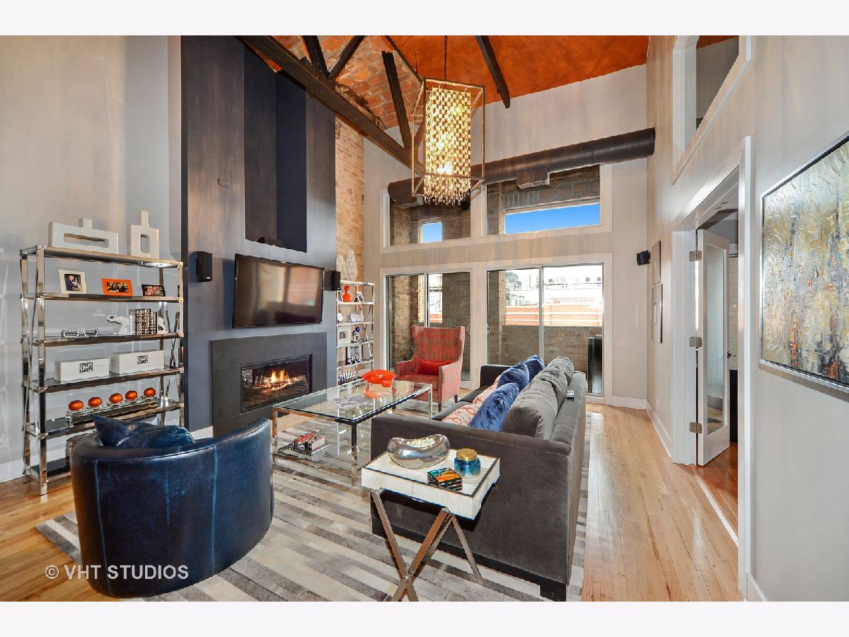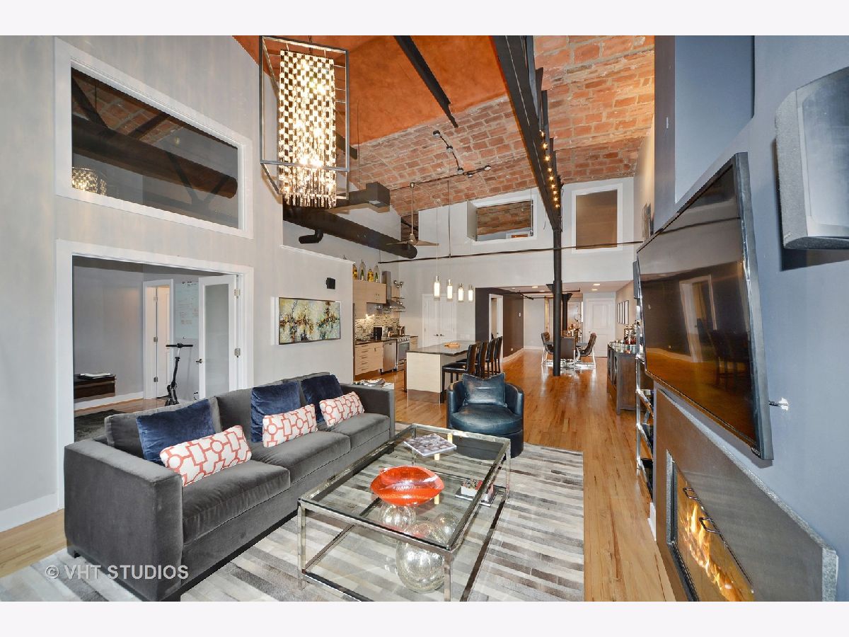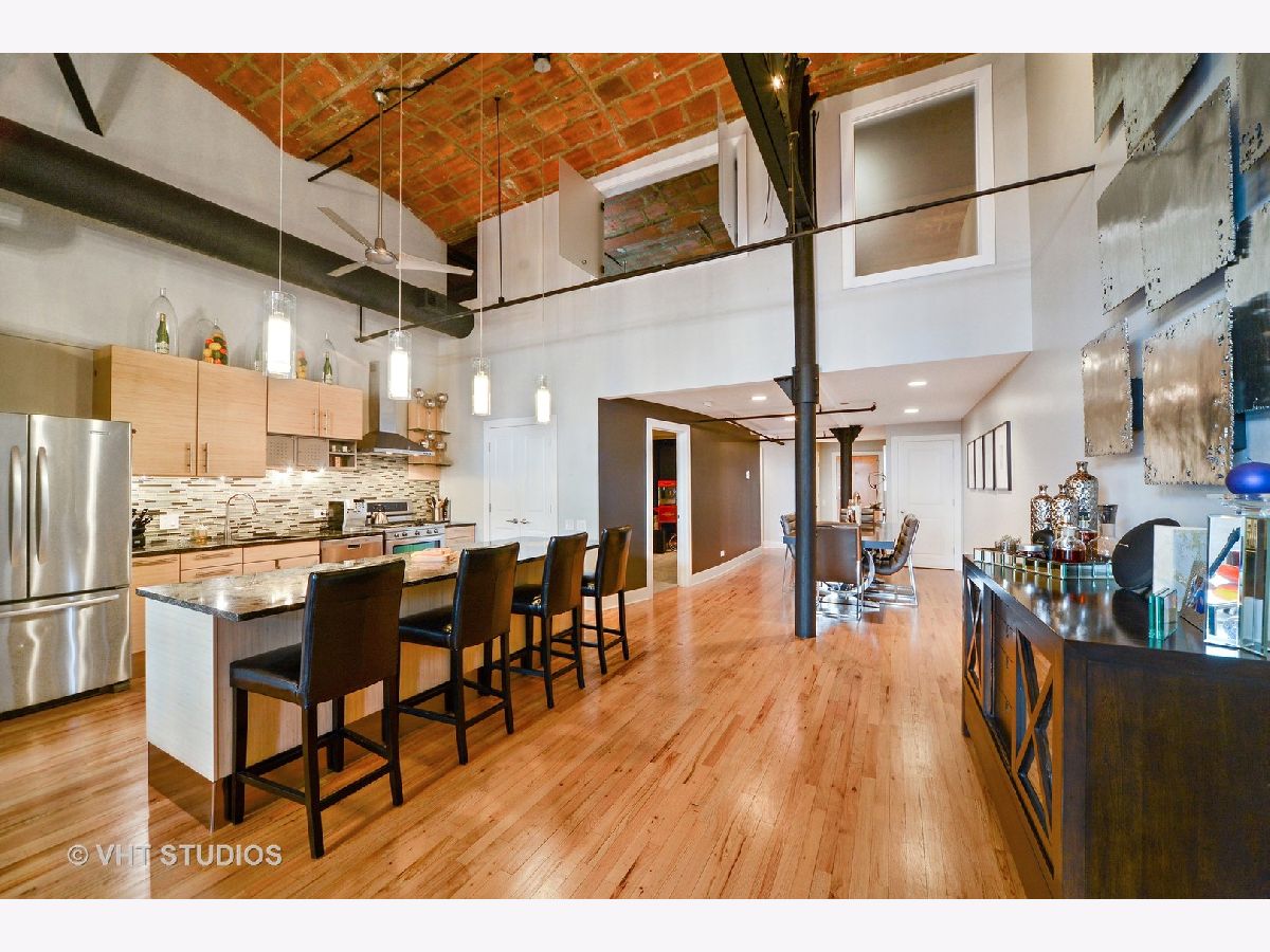 One of a kind, Sky penthouse with fully intact and restored exposed terra cotta tiled ceiling throughout in this 1910 originally built former Nabisco baking plant. Exposed 20' ceiling height, incredible open living, dining and kitchen space with gracious foyer, all real oak hardwood ("tongue and groove") floors through this Residence. Exposed brick, brick and concrete 27' wide terrace which spans the width of the unit accessible from the family room and second bedroom suite. Exposed steel girder and support columns. Central kitchen with large island, 1.25" rare, straight edge granite counters, Built-in cabinetry Panasonic microwave, Kitchen Aid appliance package including French door fridge, dishwasher, 5-burner range and culinary hood. Built-in pantry. Wide stainless steel baseboard around custom contemporary cabinetry. Separate dining, living and family room areas. Gas ventless fireplace. First floor featuring two fully enclosed bedrooms, second with ensuite bathroom with mitered straight edge myriad grey granite stone, rectangular, ivory undercount sinks, wall hung mirrors, contemporary lighting, and wall plumbing fixtures. Dressed in stone, shower and soaking tub with air jets combination. Built-in surround sound speakers. Second first floor full bathroom room with adjacent linen closet, also functions as convenient powder room for guests, dressed in Italian porcelain, elegantly designed wallpaper, frameless glass, rain shower, stand alone furniture piece vanity. Sumptuous primary suite on second level with terra cotta tile ceilings, all wood riser stairs, enormous floor space easily accommodates a California King, two large nightstands, large bureau, highboy and sideboard for additional folded clothing storage. Amazing bathroom with built-out walk in closet, additional walk-in storage for overflow and toiletries and supplies. Rectangular cut marble flooring, dual vanity with mitered edge stone counter, rectangular, ivory under mount sinks, heated floors, shower with bench, steam, rain shower, floor to ceiling stone, hexagon stone shower basin. Deeded, heated parking within the same building, PD-52, available for $25,000. 1000 West is in the heart of the West Loop and steps to all of its splendor of restaurants, retail, shopping, grocery, nightlife, etc. Residence 517 will not disappoint.