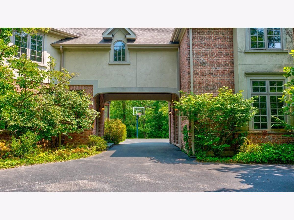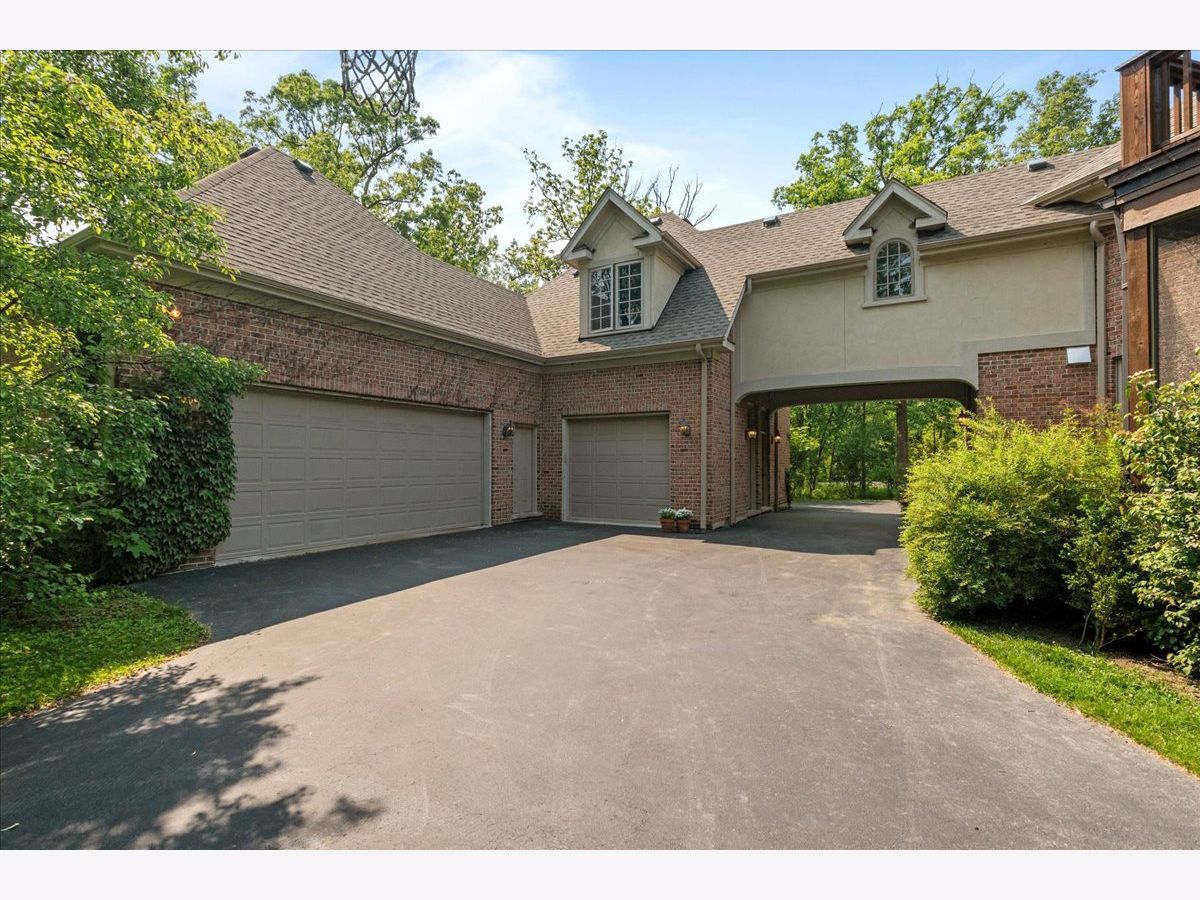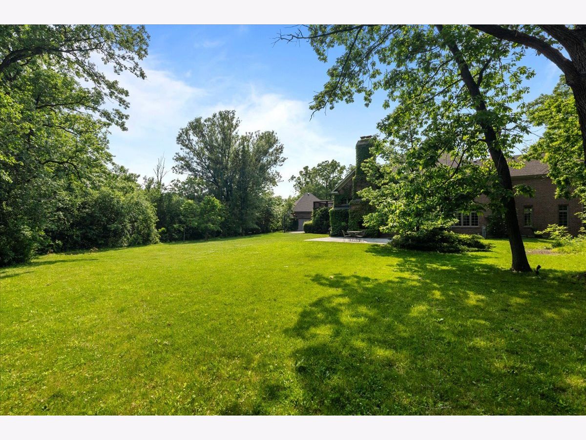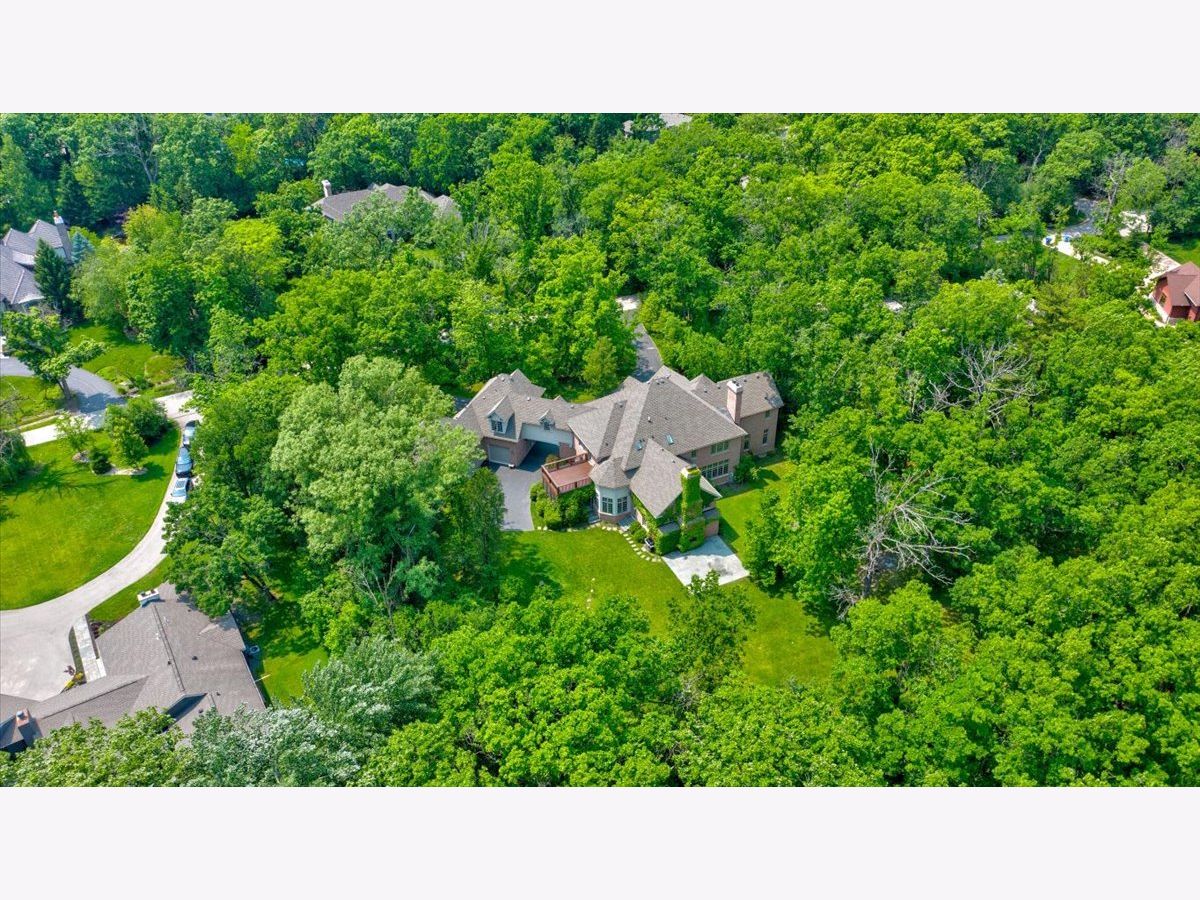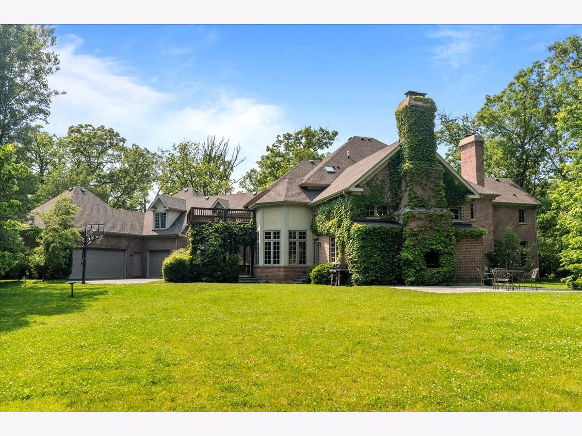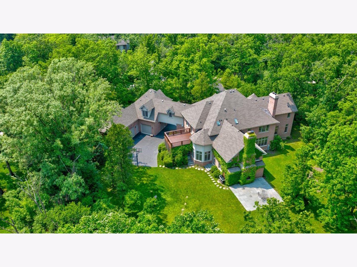Fabulous opportunity to own this custom-built 5-bedroom, 4 full and 2 half bath home in Riverwoods, perfectly situated on over an acre of private, wooded land surrounded by nature and wildlife. With charming curb appeal, the home features a striking brick exterior, turret and porte-cochere. Designed with elegance and functionality in mind, this residence boasts high-end finishes, soaring ceilings and expansive windows that fill the home with natural light. The grand center-entry foyer with double height ceiling opens to a beautifully appointed dining room with a wall of windows overlooking the front yard and access to a butler's pantry. The spacious living room with a wood-burning fireplace provides serene views of the pristine backyard, while the inviting great room impresses with faux wood-beamed vaulted ceilings, built-ins, a stone fireplace, transom windows and a door leading out to the bluestone patio and lush yard. The open-concept kitchen is a chef's dream, featuring wood cabinetry, granite countertops, high-end stainless steel appliances, custom backsplash, an expansive island with seating and a sunlit breakfast area with oversized windows. The adjacent screened-in porch with wood paneling is the perfect spot to unwind and enjoy the surrounding landscape. A large sunlit home office with French doors plus a mudroom with built-in storage, a half bath, laundry room and access to the oversized 2-car garage enhance the functionality of the main level. A bonus room next to the garage offers ideal space for an art studio, gym or second office. The second floor features a bridal staircase that leads to a generous landing overlooking the foyer. The luxurious primary suite features a tray ceiling, professionally organized walk-in closet and a spa-like bath with a marble-topped double vanity, Kohler soaking tub, oversized shower and private commode room. Four additional spacious bedrooms with walk-in closets, 2 with en-suite baths and the other 2 share a Jack and Jill bath. A large bonus room is perfect for a kids' lounge or study area. Access to a private deck that overlooks yard is the ideal place to relax. A second laundry room completes the upper level. Unfinished lower level has endless possibilities with over 3,400 sq ft of additional space, including roughed-in plumbing for a bathroom. The beautifully landscaped yard with mature trees, bluestone patio with an outdoor fireplace, and total privacy offers a tranquil outdoor oasis. Additional highlights include hardwood floors throughout most of the home, abundant storage and a new roof (2023). This meticulously maintained and thoughtfully designed home is move-in ready. A rare gem!