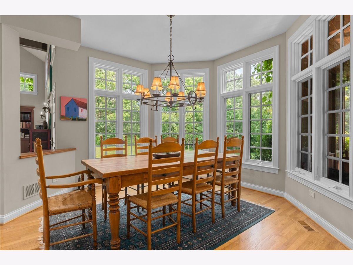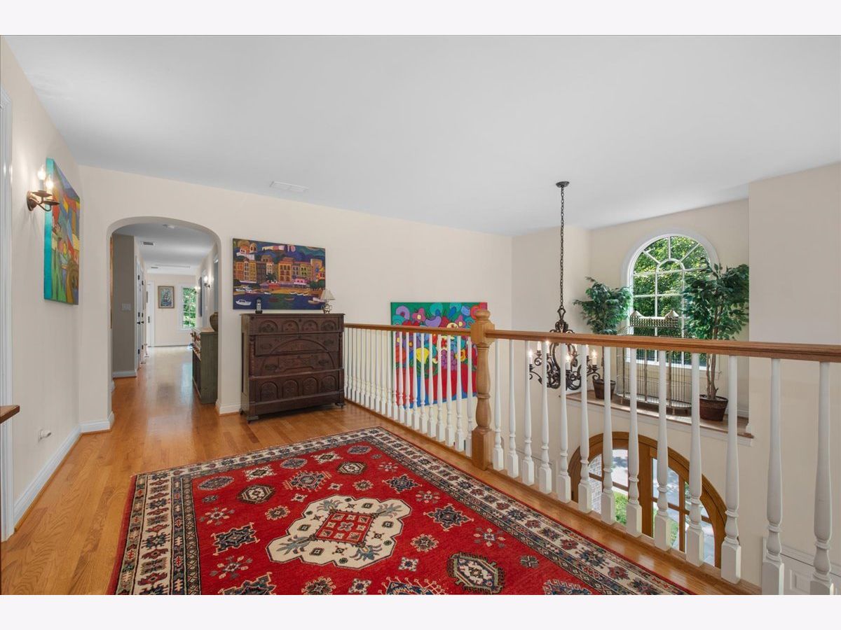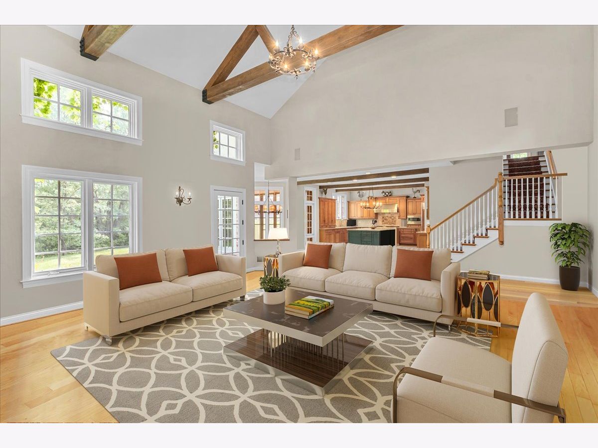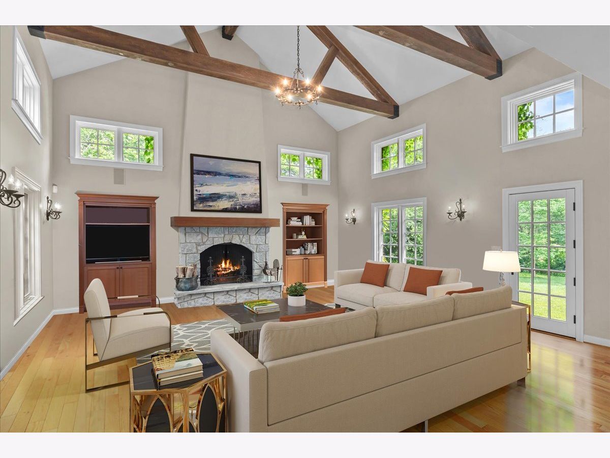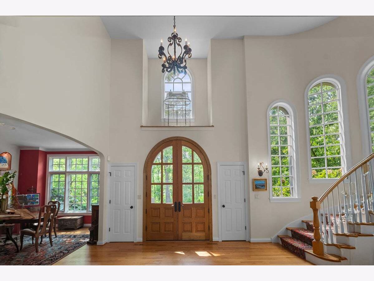Fabulous opportunity to own this custom-built 5-bedroom, 4 full and 2 half bath home in Riverwoods, perfectly situated on over an acre of private, wooded land surrounded by nature and wildlife. With charming curb appeal, the home features a striking brick exterior, turret and porte-cochere. Designed with elegance and functionality in mind, this residence boasts high-end finishes, soaring ceilings and expansive windows that fill the home with natural light. The grand center-entry foyer with double height ceiling opens to a beautifully appointed dining room with a wall of windows overlooking the front yard and access to a butler's pantry. The spacious living room with a wood-burning fireplace provides serene views of the pristine backyard, while the inviting great room impresses with faux wood-beamed vaulted ceilings, built-ins, a stone fireplace, transom windows and a door leading out to the bluestone patio and lush yard. The open-concept kitchen is a chef's dream, featuring wood cabinetry, granite countertops, high-end stainless steel appliances, custom backsplash, an expansive island with seating and a sunlit breakfast area with oversized windows. The adjacent screened-in porch with wood paneling is the perfect spot to unwind and enjoy the surrounding landscape. A large sunlit home office with French doors plus a mudroom with built-in storage, a half bath, laundry room and access to the oversized 2-car garage enhance the functionality of the main level. A bonus room next to the garage offers ideal space for an art studio, gym or second office. The second floor features a bridal staircase that leads to a generous landing overlooking the foyer. The luxurious primary suite features a tray ceiling, professionally organized walk-in closet and a spa-like bath with a marble-topped double vanity, Kohler soaking tub, oversized shower and private commode room. Four additional spacious bedrooms with walk-in closets, 2 with en-suite baths and the other 2 share a Jack and Jill bath. A large bonus room is perfect for a kids' lounge or study area. Access to a private deck that overlooks yard is the ideal place to relax. A second laundry room completes the upper level. Unfinished lower level has endless possibilities with over 3,400 sq ft of additional space, including roughed-in plumbing for a bathroom. The beautifully landscaped yard with mature trees, bluestone patio with an outdoor fireplace, and total privacy offers a tranquil outdoor oasis. Additional highlights include hardwood floors throughout most of the home, abundant storage and a new roof (2023). This meticulously maintained and thoughtfully designed home is move-in ready. A rare gem!