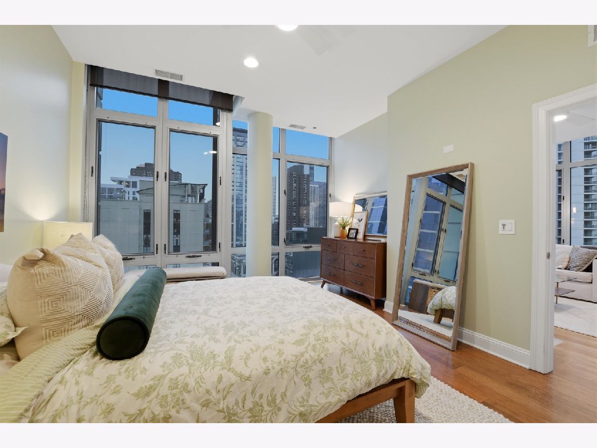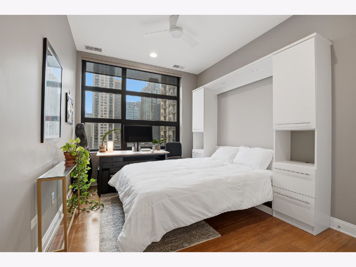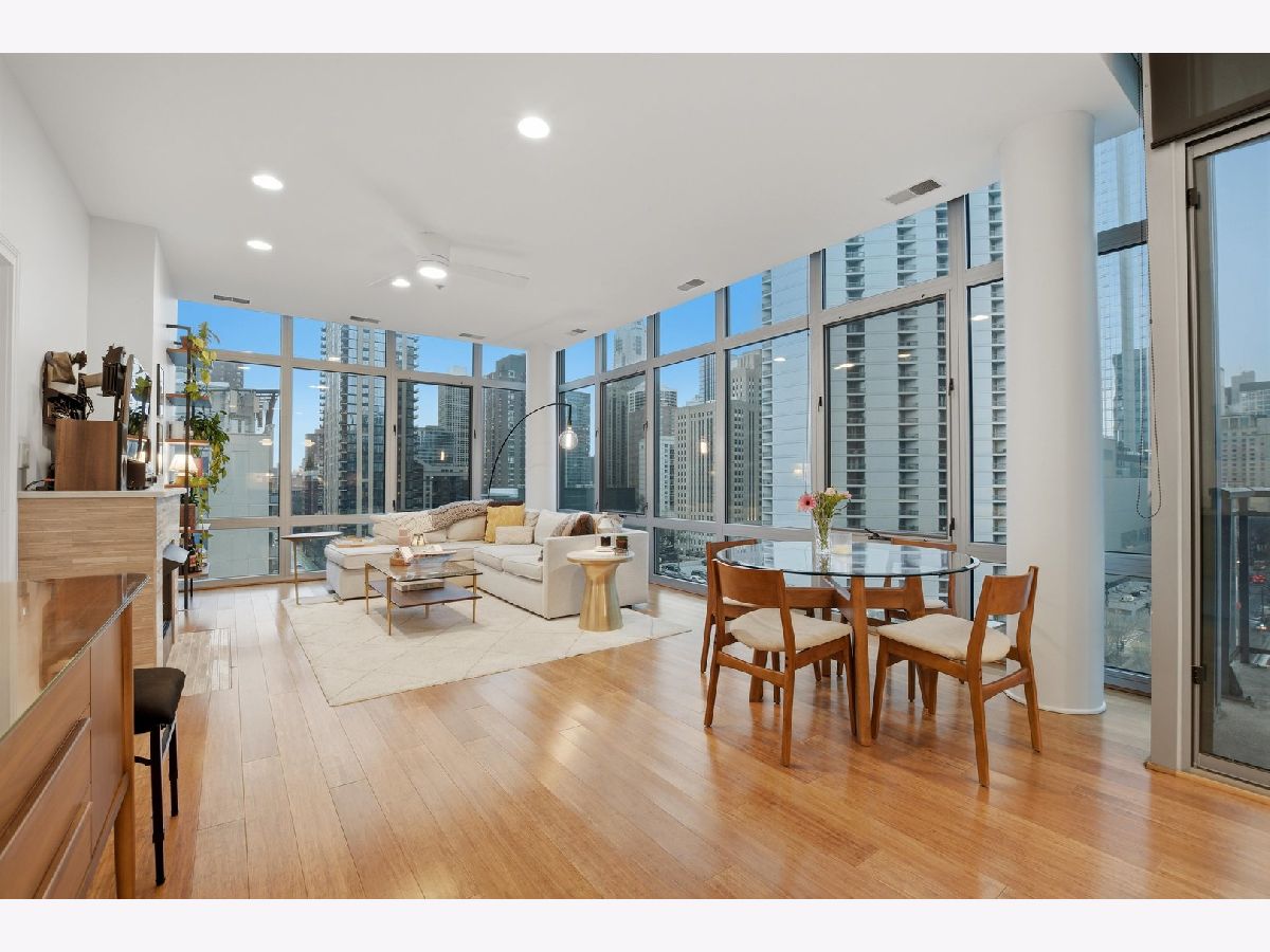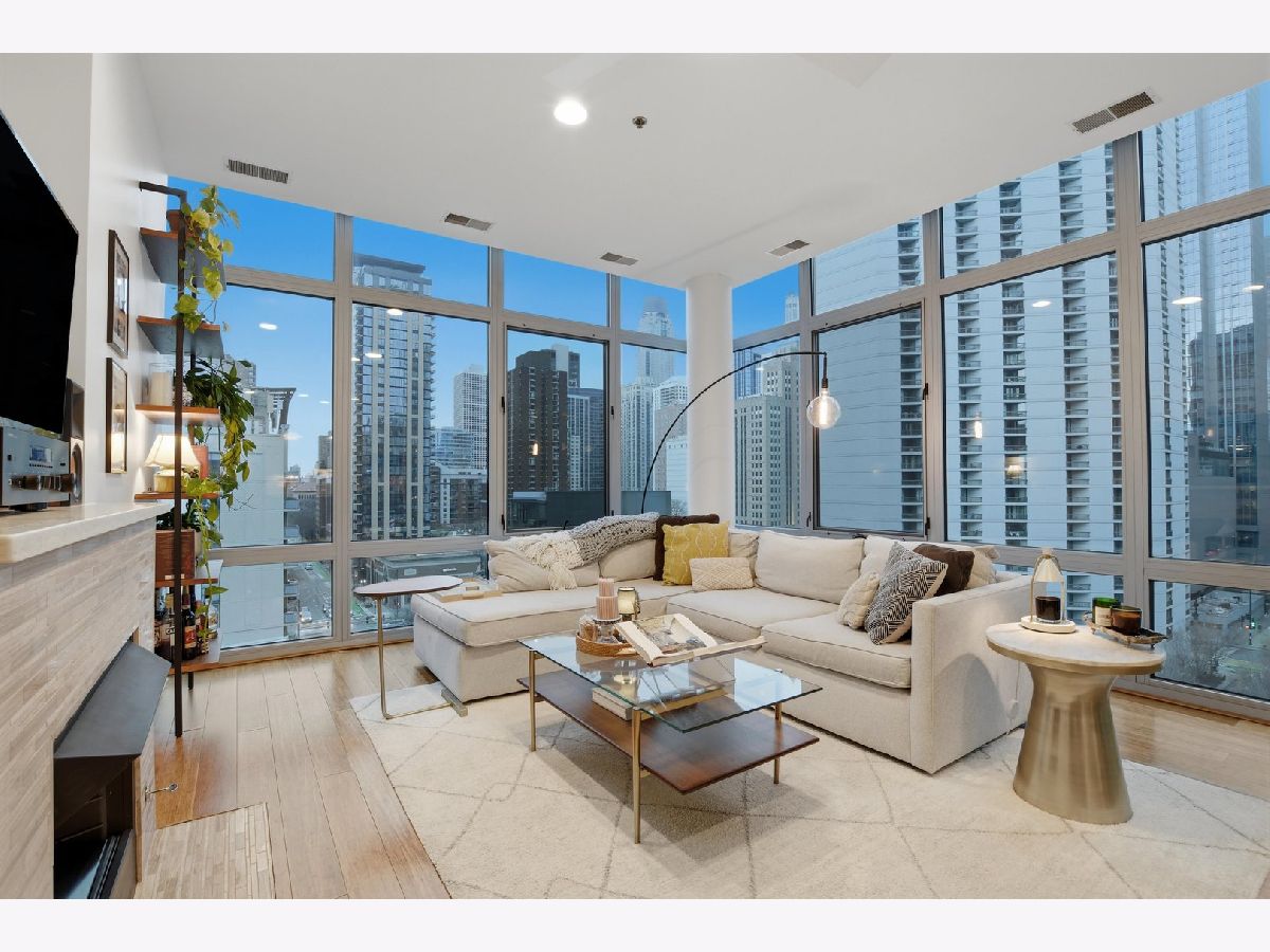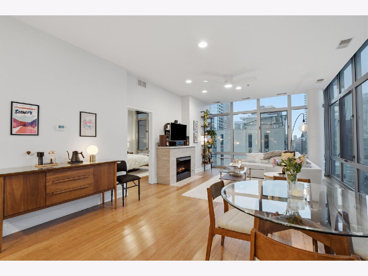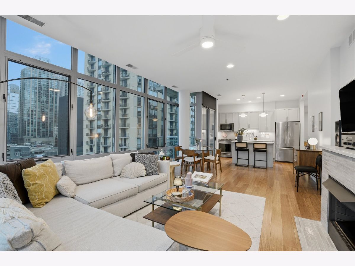 Experience refined city living in this beautifully updated corner residence in the coveted '04 tier of a boutique River North building. This spacious 2 bedroom, 2 bath home is wrapped in floor to ceiling windows that fill the space with natural light and showcase sweeping northeast city views. The open concept layout offers a seamless flow between living and dining areas, complemented by a private balcony and a sleek gas fireplace, creating an ideal setting for both everyday living and entertaining. The kitchen was thoughtfully redesigned with a modern aesthetic and features premium JennAir appliances, updated countertops and backsplash, and abundant cabinetry. Additional cosmetic updates including lighting, fixtures, hardware, and fresh paint have been completed to give the home a clean and current feel throughout, while hardwood flooring runs throughout the entire unit. The primary suite offers a comfortable retreat with generous closet space and a fully renovated bathroom featuring an oversized walk in shower and linen storage. The second bedroom provides excellent flexibility and includes a custom Murphy bed with built in shelving, making it ideal for a guest room, home office, or both. Additional features include in unit laundry, great storage throughout, and a deeded garage parking space equipped with a 240V EV charger wired directly to the unit. Storage unit in the building also included. Well managed boutique building in an unbeatable River North location just steps from top dining, shopping, and everything the neighborhood has to offer. Don't forget to check out both videos!