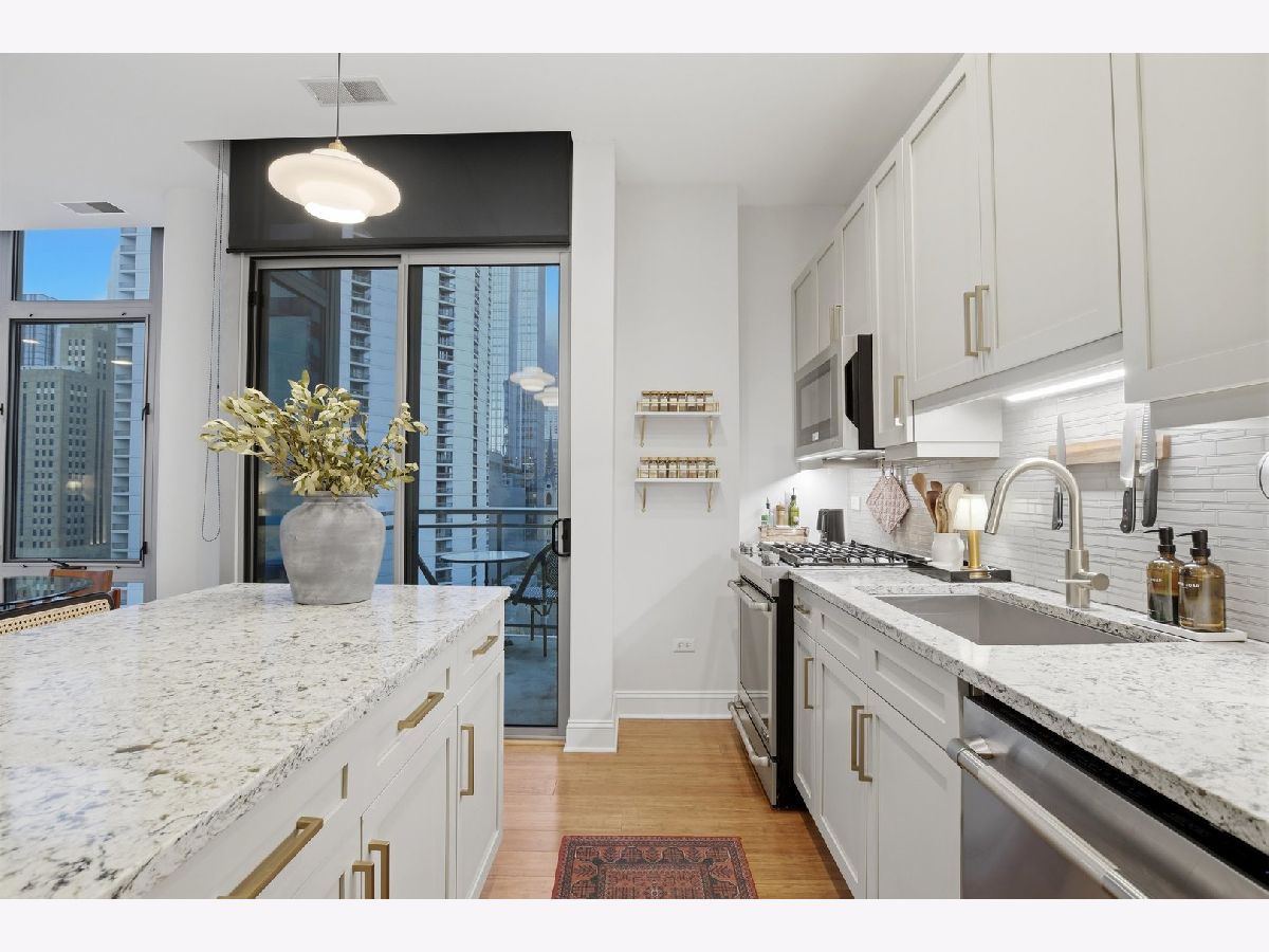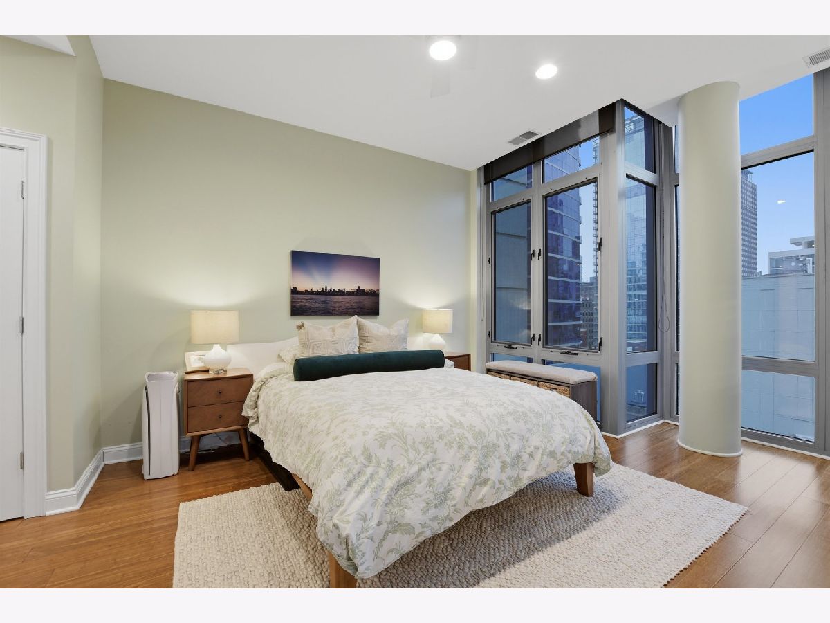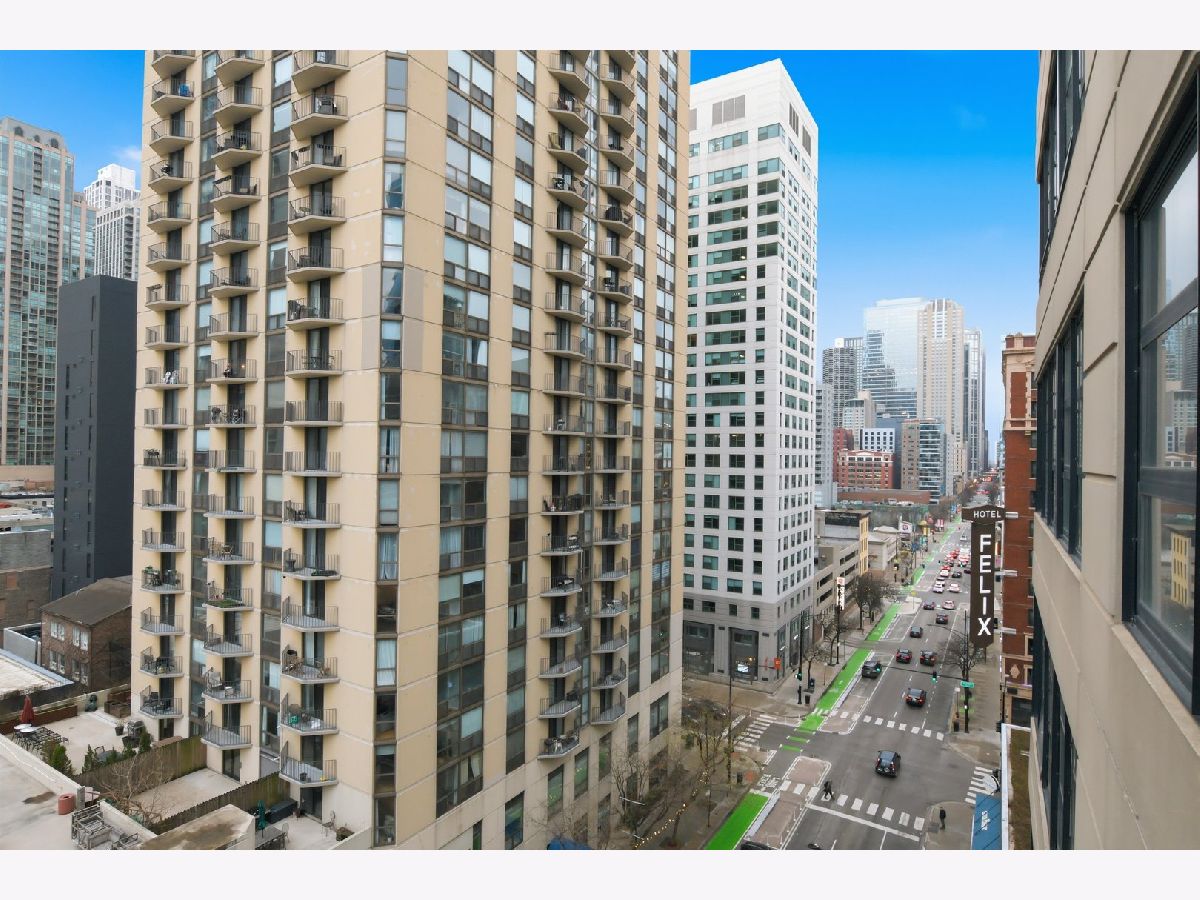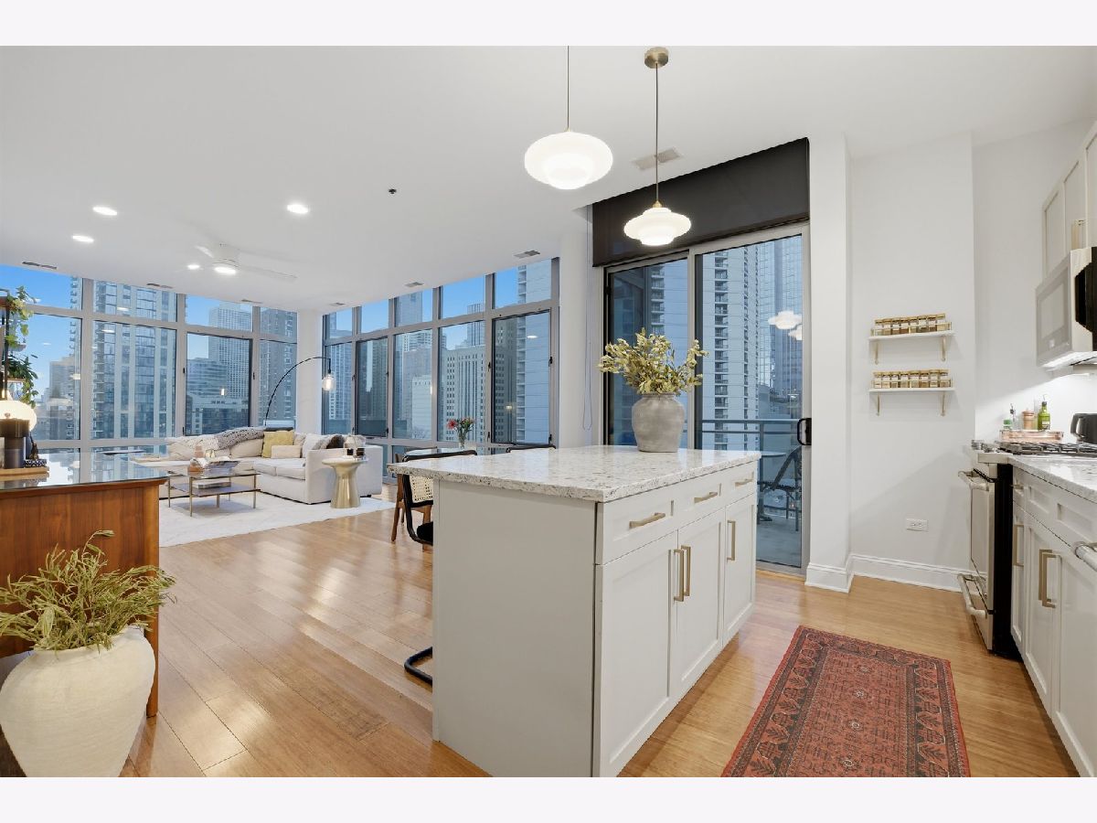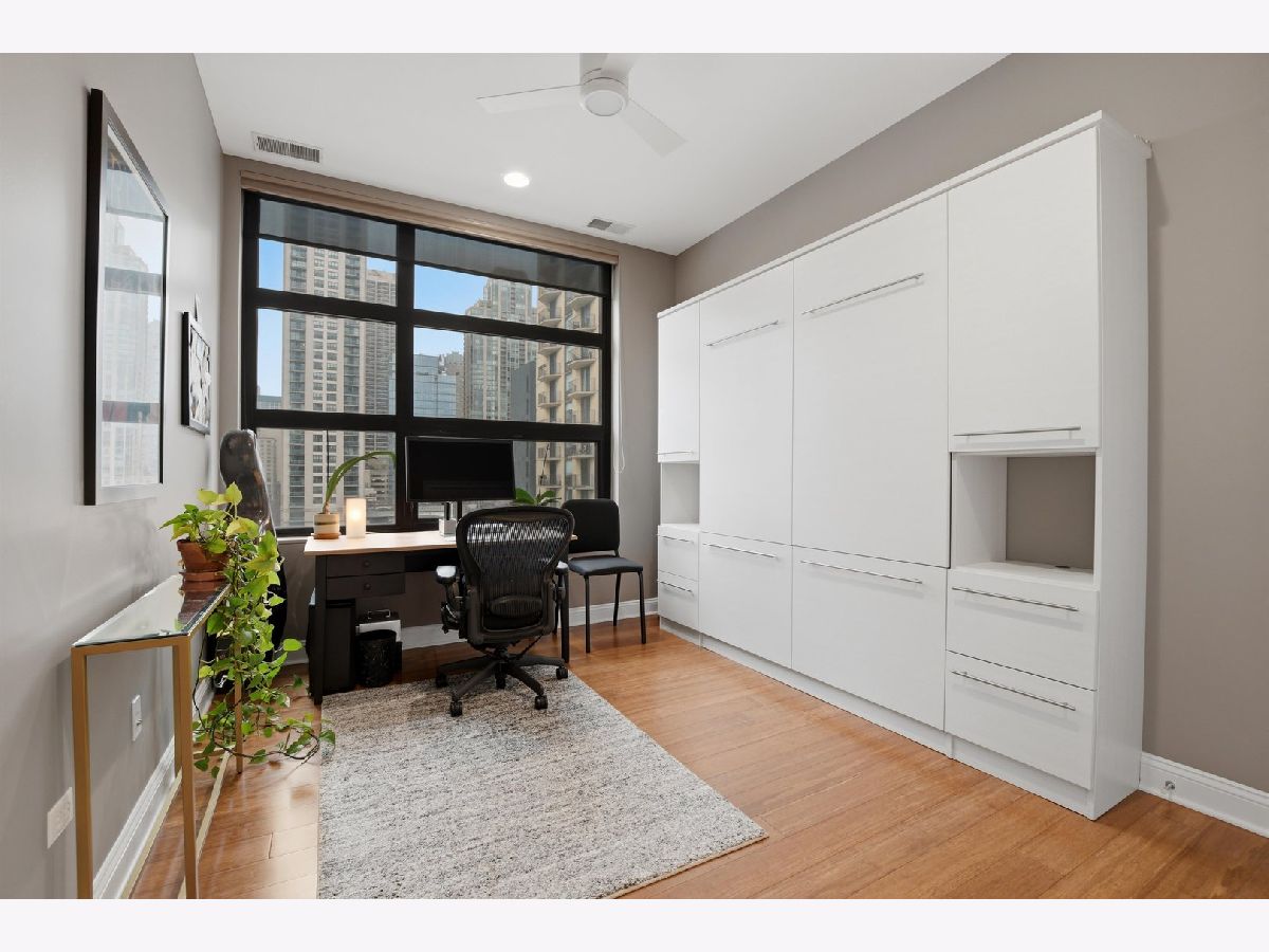 Experience refined city living in this beautifully updated corner residence in the coveted '04 tier of a boutique River North building. This spacious 2 bedroom, 2 bath home is wrapped in floor to ceiling windows that fill the space with natural light and showcase sweeping northeast city views. The open concept layout offers a seamless flow between living and dining areas, complemented by a private balcony and a sleek gas fireplace, creating an ideal setting for both everyday living and entertaining. The kitchen was thoughtfully redesigned with a modern aesthetic and features premium JennAir appliances, updated countertops and backsplash, and abundant cabinetry. Additional cosmetic updates including lighting, fixtures, hardware, and fresh paint have been completed to give the home a clean and current feel throughout, while hardwood flooring runs throughout the entire unit. The primary suite offers a comfortable retreat with generous closet space and a fully renovated bathroom featuring an oversized walk in shower and linen storage. The second bedroom provides excellent flexibility and includes a custom Murphy bed with built in shelving, making it ideal for a guest room, home office, or both. Additional features include in unit laundry, great storage throughout, and a deeded garage parking space equipped with a 240V EV charger wired directly to the unit. Storage unit in the building also included. Well managed boutique building in an unbeatable River North location just steps from top dining, shopping, and everything the neighborhood has to offer. Don't forget to check out both videos!