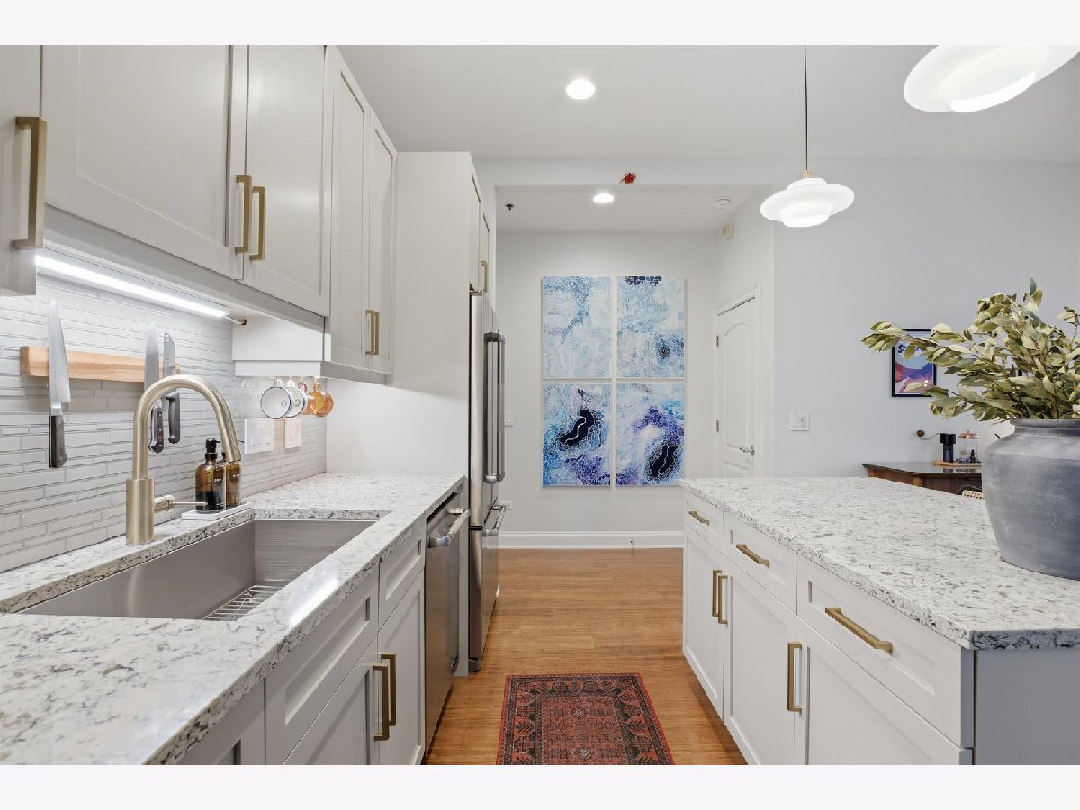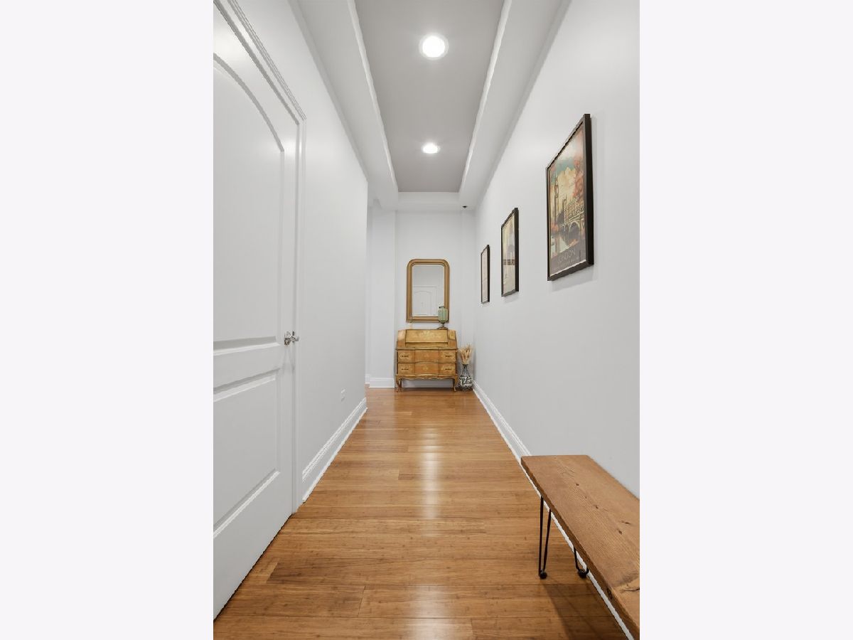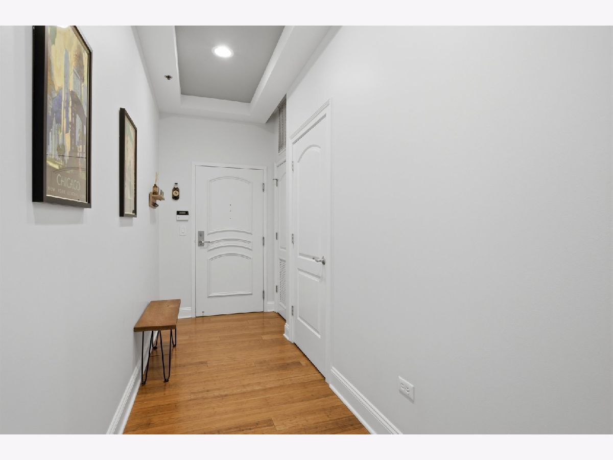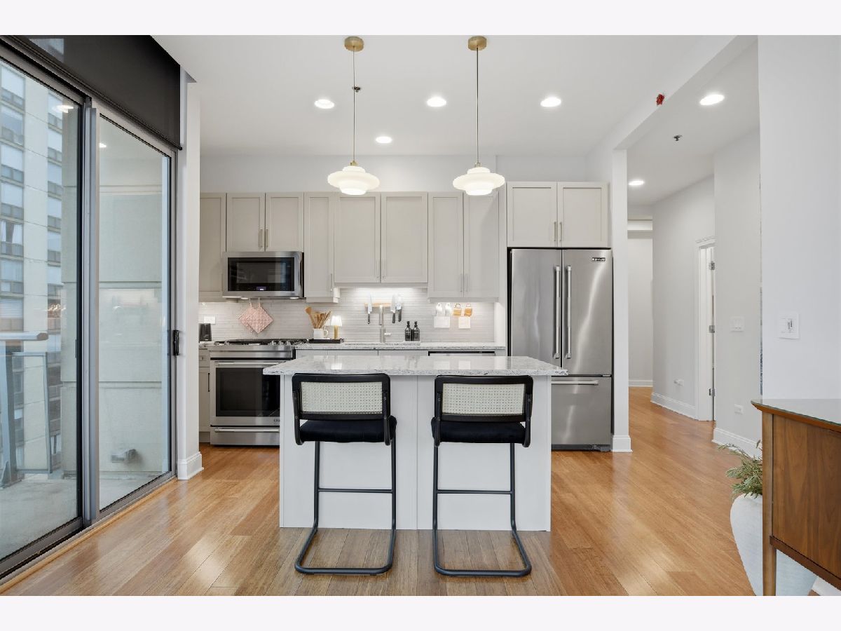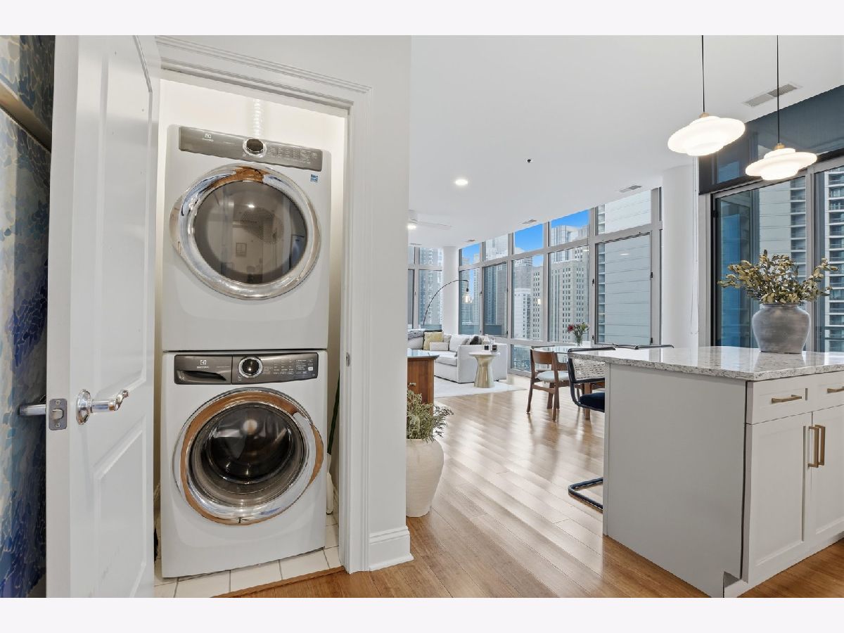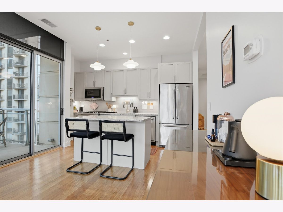 Experience refined city living in this beautifully updated corner residence in the coveted '04 tier of a boutique River North building. This spacious 2 bedroom, 2 bath home is wrapped in floor to ceiling windows that fill the space with natural light and showcase sweeping northeast city views. The open concept layout offers a seamless flow between living and dining areas, complemented by a private balcony and a sleek gas fireplace, creating an ideal setting for both everyday living and entertaining. The kitchen was thoughtfully redesigned with a modern aesthetic and features premium JennAir appliances, updated countertops and backsplash, and abundant cabinetry. Additional cosmetic updates including lighting, fixtures, hardware, and fresh paint have been completed to give the home a clean and current feel throughout, while hardwood flooring runs throughout the entire unit. The primary suite offers a comfortable retreat with generous closet space and a fully renovated bathroom featuring an oversized walk in shower and linen storage. The second bedroom provides excellent flexibility and includes a custom Murphy bed with built in shelving, making it ideal for a guest room, home office, or both. Additional features include in unit laundry, great storage throughout, and a deeded garage parking space equipped with a 240V EV charger wired directly to the unit. Storage unit in the building also included. Well managed boutique building in an unbeatable River North location just steps from top dining, shopping, and everything the neighborhood has to offer. Don't forget to check out both videos!