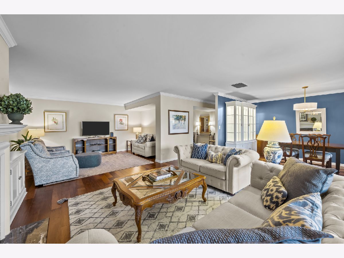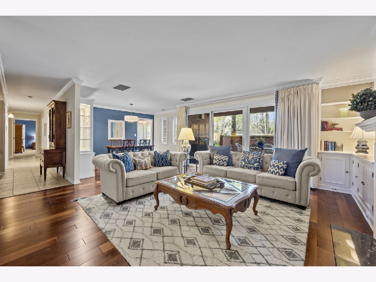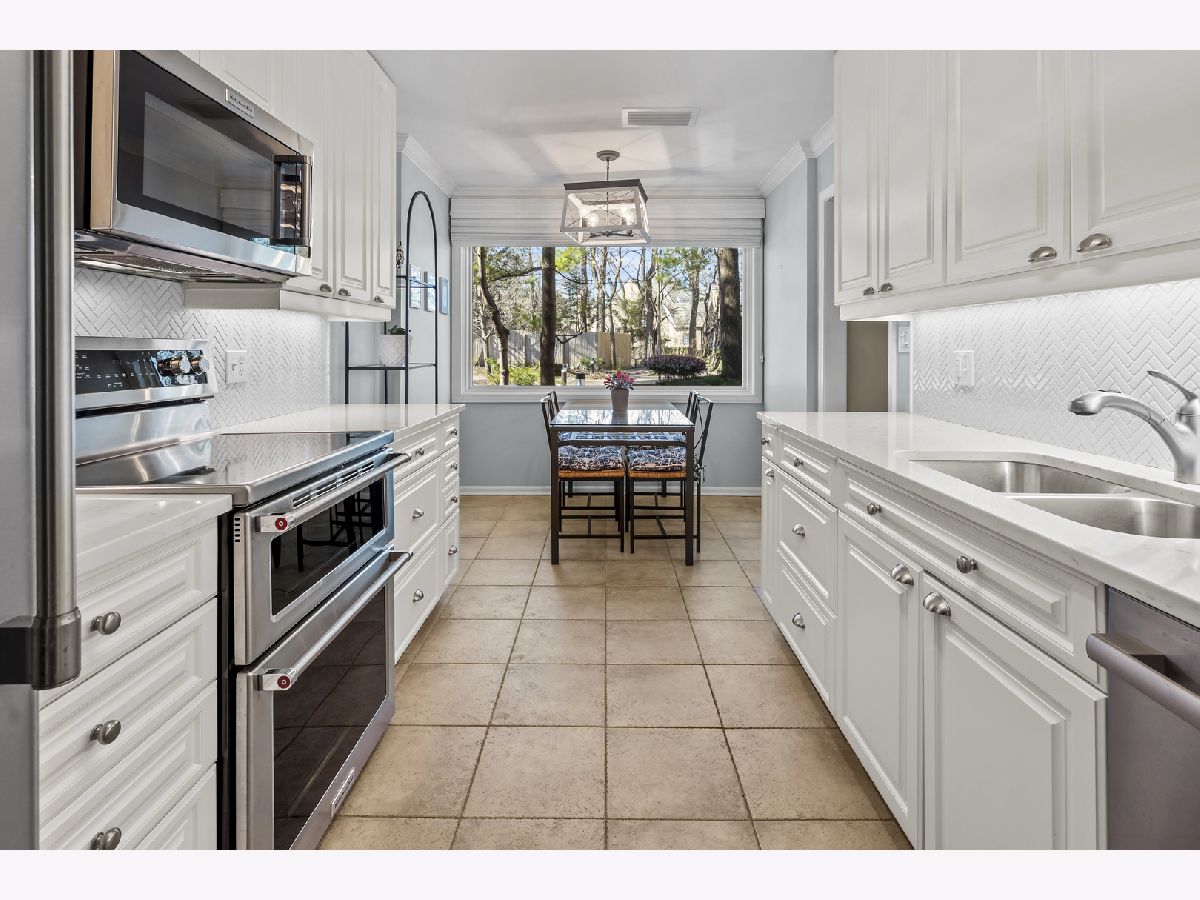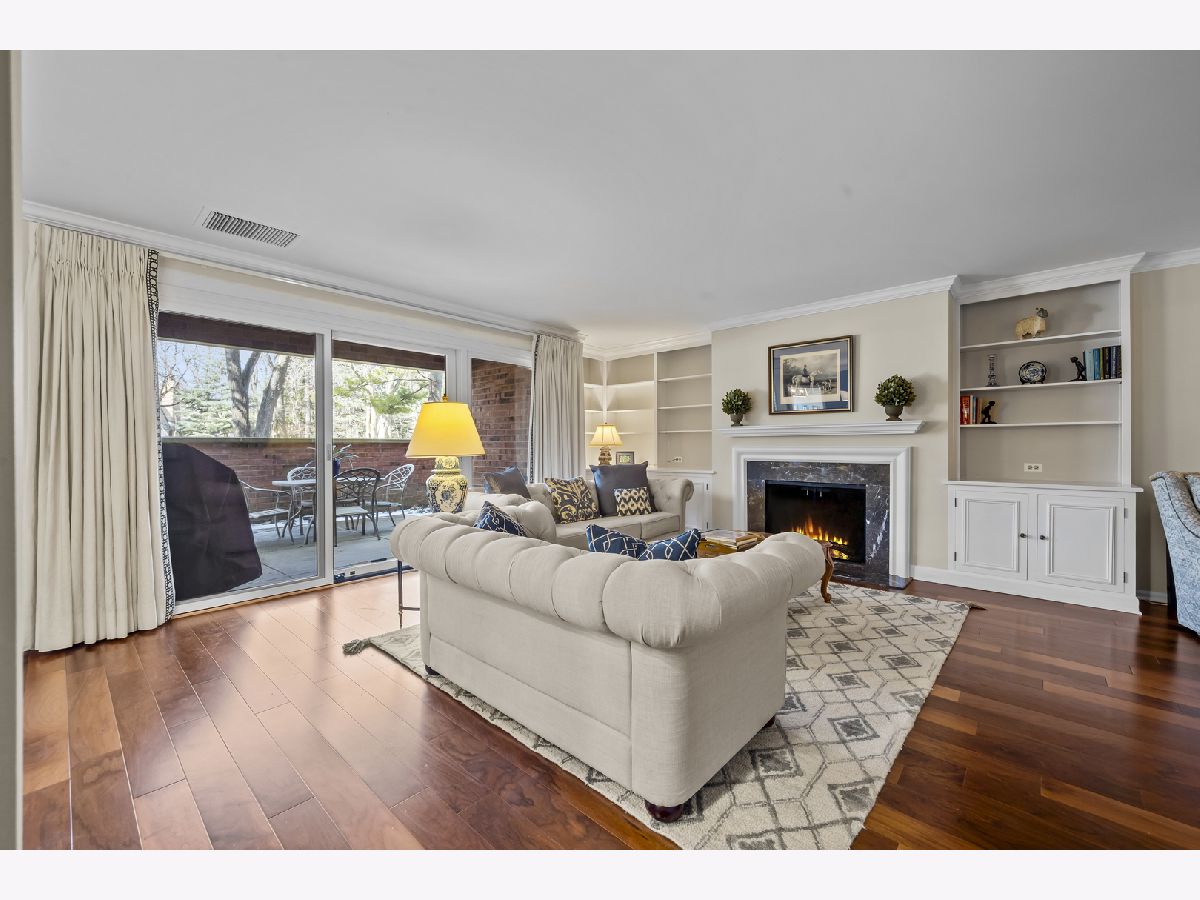 Enjoy living in the downtown Lake Forest, just a short distance from shops, the grocery store, the train, and restaurants. This first-floor unit stands out for its private patio with western exposure and open, unobstructed views and afternoon light that fills the space. Inside, the spacious layout includes two bedrooms, a living room with fireplace and built-in bookcases, which opens to a den and dining room. The eat-in kitchen is clean and classic, featuring white cabinetry, a white subway tile backsplash, quartz countertops, newer stainless steel appliances, and a large picture window that welcomes afternoon light. Spacious primary bedroom with large walk-in closet with custom organizer. Two parking spaces and a separate storage unit are included. All windows were replaced with Pella windows, furnace and AC new in 2019. Monthly assessment is $899.09, with a special assessment of $496.56 is billed quarterly and concludes at the end of 2026.