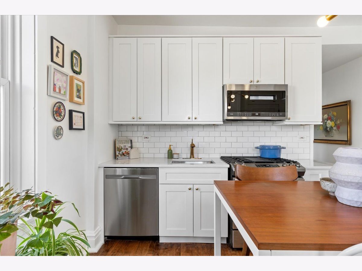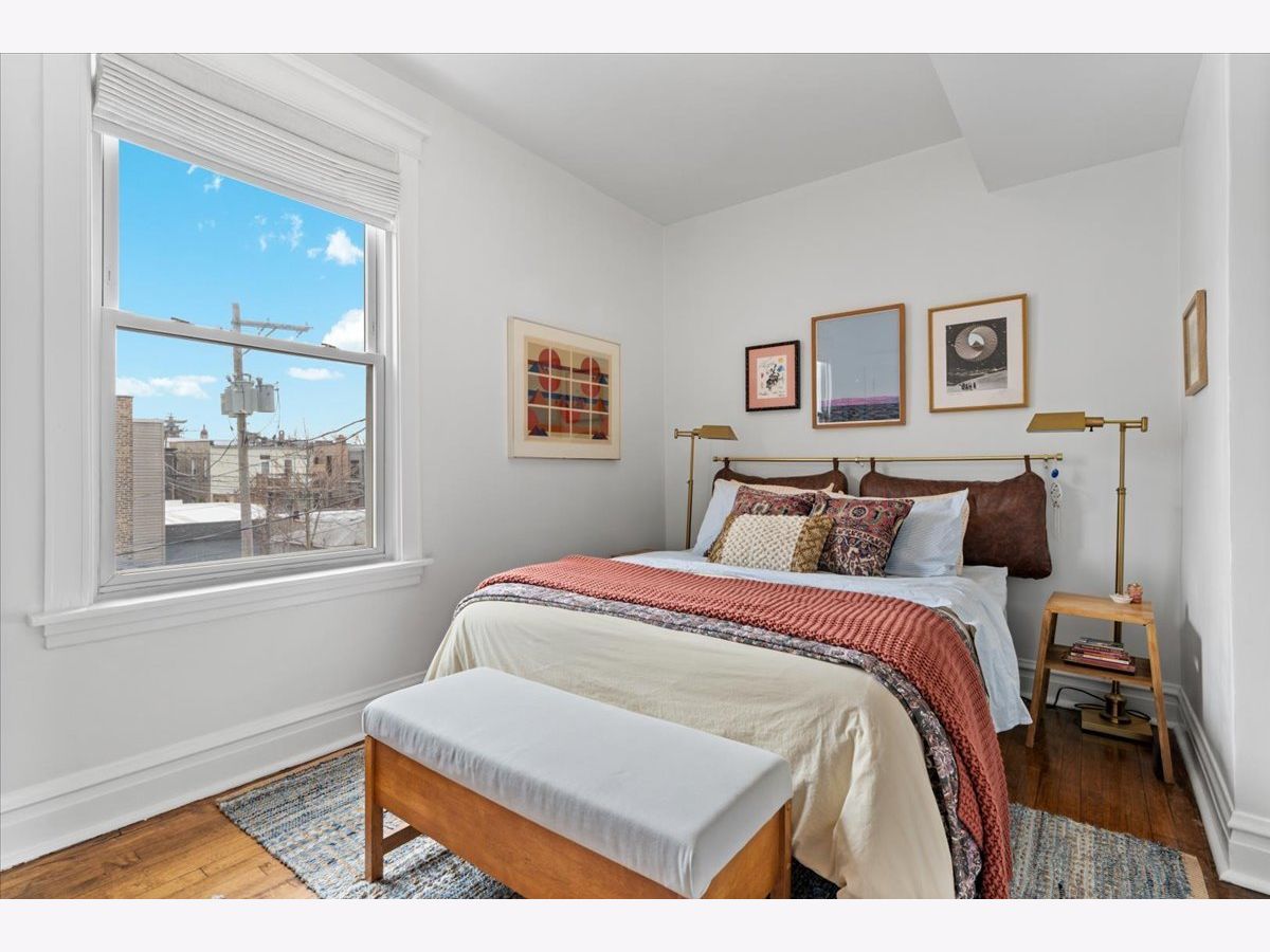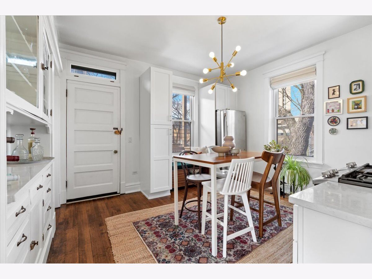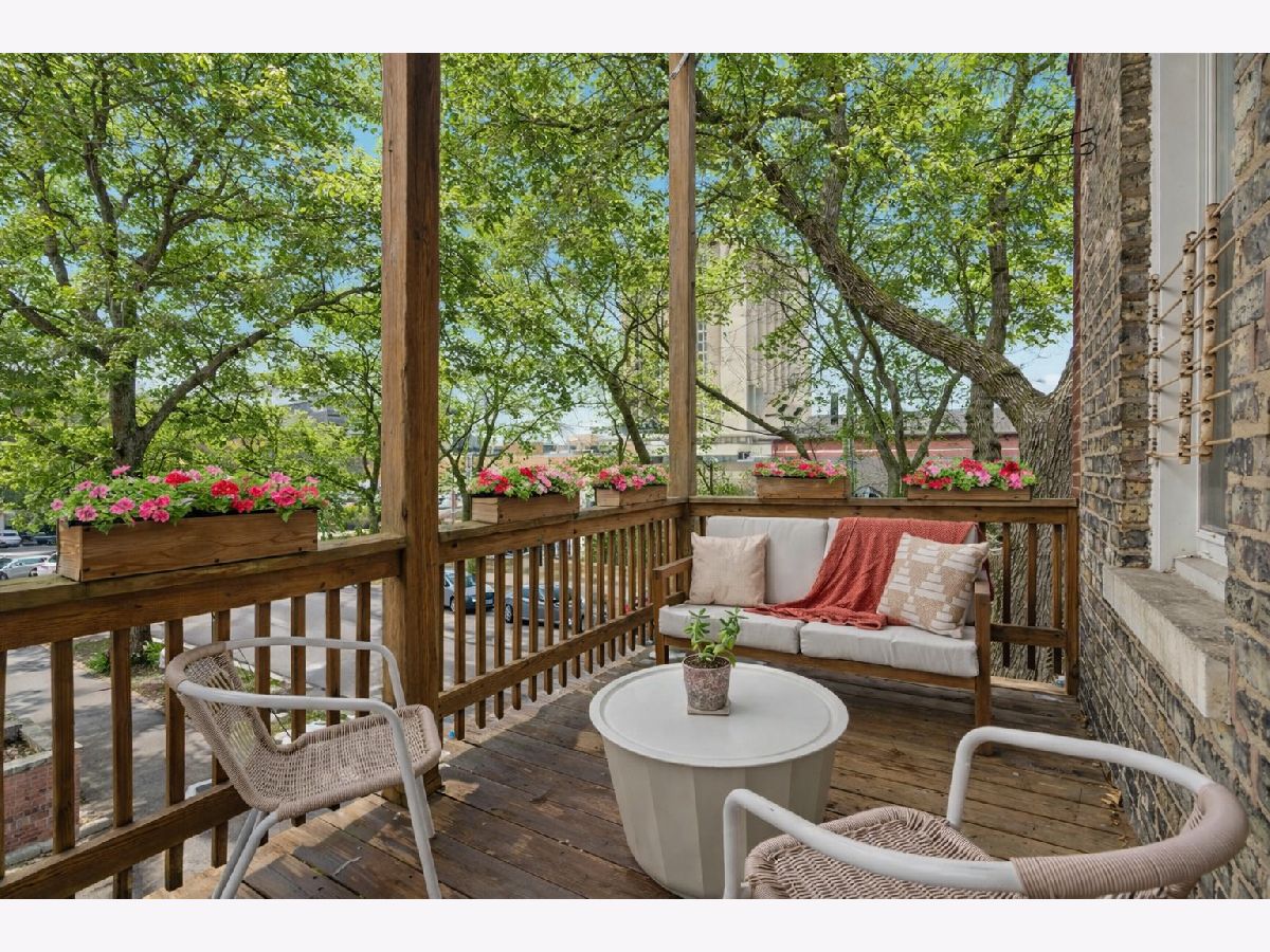 Vintage charm meets modern sophistication in this timeless 2-bedroom, 1-bathroom condo in the heart of Ukrainian Village. Perched on the top floor of a quiet, well-maintained building, this sun-filled home sits on a picturesque, tree-lined street. The spacious corner living room is bathed in natural light and features soaring ceilings and hardwood floors throughout, creating an inviting and airy feel. The beautifully updated kitchen is both stylish and functional, showcasing stainless steel appliances, white shaker cabinetry, quartz countertops, a classic white subway tile backsplash, gorgeous original built in cabinets and a window seat. Additional cabinetry enhances storage, while the large rear deck just off the kitchen is perfect for grilling, entertaining, or relaxing outdoors. The bathroom blends classic design with thoughtful updates, including a white subway tile shower, newly glazed bathtub, updated plumbing and light fixtures, and added shelving. Recent upgrades by the current owner include motorized Roman shades throughout, new light fixtures in every room, updated switches, and a smart thermostat. Storage is abundant with custom Elfa closets in both bedrooms, plus an additional secure storage space on the ground floor. A brand-new in-unit washer and dryer complete the home. Offering the perfect blend of vintage character and modern convenience, all in an unbeatable location just moments from Division Street and Wicker Park-this is one you don't want to miss.