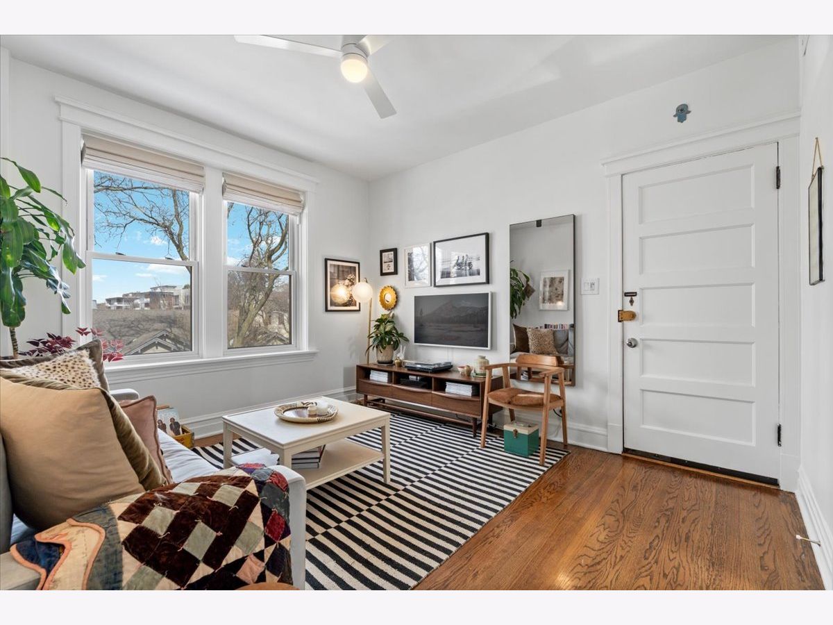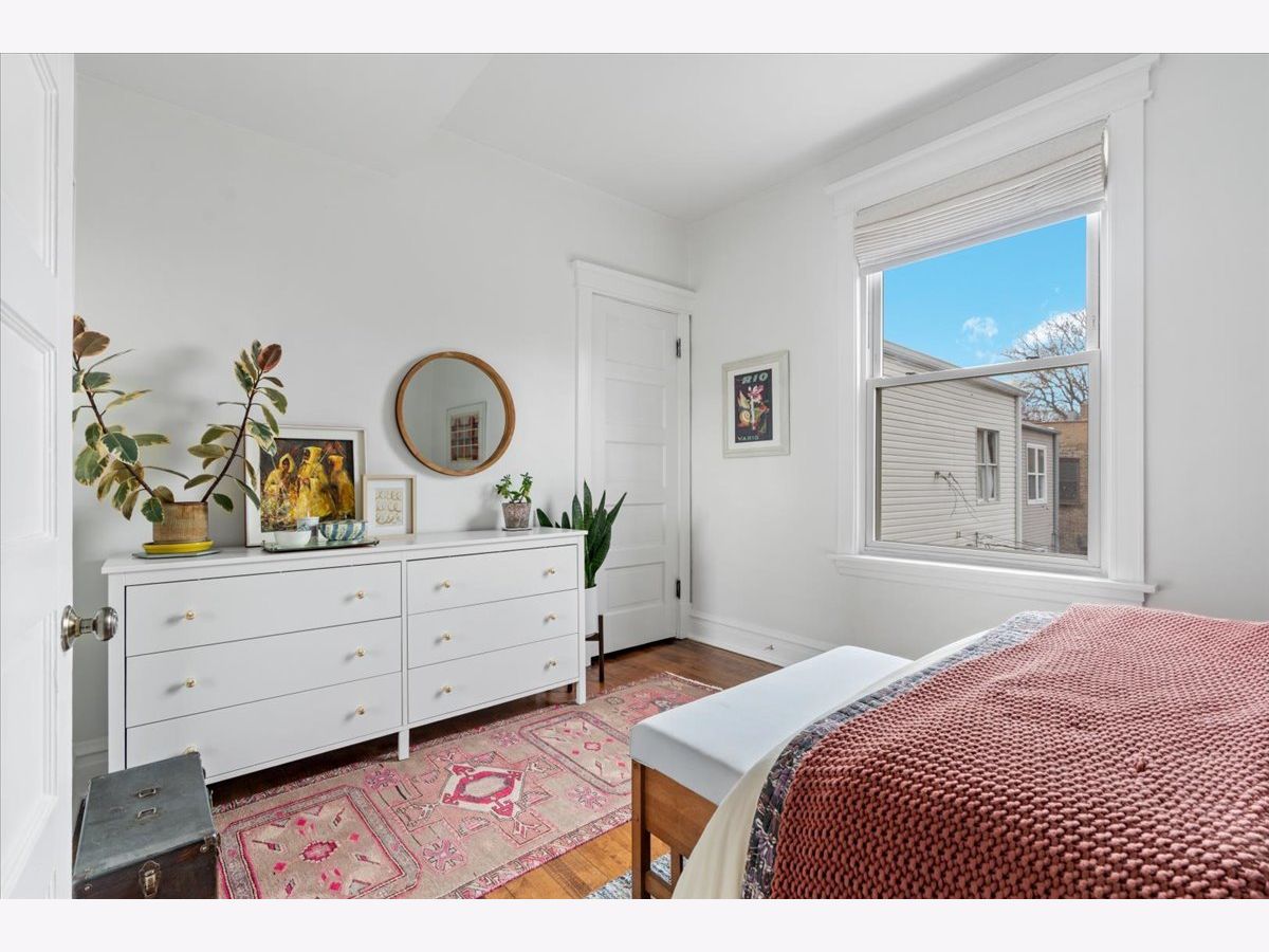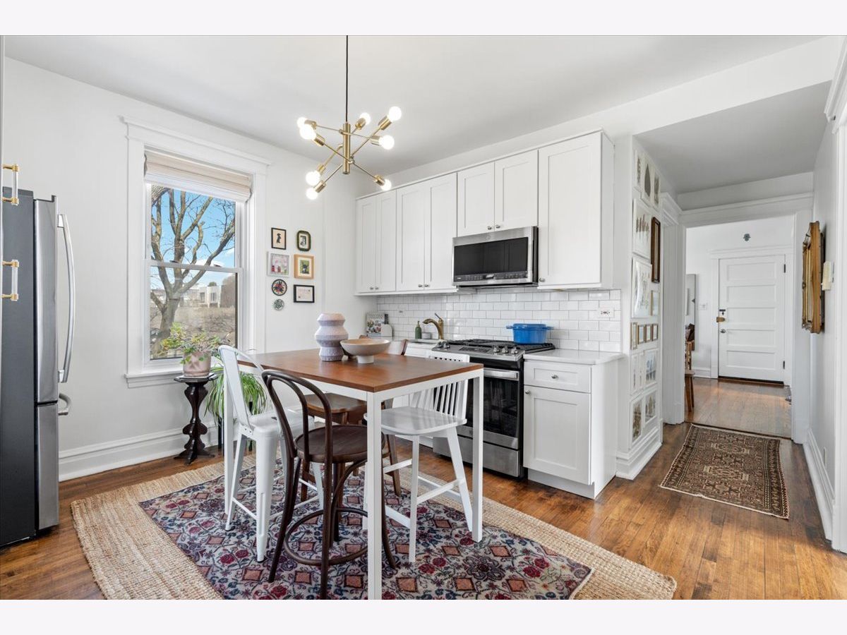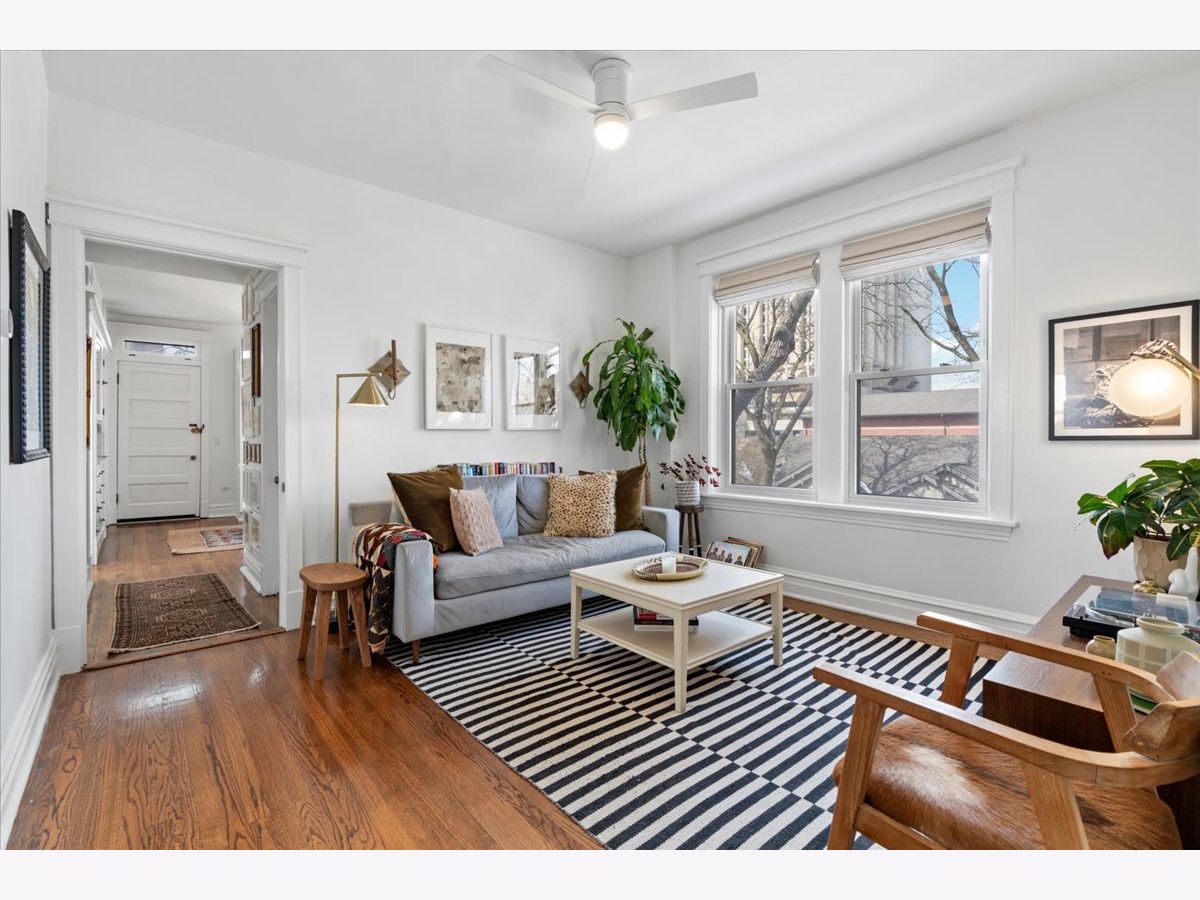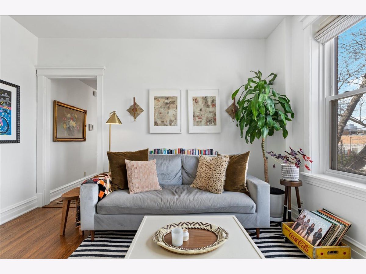 Vintage charm meets modern sophistication in this timeless 2-bedroom, 1-bathroom condo in the heart of Ukrainian Village. Perched on the top floor of a quiet, well-maintained building, this sun-filled home sits on a picturesque, tree-lined street. The spacious corner living room is bathed in natural light and features soaring ceilings and hardwood floors throughout, creating an inviting and airy feel. The beautifully updated kitchen is both stylish and functional, showcasing stainless steel appliances, white shaker cabinetry, quartz countertops, a classic white subway tile backsplash, gorgeous original built in cabinets and a window seat. Additional cabinetry enhances storage, while the large rear deck just off the kitchen is perfect for grilling, entertaining, or relaxing outdoors. The bathroom blends classic design with thoughtful updates, including a white subway tile shower, newly glazed bathtub, updated plumbing and light fixtures, and added shelving. Recent upgrades by the current owner include motorized Roman shades throughout, new light fixtures in every room, updated switches, and a smart thermostat. Storage is abundant with custom Elfa closets in both bedrooms, plus an additional secure storage space on the ground floor. A brand-new in-unit washer and dryer complete the home. Offering the perfect blend of vintage character and modern convenience, all in an unbeatable location just moments from Division Street and Wicker Park-this is one you don't want to miss.