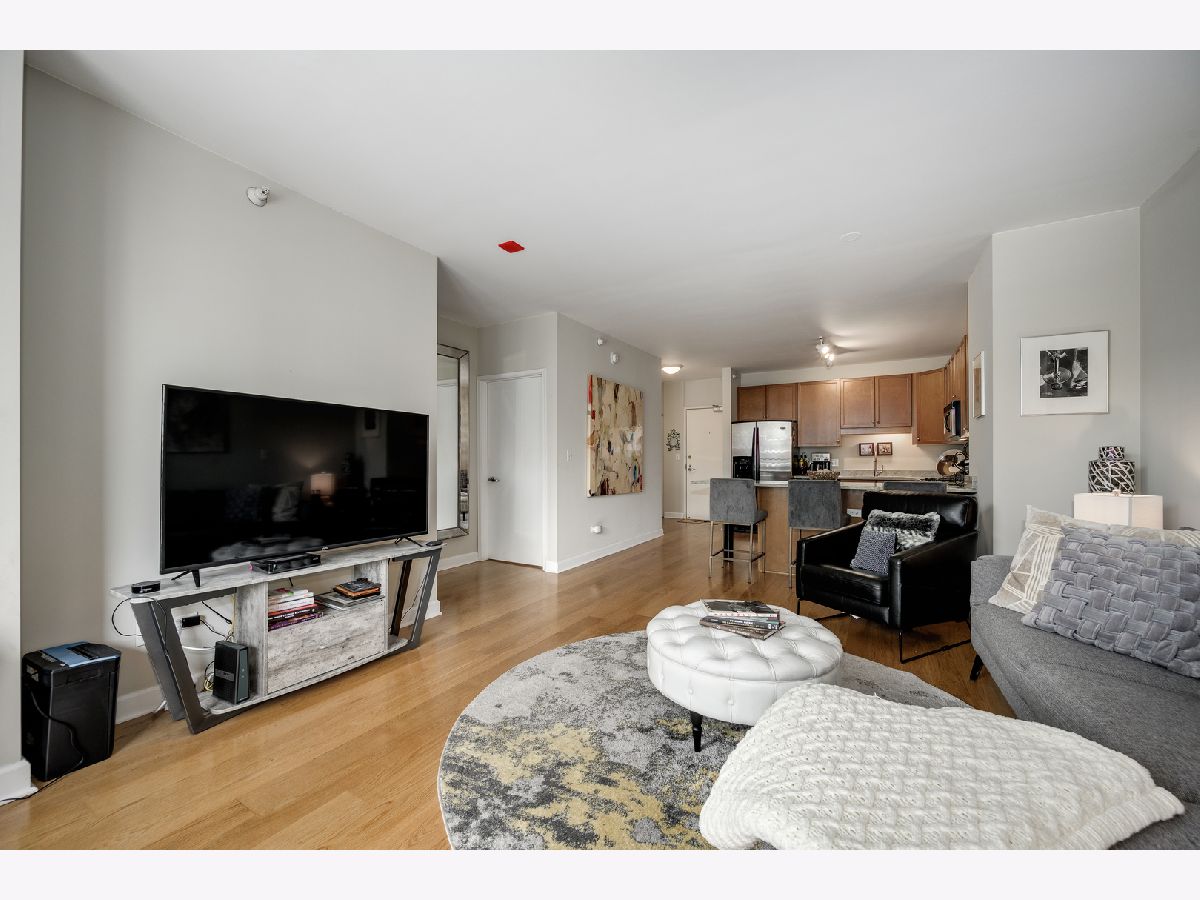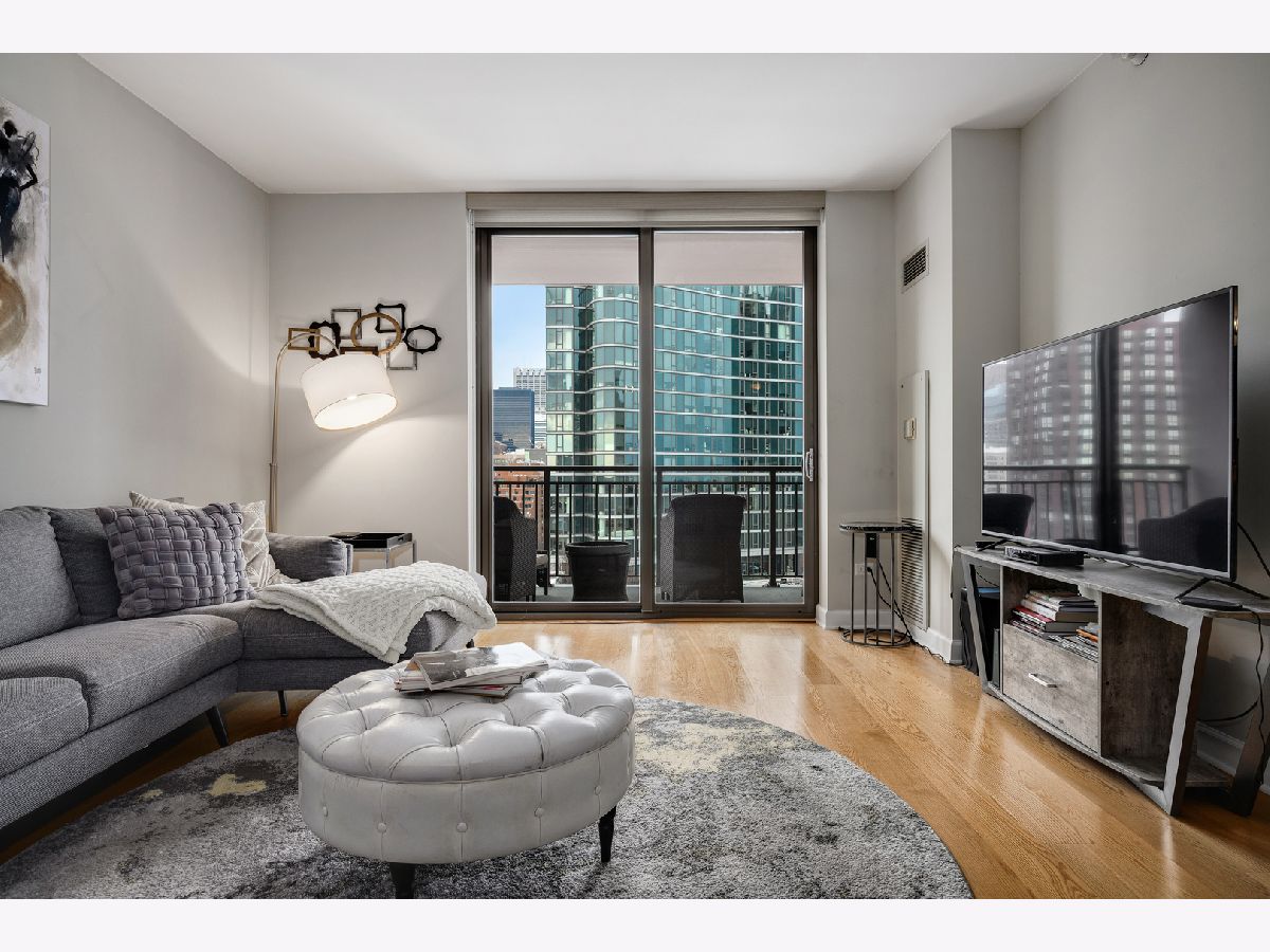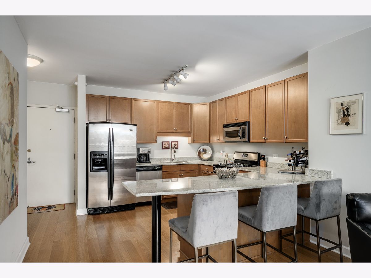 Welcome home to this well maintained spacious 1 bed with outdoor space and parking! Ideal South Loop location near transportation, shopping, restaurants and the lake. Unit features granite countertops, 42 inch cabinets, natural oak wood floors, SS appliances, floor to ceiling windows, walk in-closet with the Elfa system, in unit W/D and a large, motorized blinds in the bedroom and private balcony. The building offers 24 hour door staff, pool and sundeck with heat, AC, cable and internet included in association dues.