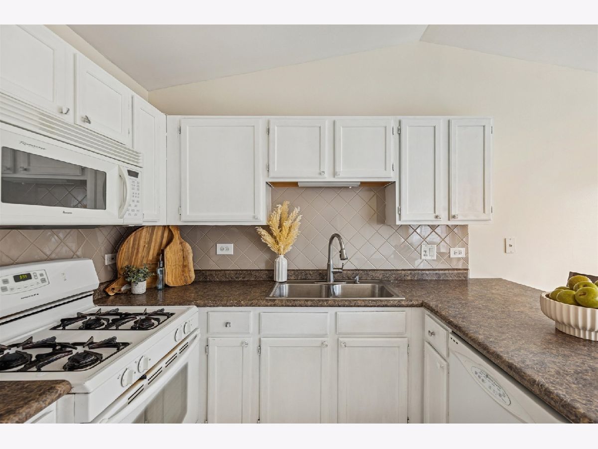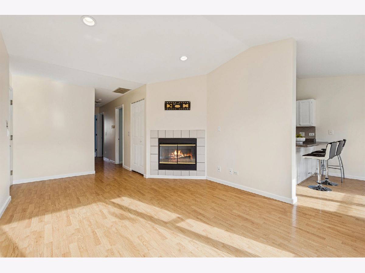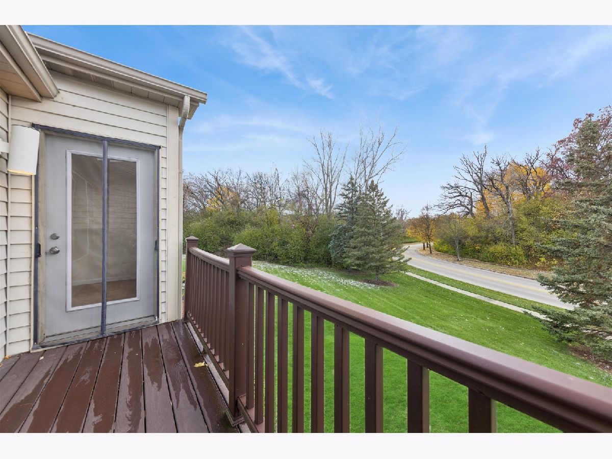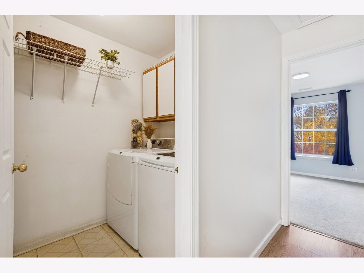 Bright & sunny move-in ready 2-bedroom, 2-bath condo in tranquil Oakwood Hills! Inviting second-floor home w/ vaulted ceilings and laminate flooring throughout main living areas. Airy living room features large windows and cozy gas fireplace. Freshly painted kitchen offers ample cabinetry, breakfast bar, and open flow to dining area-ideal for hosting and entertaining. Balcony off dining area is perfect for morning coffee or evening grilling w/ views of forest preserve. Primary ensuite includes walk-in closet, updated lighting, and complete bath w/ dual-sink vanity. Second bedroom also freshly painted with updated lighting. Additional highlights include newer washer, dryer and hot water heater, in-unit laundry and attached 1-car garage. Prime location near I-90, Route 20, shopping, restaurants, and schools. Move-in ready & waiting for you!