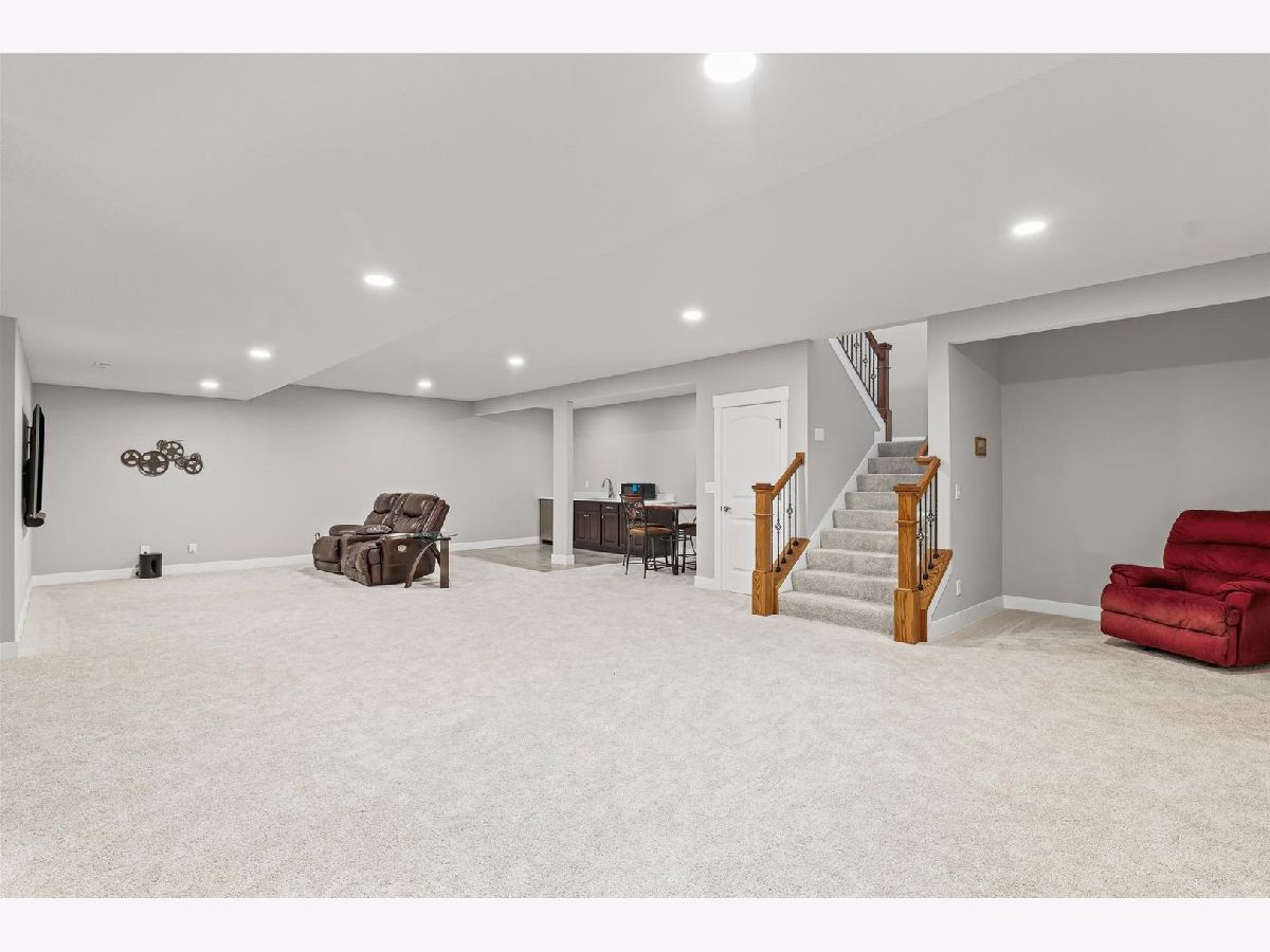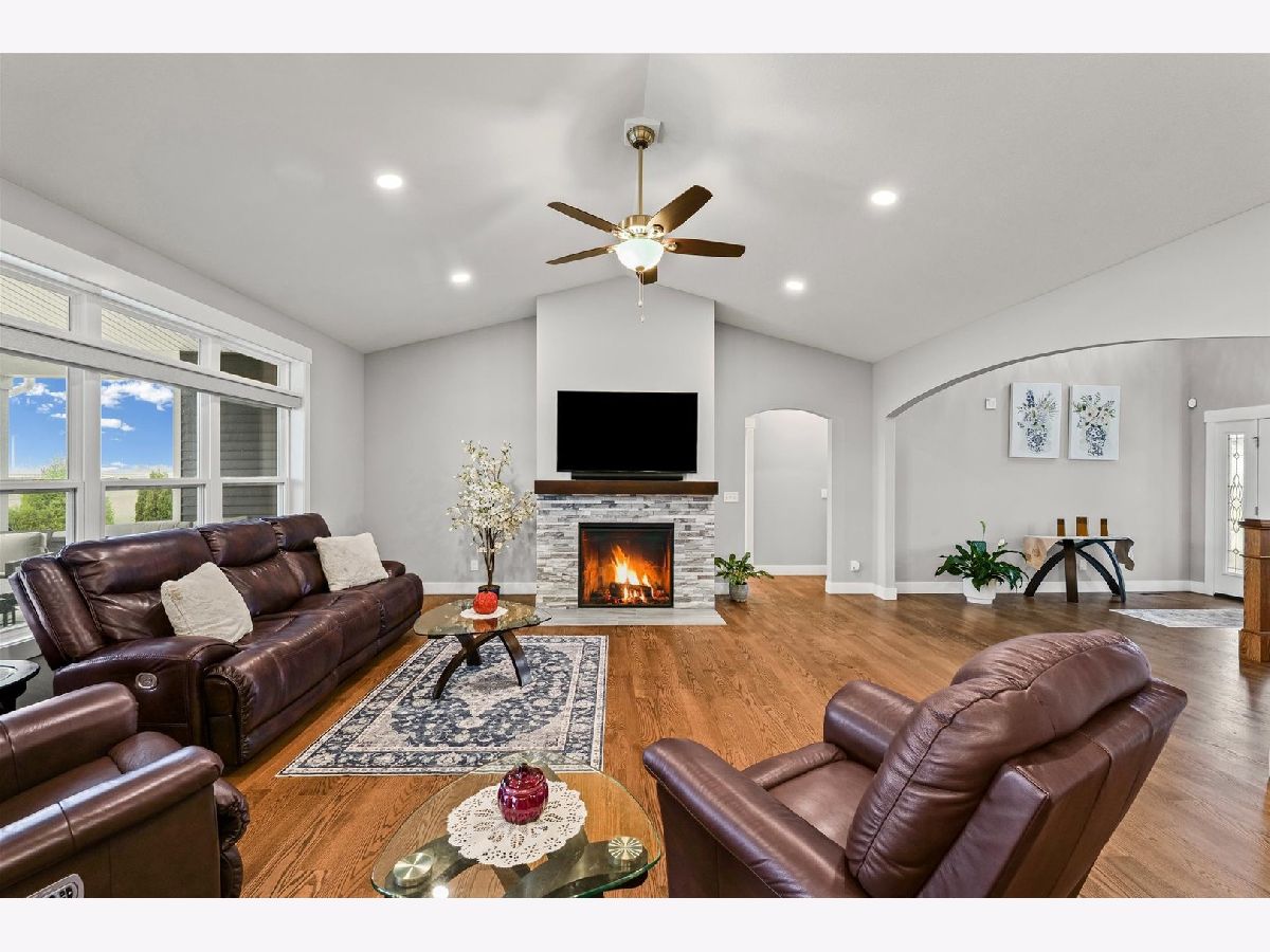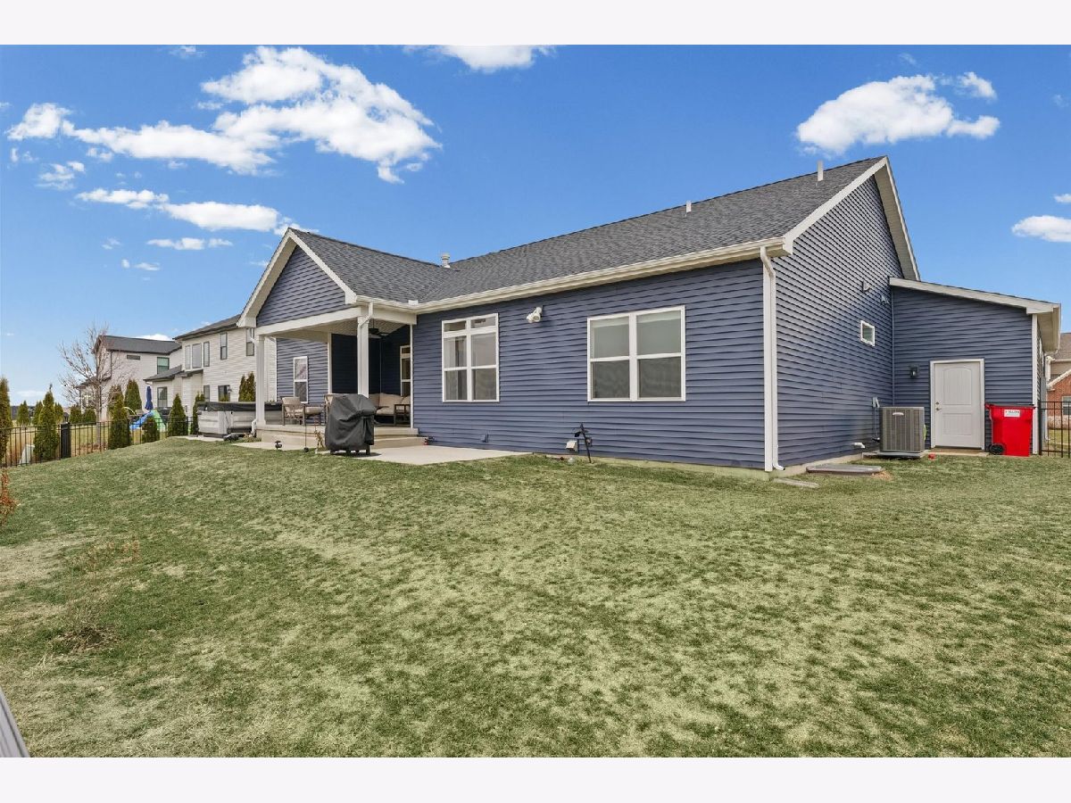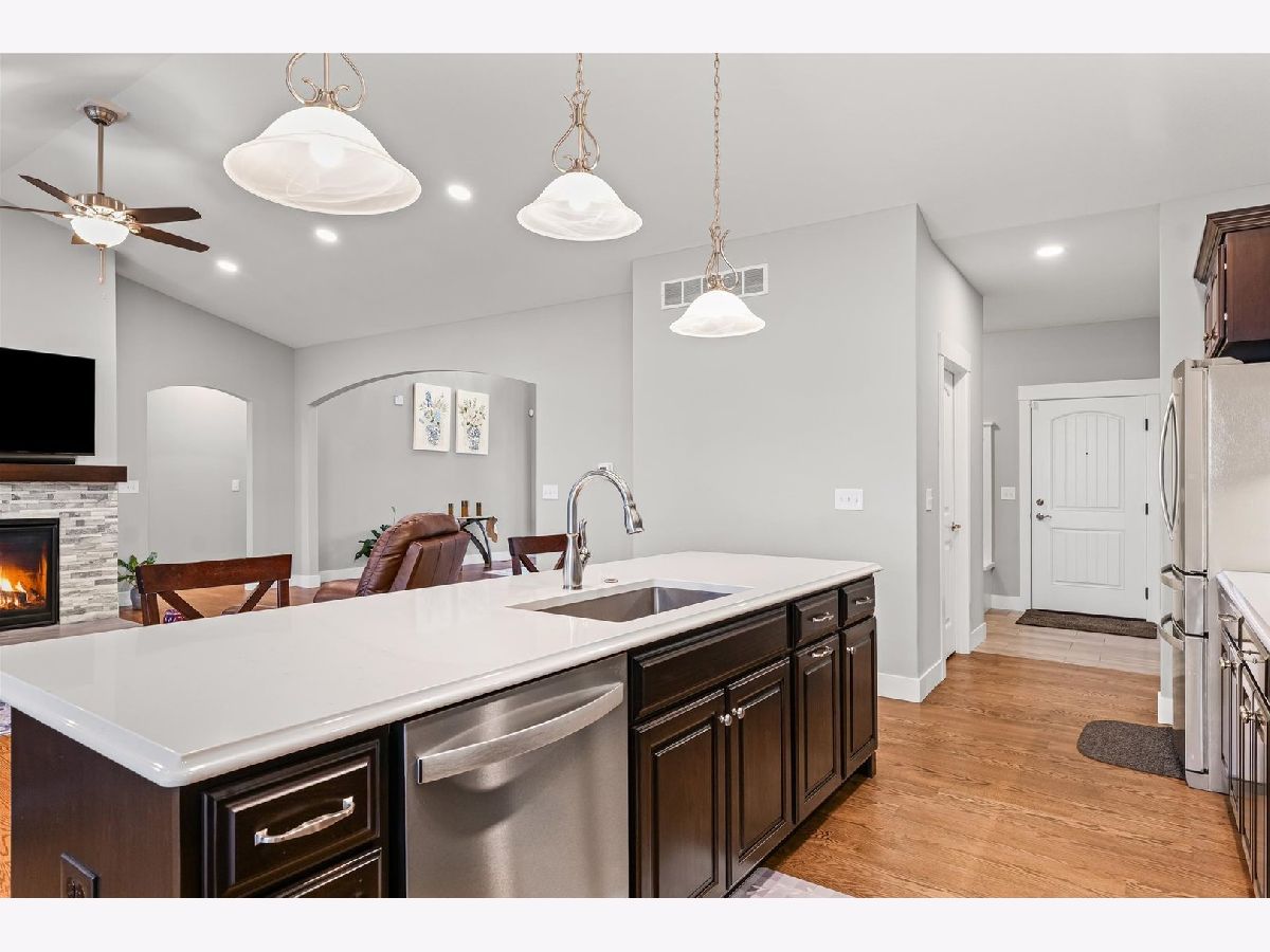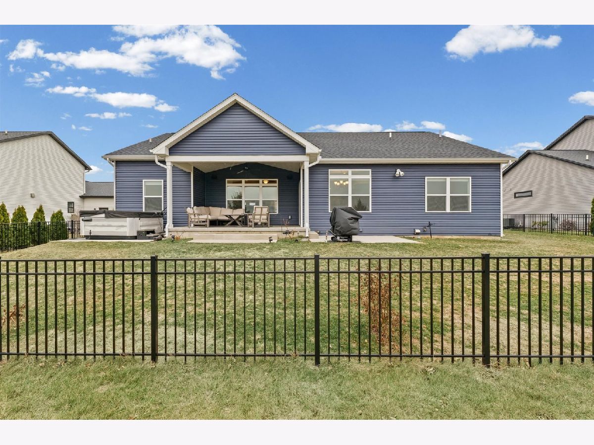 Enjoy this nearly new 4-bedroom, 3-full bath ranch in the highly sought-after Trails at Abbey Fields subdivision. A welcoming two-story entry leads you into the perfect space for gathering and entertaining. Hardwood flooring flows throughout the main living areas, while the living room impresses with cathedral ceilings, a cozy fireplace, and transom windows that flood the space with natural light. The eat-in kitchen features a functional island, custom cabinetry, tile backsplash, walk-in pantry, and plenty of room for everyday living or hosting. Sliding doors off the kitchen lead to the covered patio and feature remote-controlled blinds, as do several windows throughout the living room and entry. You'll love the split-bedroom floor plan, offering privacy and comfort. The primary suite showcases a lighted tray ceiling and an ensuite bath with double sinks, a tiled shower, and a spacious walk-in closet. A pocket door connects the closet directly to the laundry room, making everyday routines effortless. The laundry room includes a washer and dryer on pedestals, additional cabinetry, and a utility sink. The finished basement expands your living space with an office, fourth bedroom, full bathroom, a sprawling family/rec room, and a wet bar. It's also equipped with home-theater surround sound, creating an ideal space for movie nights or game days. Additional highlights include a designated drop zone off the three-car garage, plus a bump-out ideal for extra storage or a workshop. App-driven Sonos speakers are installed on the patio and in the garage, as well as through the living room TV speaker system, making it easy to enjoy music or entertainment throughout the home. Dual zone HVAC adds comfort and efficiency year-round. Outside, enjoy a fully fenced backyard, a large covered patio, a dedicated hot tub area, and additional space for grilling with a built-in gas line. This custom home is packed with upgrades and is truly move-in ready for its next owner.
