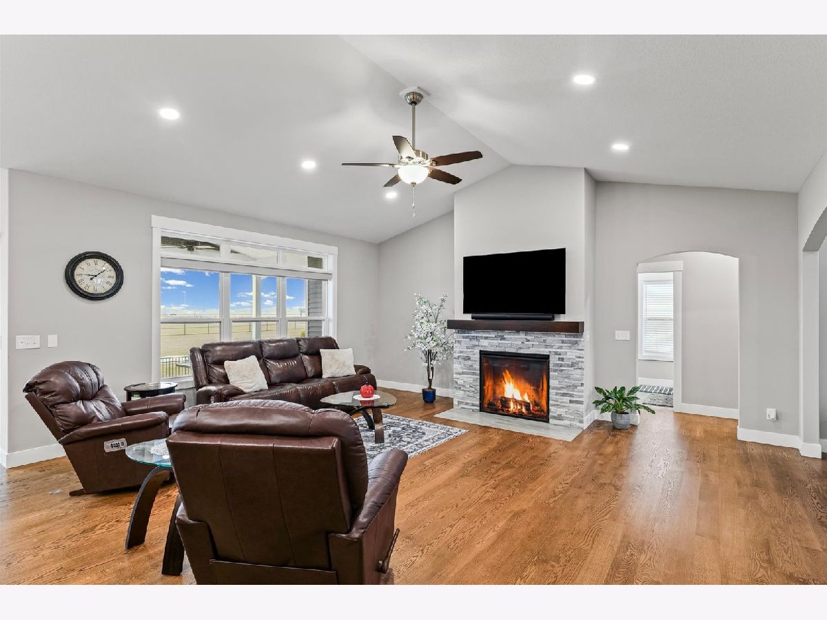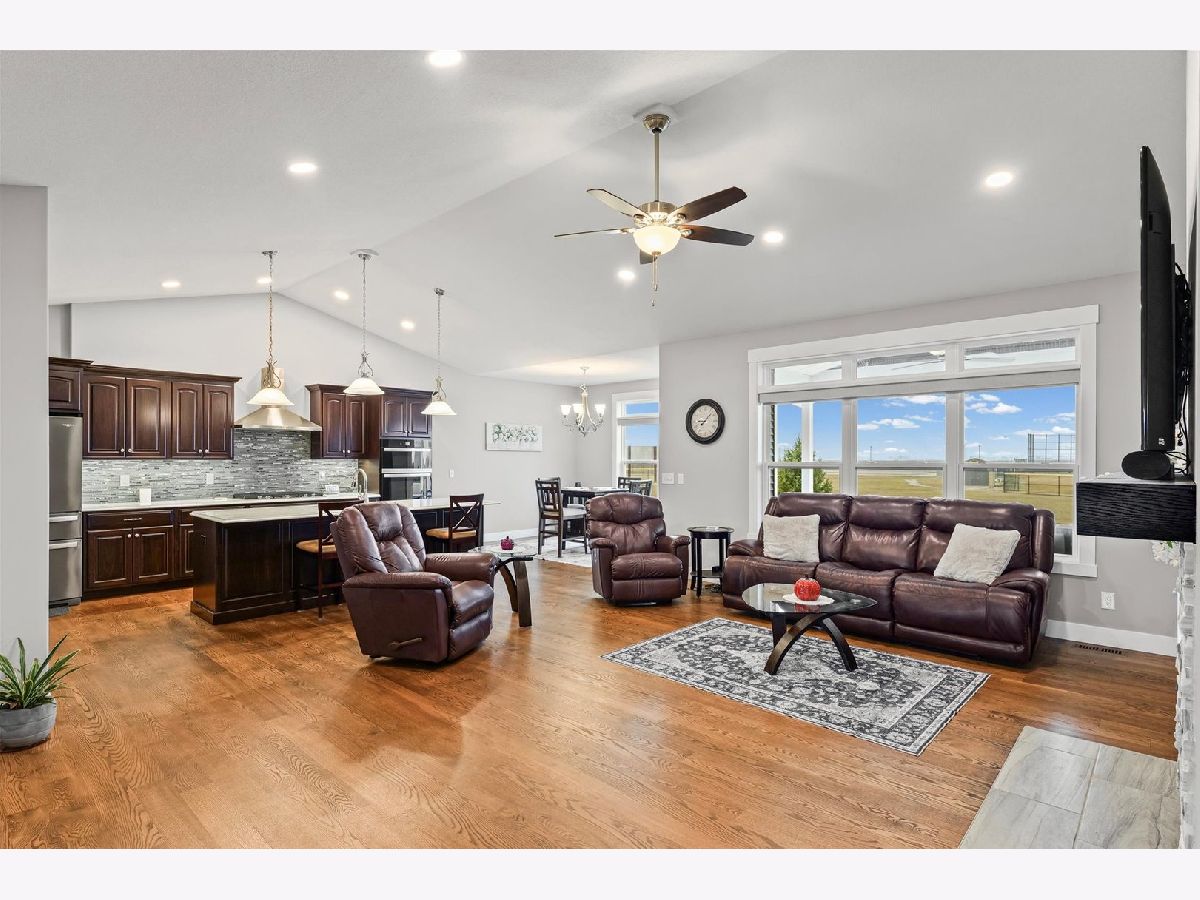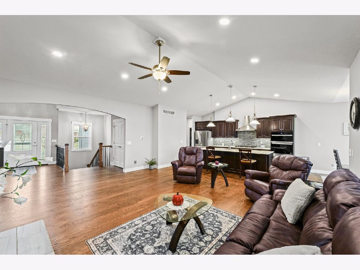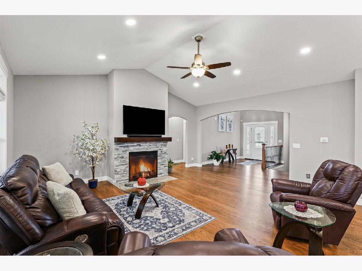 Enjoy this nearly new 4-bedroom, 3-full bath ranch in the highly sought-after Trails at Abbey Fields subdivision. A welcoming two-story entry leads you into the perfect space for gathering and entertaining. Hardwood flooring flows throughout the main living areas, while the living room impresses with cathedral ceilings, a cozy fireplace, and transom windows that flood the space with natural light. The eat-in kitchen features a functional island, custom cabinetry, tile backsplash, walk-in pantry, and plenty of room for everyday living or hosting. Sliding doors off the kitchen lead to the covered patio and feature remote-controlled blinds, as do several windows throughout the living room and entry. You'll love the split-bedroom floor plan, offering privacy and comfort. The primary suite showcases a lighted tray ceiling and an ensuite bath with double sinks, a tiled shower, and a spacious walk-in closet. A pocket door connects the closet directly to the laundry room, making everyday routines effortless. The laundry room includes a washer and dryer on pedestals, additional cabinetry, and a utility sink. The finished basement expands your living space with an office, fourth bedroom, full bathroom, a sprawling family/rec room, and a wet bar. It's also equipped with home-theater surround sound, creating an ideal space for movie nights or game days. Additional highlights include a designated drop zone off the three-car garage, plus a bump-out ideal for extra storage or a workshop. App-driven Sonos speakers are installed on the patio and in the garage, as well as through the living room TV speaker system, making it easy to enjoy music or entertainment throughout the home. Dual zone HVAC adds comfort and efficiency year-round. Outside, enjoy a fully fenced backyard, a large covered patio, a dedicated hot tub area, and additional space for grilling with a built-in gas line. This custom home is packed with upgrades and is truly move-in ready for its next owner.
