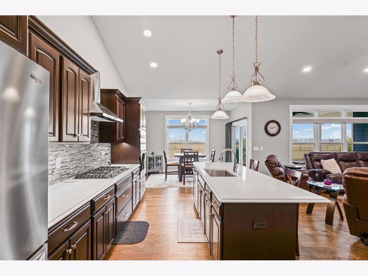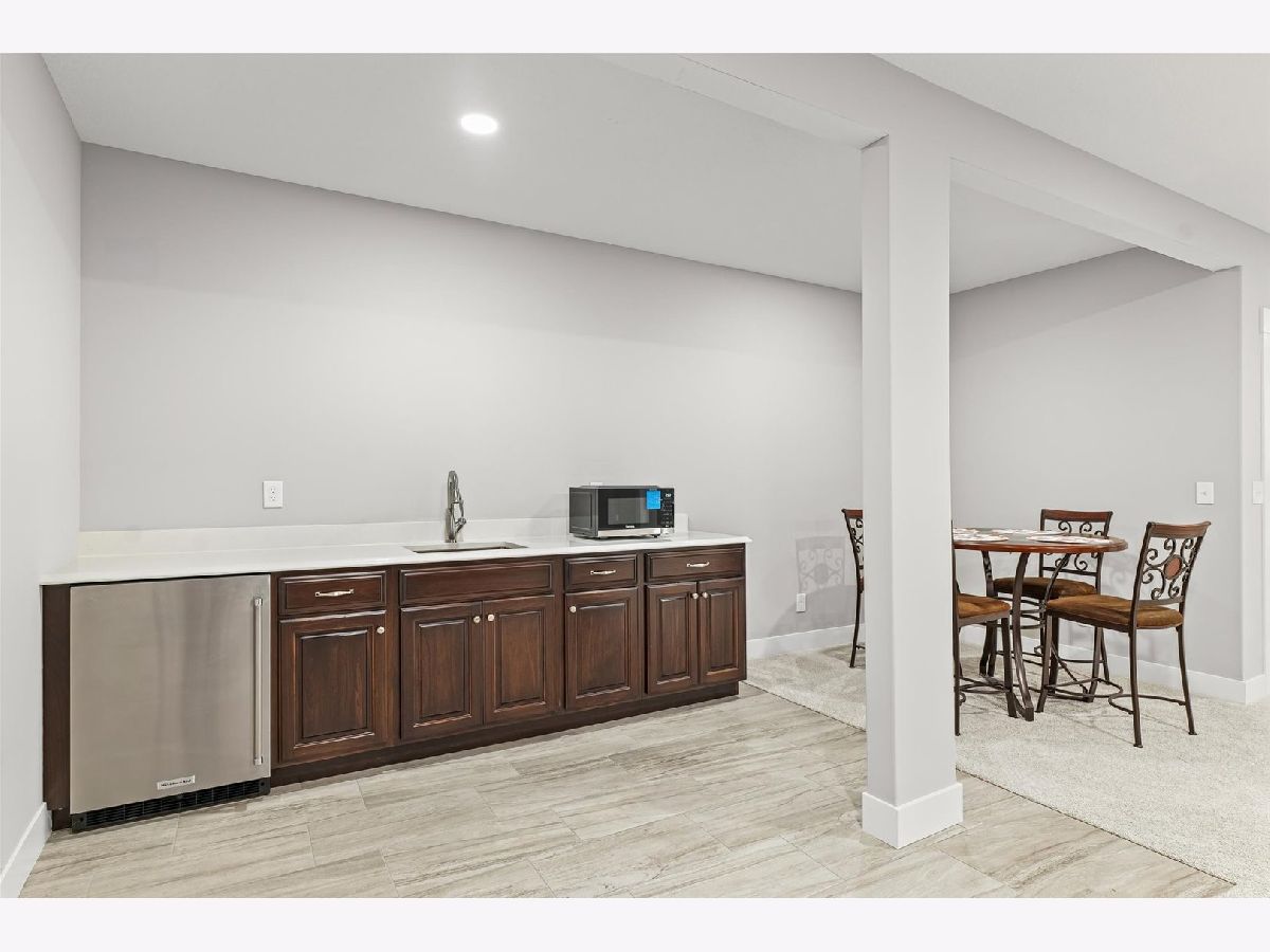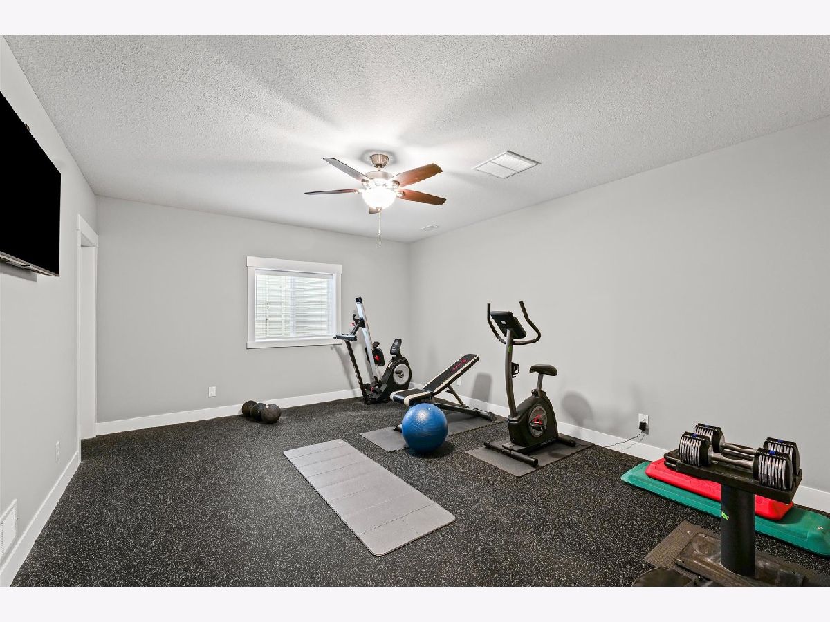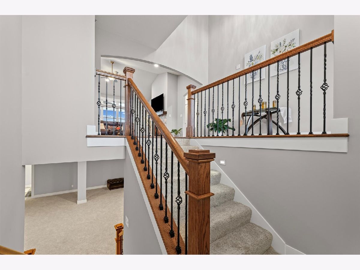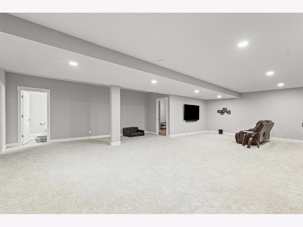 Enjoy this nearly new 4-bedroom, 3-full bath ranch in the highly sought-after Trails at Abbey Fields subdivision. A welcoming two-story entry leads you into the perfect space for gathering and entertaining. Hardwood flooring flows throughout the main living areas, while the living room impresses with cathedral ceilings, a cozy fireplace, and transom windows that flood the space with natural light. The eat-in kitchen features a functional island, custom cabinetry, tile backsplash, walk-in pantry, and plenty of room for everyday living or hosting. Sliding doors off the kitchen lead to the covered patio and feature remote-controlled blinds, as do several windows throughout the living room and entry. You'll love the split-bedroom floor plan, offering privacy and comfort. The primary suite showcases a lighted tray ceiling and an ensuite bath with double sinks, a tiled shower, and a spacious walk-in closet. A pocket door connects the closet directly to the laundry room, making everyday routines effortless. The laundry room includes a washer and dryer on pedestals, additional cabinetry, and a utility sink. The finished basement expands your living space with an office, fourth bedroom, full bathroom, a sprawling family/rec room, and a wet bar. It's also equipped with home-theater surround sound, creating an ideal space for movie nights or game days. Additional highlights include a designated drop zone off the three-car garage, plus a bump-out ideal for extra storage or a workshop. App-driven Sonos speakers are installed on the patio and in the garage, as well as through the living room TV speaker system, making it easy to enjoy music or entertainment throughout the home. Dual zone HVAC adds comfort and efficiency year-round. Outside, enjoy a fully fenced backyard, a large covered patio, a dedicated hot tub area, and additional space for grilling with a built-in gas line. This custom home is packed with upgrades and is truly move-in ready for its next owner.