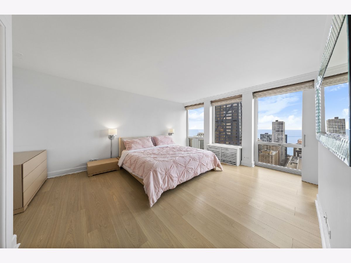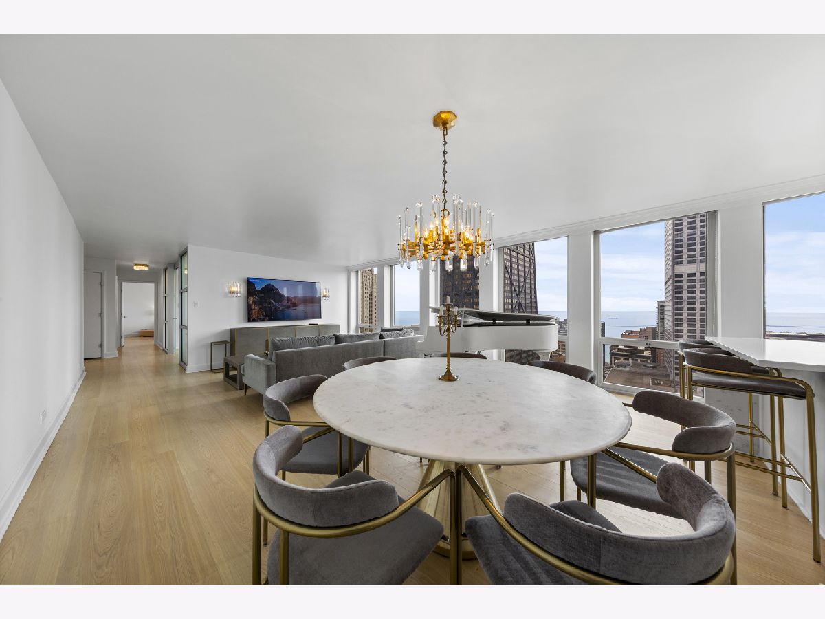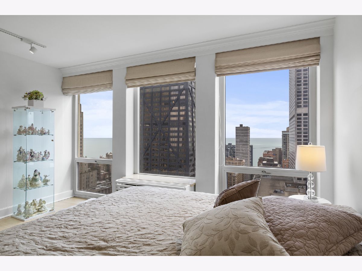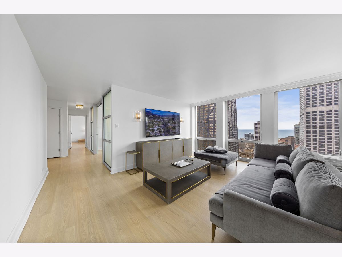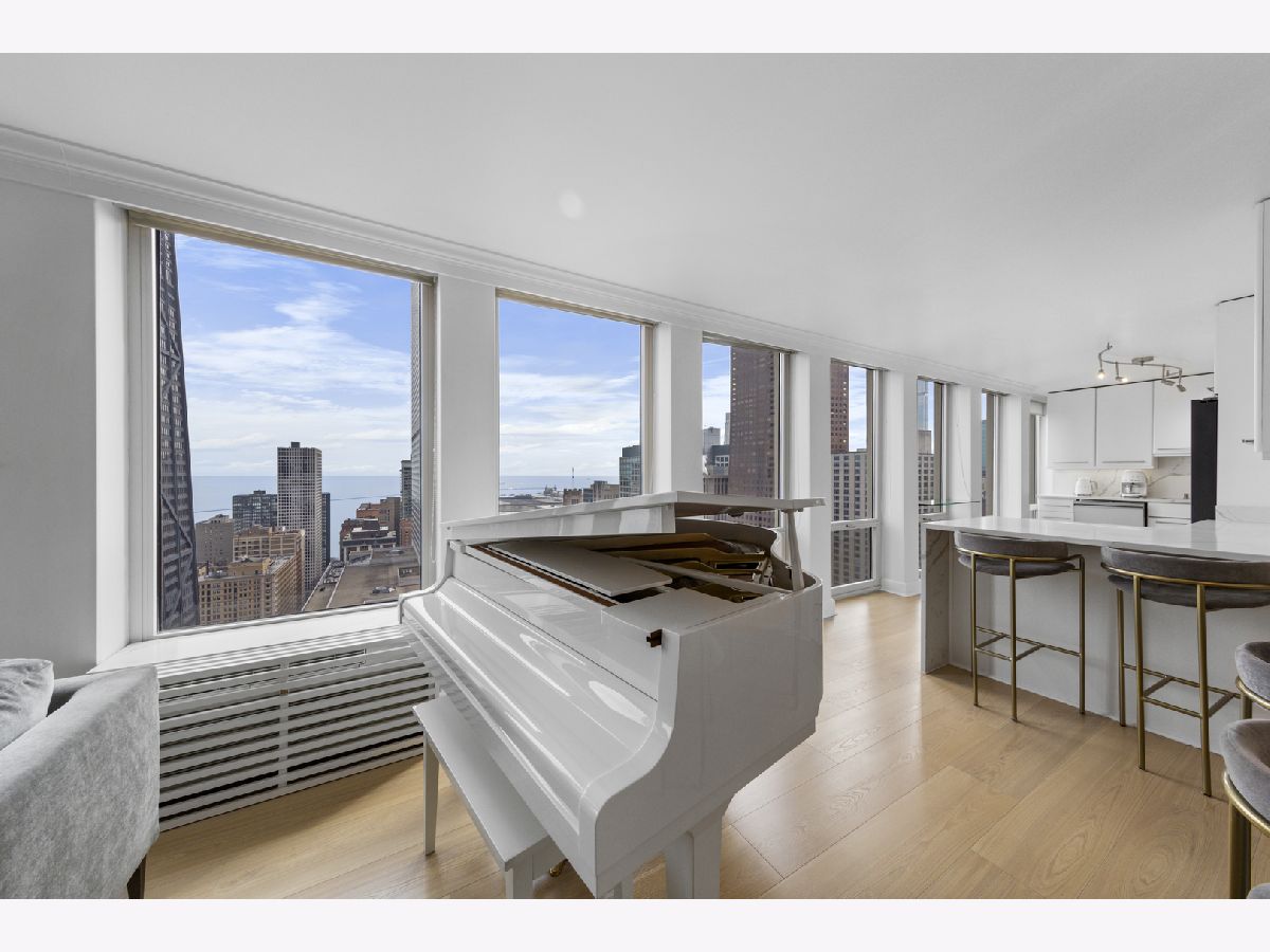 Step into this beautifully updated, move-in ready 2-bedroom, 2-bath unit offering breathtaking city and lake views! This contemporary home features an abundance of natural light, light hardwood floors, freshly painted white walls, and a pristine white kitchen with sleek new stainless steel appliances. One of the few updated units in the building, this home boasts a neutral decor, in-unit washer and dryer, and is ready for immediate occupancy. The open-concept kitchen with breakfast bar seating flows seamlessly into a spacious living/dining area with floor-to-ceiling windows, showcasing expansive views of the city and Lake Michigan from the 38th floor. Enjoy sweeping vistas from Navy Pier to Oak Street Beach! The primary suite is generously sized and includes a walk-in closet (4'10" x 11'6") with built-in shelving. The en-suite bathroom features marble finishes, a built-in medicine cabinet, a walk-in shower, a large vanity, and an additional dressing vanity with a mirror. The versatile second bedroom is highlighted by custom frosted glass sliding doors, allowing you to use the space as an office, media room, or guest room. The updated hall bath offers marble details, a large vanity, and a soaking tub/shower combo. Throughout the home, you'll find custom window treatments, lightly used hardwood flooring (just 2 years old), and new carpeting in the primary bedroom. This exceptional "C" floor plan has been thoughtfully redesigned, with an open kitchen, expanded bathrooms, a custom walk-in closet in the primary suite, and a beautifully reconfigured second bedroom with frosted glass panels and sliding doors. A gently lived-in second home, this unit is vacant and easy to show. The building offers a full range of amenities, including door staff, an exercise room, a party room, an outdoor pool, sun deck, grill, dry cleaners, laundry facilities, and is pet-friendly. This is a truly special unit that provides an ideal space for modern living!