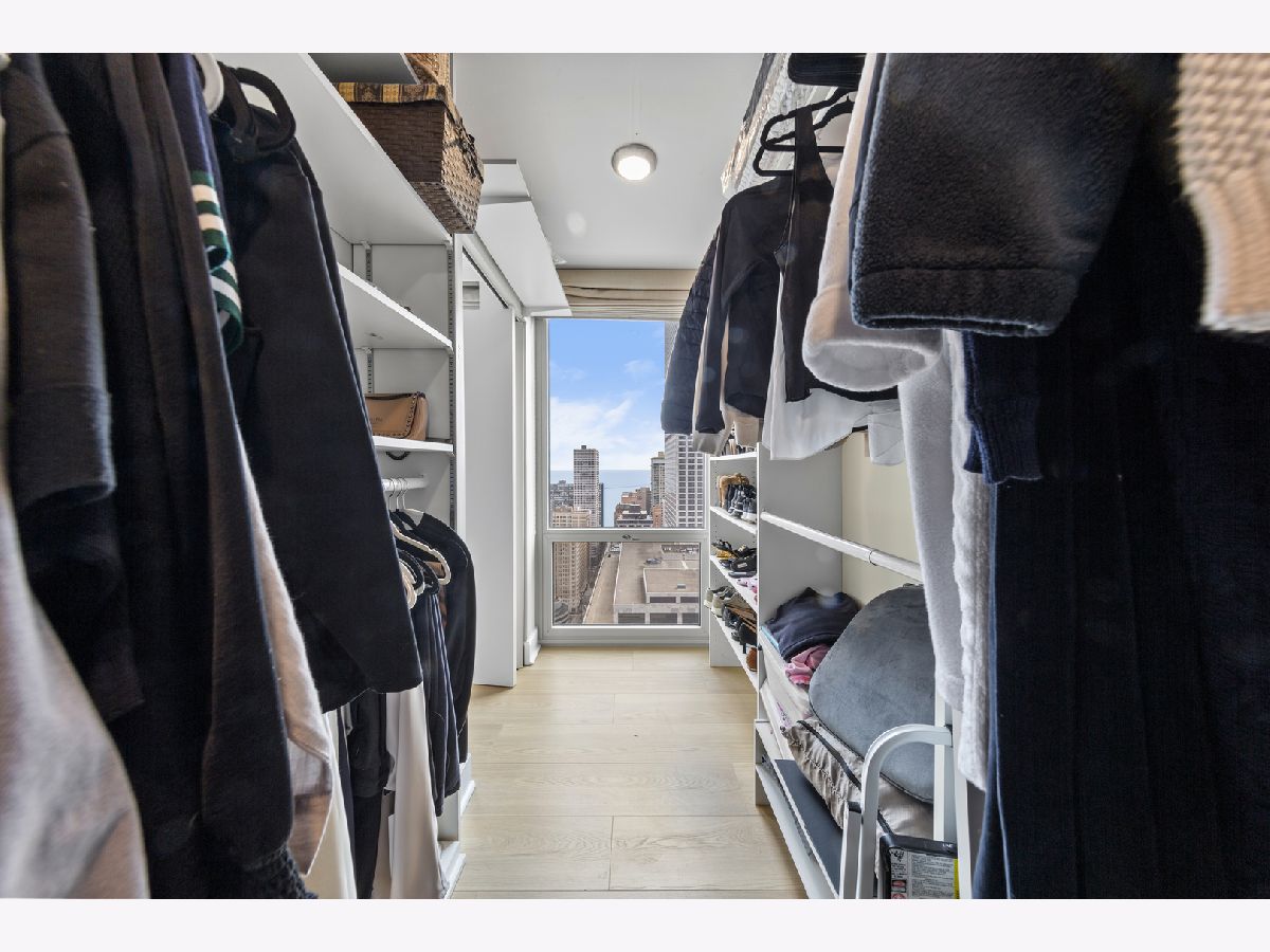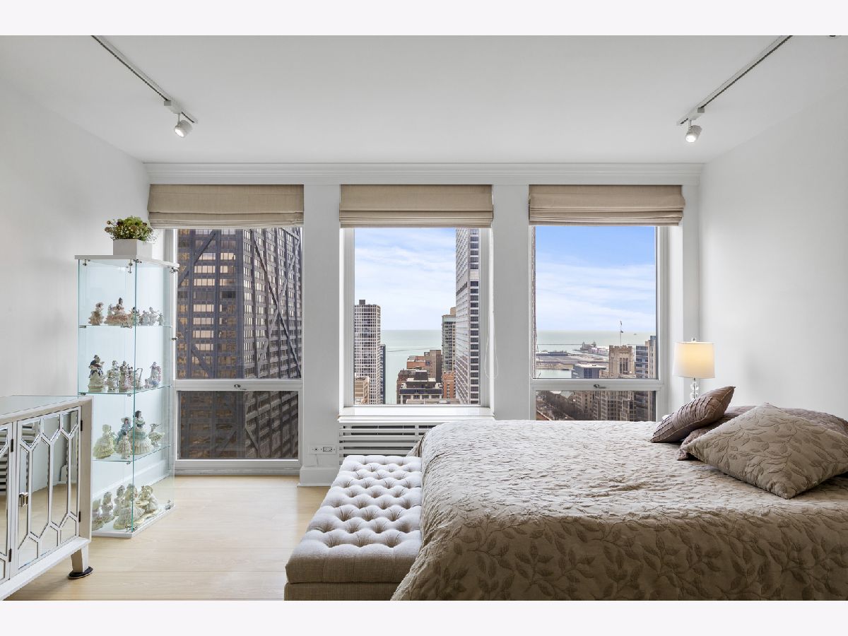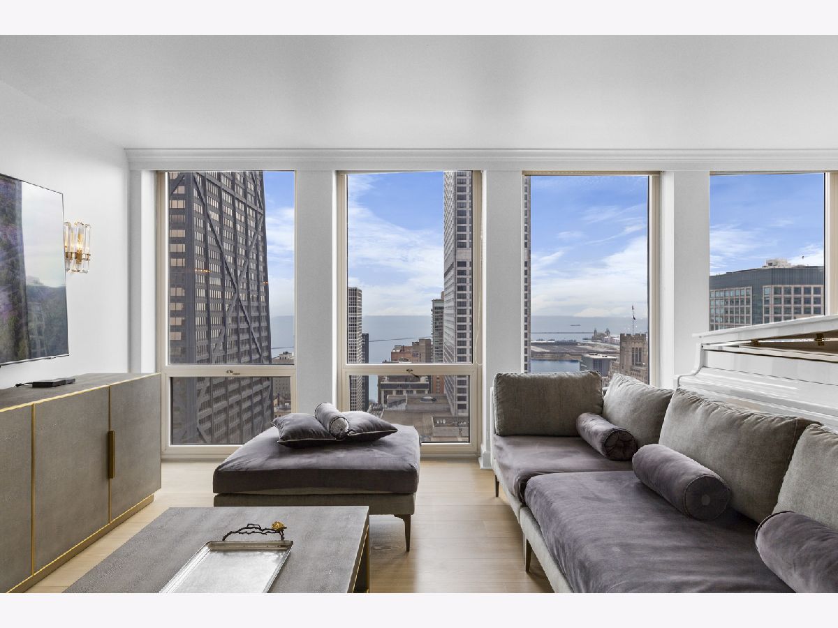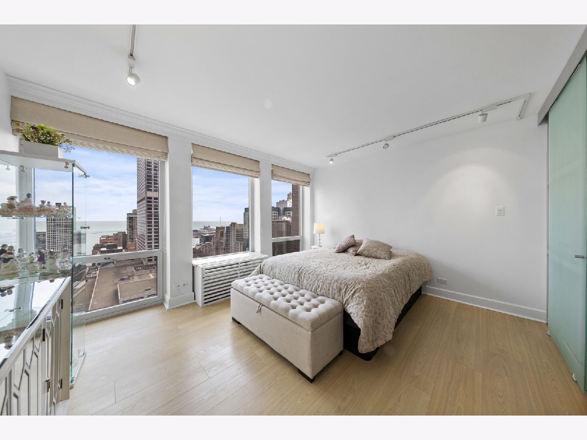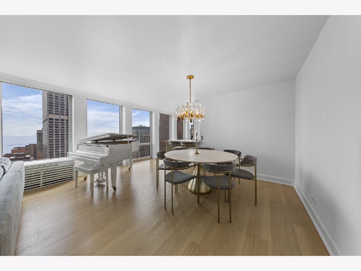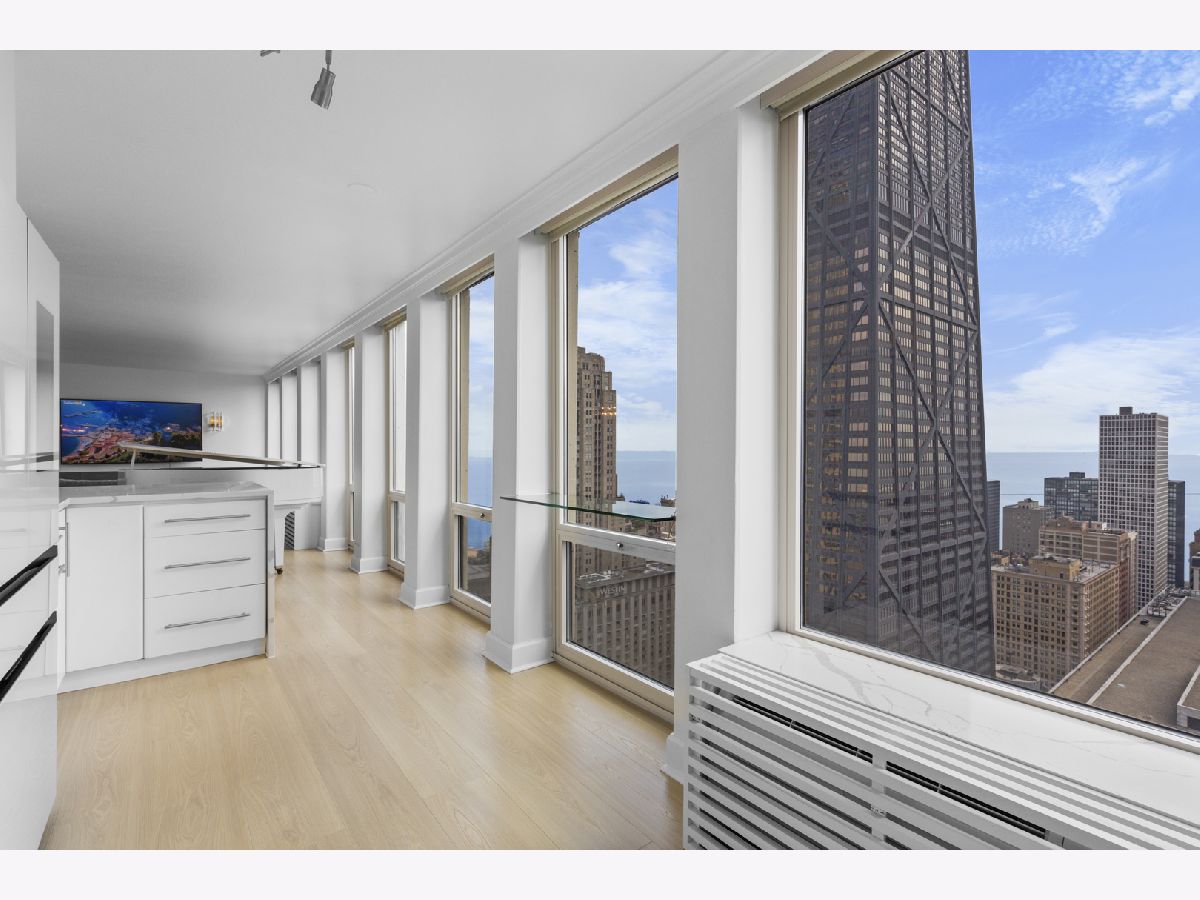 Step into this beautifully updated, move-in ready 2-bedroom, 2-bath unit offering breathtaking city and lake views! This contemporary home features an abundance of natural light, light hardwood floors, freshly painted white walls, and a pristine white kitchen with sleek new stainless steel appliances. One of the few updated units in the building, this home boasts a neutral decor, in-unit washer and dryer, and is ready for immediate occupancy. The open-concept kitchen with breakfast bar seating flows seamlessly into a spacious living/dining area with floor-to-ceiling windows, showcasing expansive views of the city and Lake Michigan from the 38th floor. Enjoy sweeping vistas from Navy Pier to Oak Street Beach! The primary suite is generously sized and includes a walk-in closet (4'10" x 11'6") with built-in shelving. The en-suite bathroom features marble finishes, a built-in medicine cabinet, a walk-in shower, a large vanity, and an additional dressing vanity with a mirror. The versatile second bedroom is highlighted by custom frosted glass sliding doors, allowing you to use the space as an office, media room, or guest room. The updated hall bath offers marble details, a large vanity, and a soaking tub/shower combo. Throughout the home, you'll find custom window treatments, lightly used hardwood flooring (just 2 years old), and new carpeting in the primary bedroom. This exceptional "C" floor plan has been thoughtfully redesigned, with an open kitchen, expanded bathrooms, a custom walk-in closet in the primary suite, and a beautifully reconfigured second bedroom with frosted glass panels and sliding doors. A gently lived-in second home, this unit is vacant and easy to show. The building offers a full range of amenities, including door staff, an exercise room, a party room, an outdoor pool, sun deck, grill, dry cleaners, laundry facilities, and is pet-friendly. This is a truly special unit that provides an ideal space for modern living!