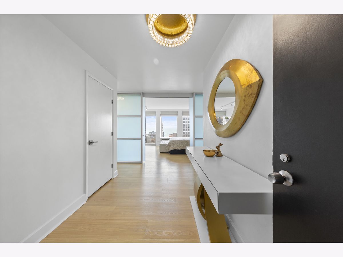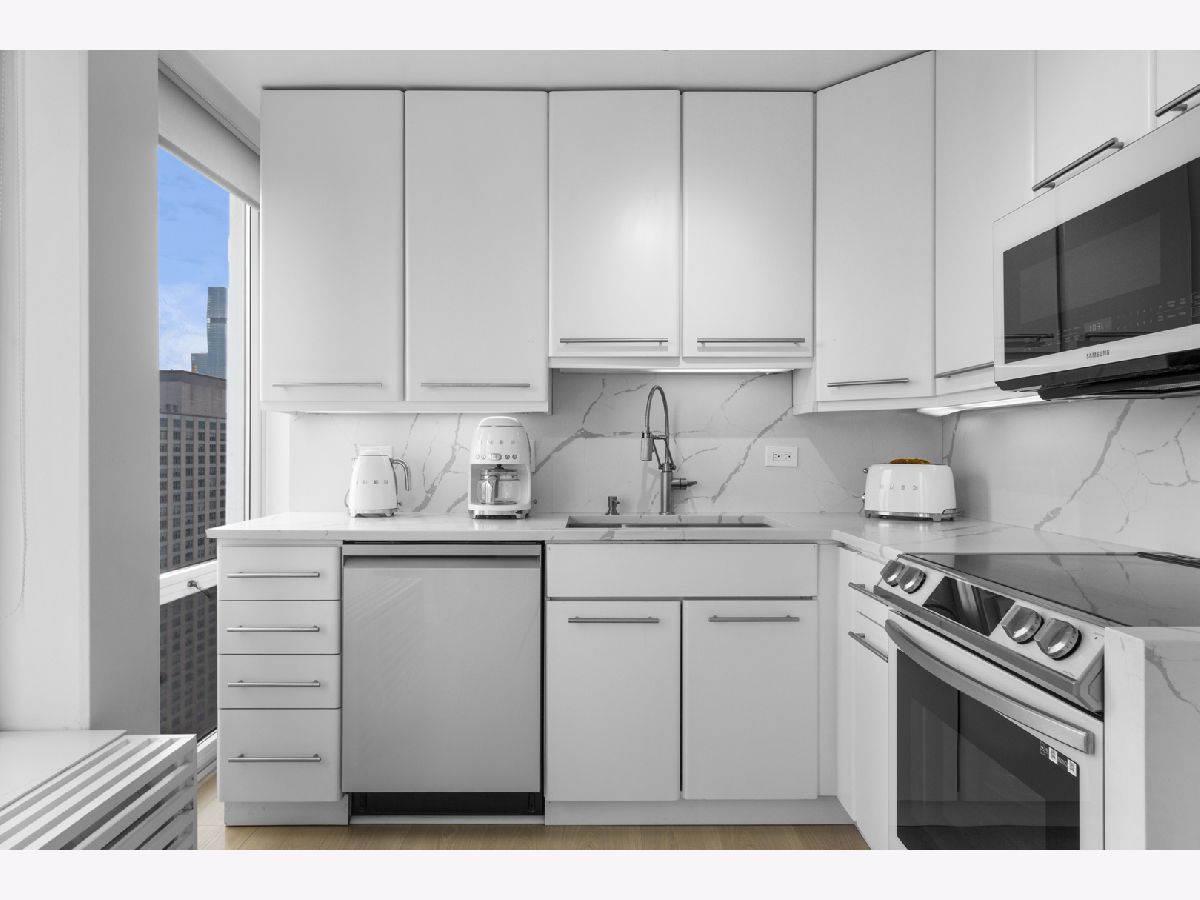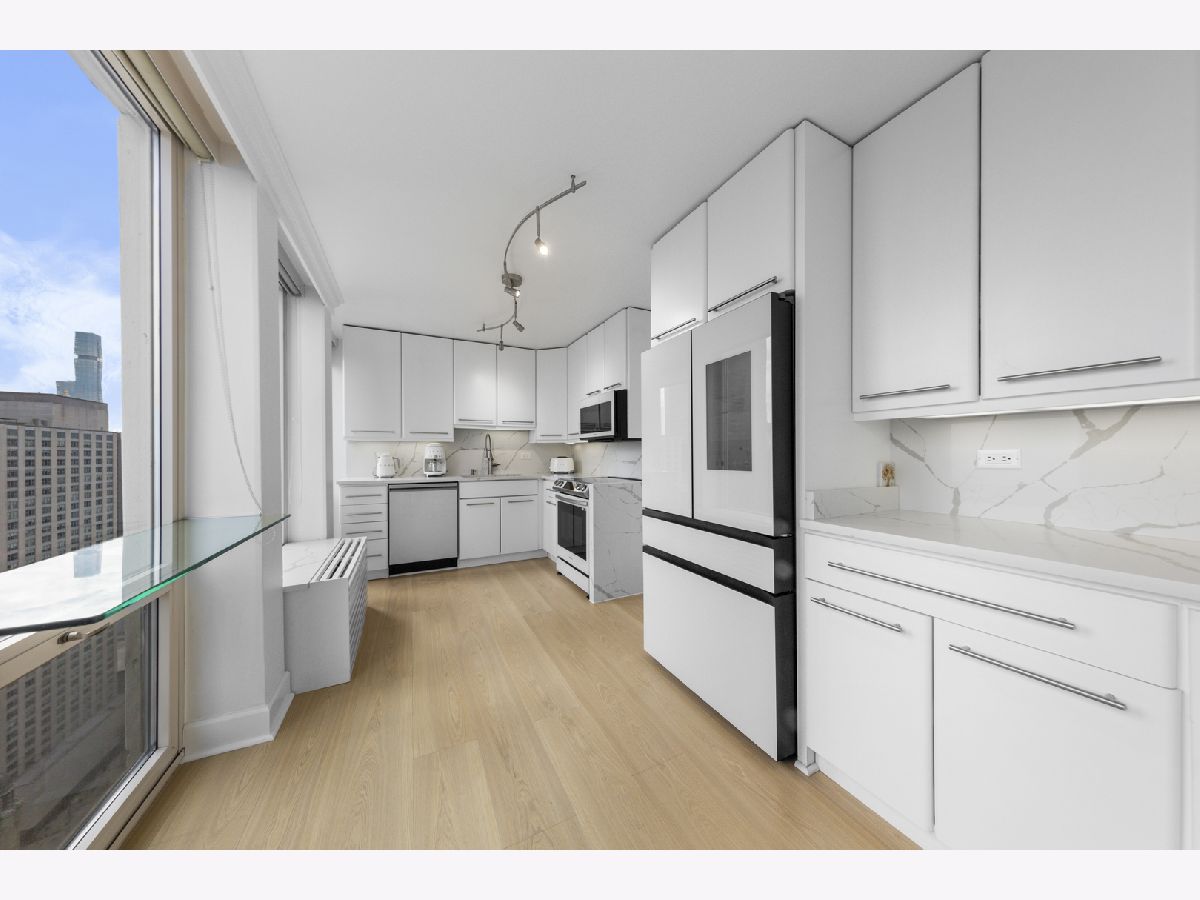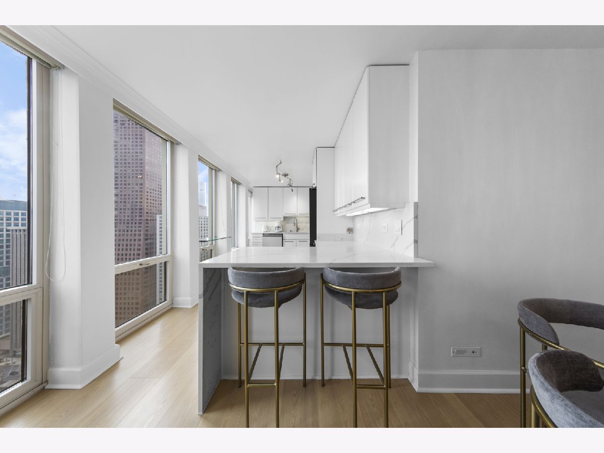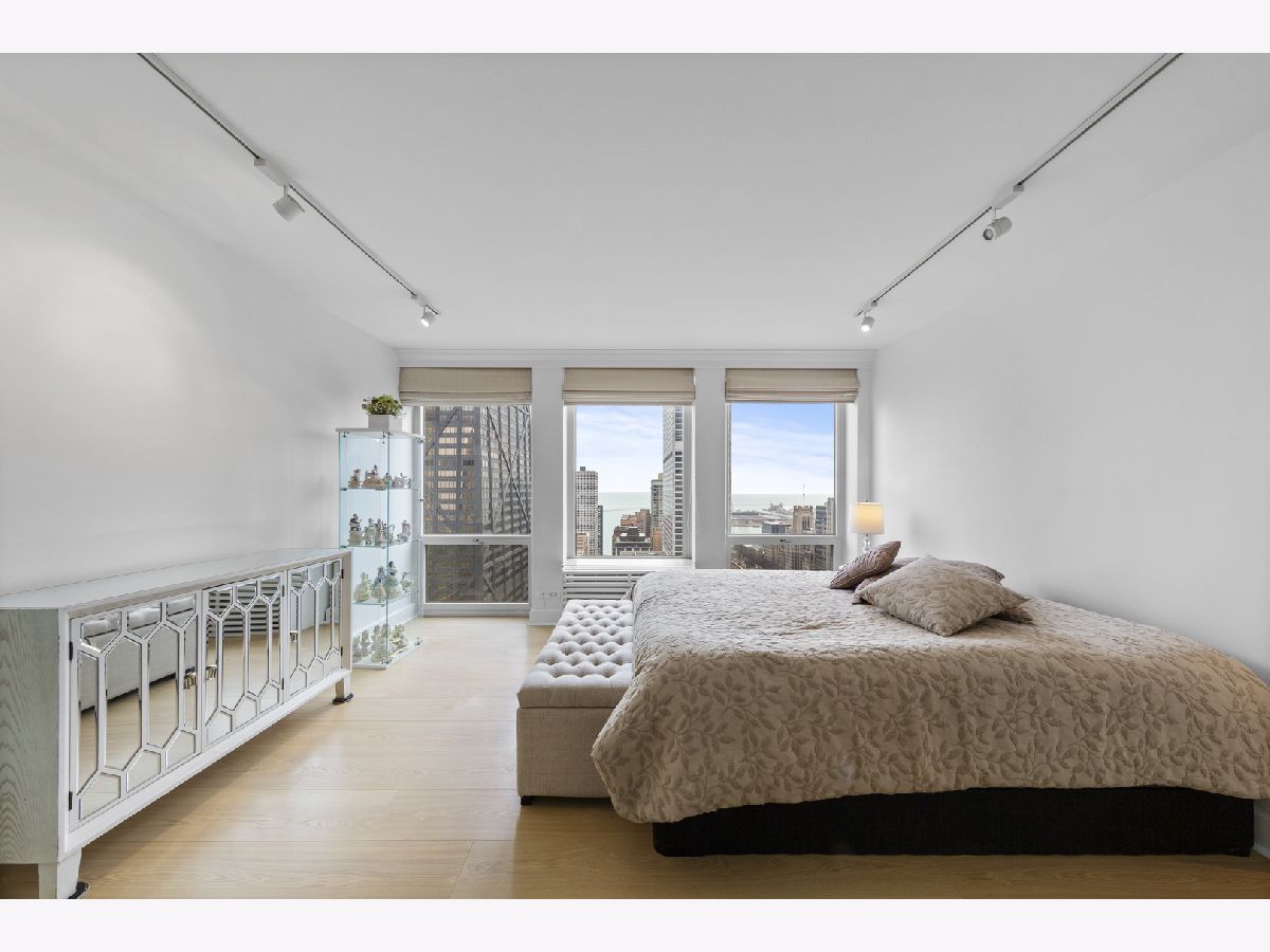 Step into this beautifully updated, move-in ready 2-bedroom, 2-bath unit offering breathtaking city and lake views! This contemporary home features an abundance of natural light, light hardwood floors, freshly painted white walls, and a pristine white kitchen with sleek new stainless steel appliances. One of the few updated units in the building, this home boasts a neutral decor, in-unit washer and dryer, and is ready for immediate occupancy. The open-concept kitchen with breakfast bar seating flows seamlessly into a spacious living/dining area with floor-to-ceiling windows, showcasing expansive views of the city and Lake Michigan from the 38th floor. Enjoy sweeping vistas from Navy Pier to Oak Street Beach! The primary suite is generously sized and includes a walk-in closet (4'10" x 11'6") with built-in shelving. The en-suite bathroom features marble finishes, a built-in medicine cabinet, a walk-in shower, a large vanity, and an additional dressing vanity with a mirror. The versatile second bedroom is highlighted by custom frosted glass sliding doors, allowing you to use the space as an office, media room, or guest room. The updated hall bath offers marble details, a large vanity, and a soaking tub/shower combo. Throughout the home, you'll find custom window treatments, lightly used hardwood flooring (just 2 years old), and new carpeting in the primary bedroom. This exceptional "C" floor plan has been thoughtfully redesigned, with an open kitchen, expanded bathrooms, a custom walk-in closet in the primary suite, and a beautifully reconfigured second bedroom with frosted glass panels and sliding doors. A gently lived-in second home, this unit is vacant and easy to show. The building offers a full range of amenities, including door staff, an exercise room, a party room, an outdoor pool, sun deck, grill, dry cleaners, laundry facilities, and is pet-friendly. This is a truly special unit that provides an ideal space for modern living!