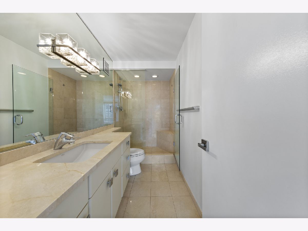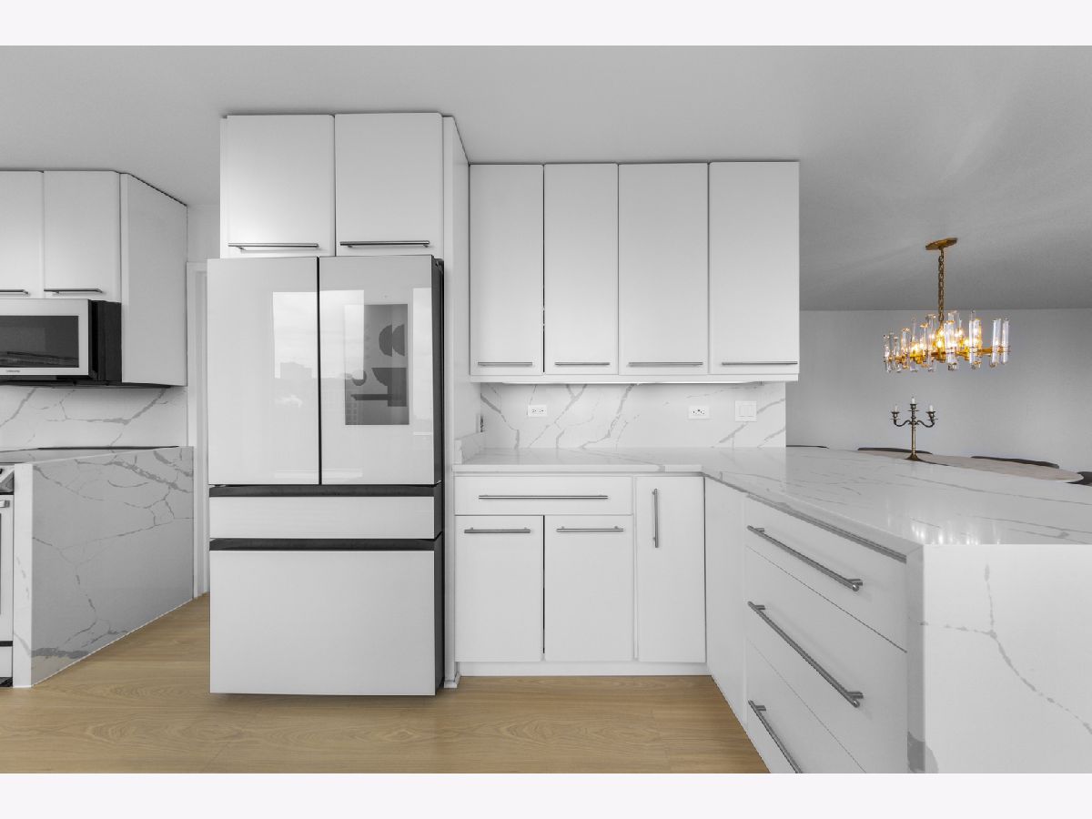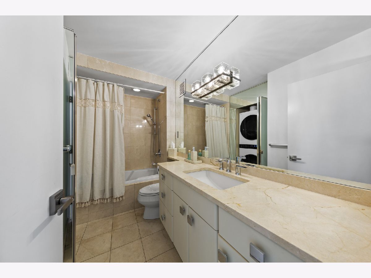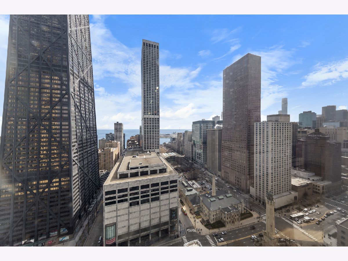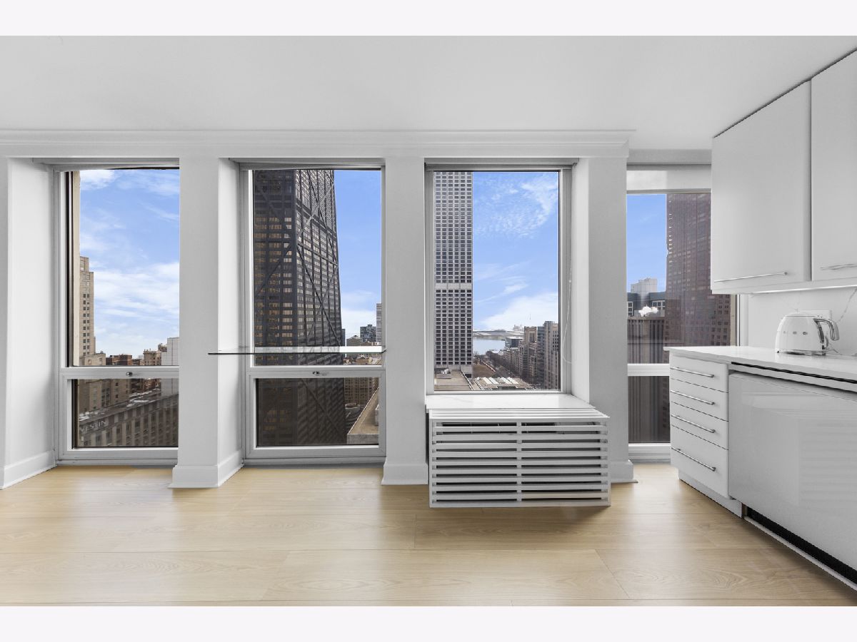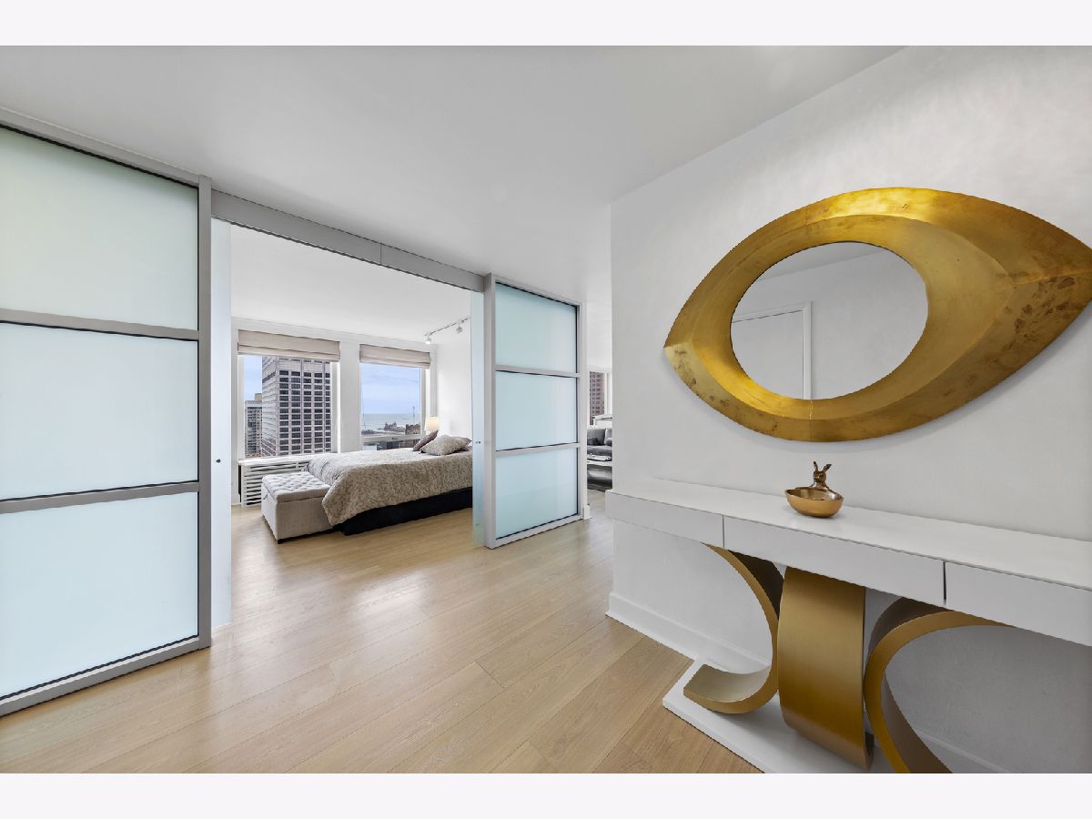Step into this beautifully updated, move-in ready 2-bedroom, 2-bath unit offering breathtaking city and lake views! This contemporary home features an abundance of natural light, light hardwood floors, freshly painted white walls, and a pristine white kitchen with sleek new stainless steel appliances. One of the few updated units in the building, this home boasts a neutral decor, in-unit washer and dryer, and is ready for immediate occupancy. The open-concept kitchen with breakfast bar seating flows seamlessly into a spacious living/dining area with floor-to-ceiling windows, showcasing expansive views of the city and Lake Michigan from the 38th floor. Enjoy sweeping vistas from Navy Pier to Oak Street Beach! The primary suite is generously sized and includes a walk-in closet (4'10" x 11'6") with built-in shelving. The en-suite bathroom features marble finishes, a built-in medicine cabinet, a walk-in shower, a large vanity, and an additional dressing vanity with a mirror. The versatile second bedroom is highlighted by custom frosted glass sliding doors, allowing you to use the space as an office, media room, or guest room. The updated hall bath offers marble details, a large vanity, and a soaking tub/shower combo. Throughout the home, you'll find custom window treatments, lightly used hardwood flooring (just 2 years old), and new carpeting in the primary bedroom. This exceptional "C" floor plan has been thoughtfully redesigned, with an open kitchen, expanded bathrooms, a custom walk-in closet in the primary suite, and a beautifully reconfigured second bedroom with frosted glass panels and sliding doors. A gently lived-in second home, this unit is vacant and easy to show. The building offers a full range of amenities, including door staff, an exercise room, a party room, an outdoor pool, sun deck, grill, dry cleaners, laundry facilities, and is pet-friendly. This is a truly special unit that provides an ideal space for modern living!