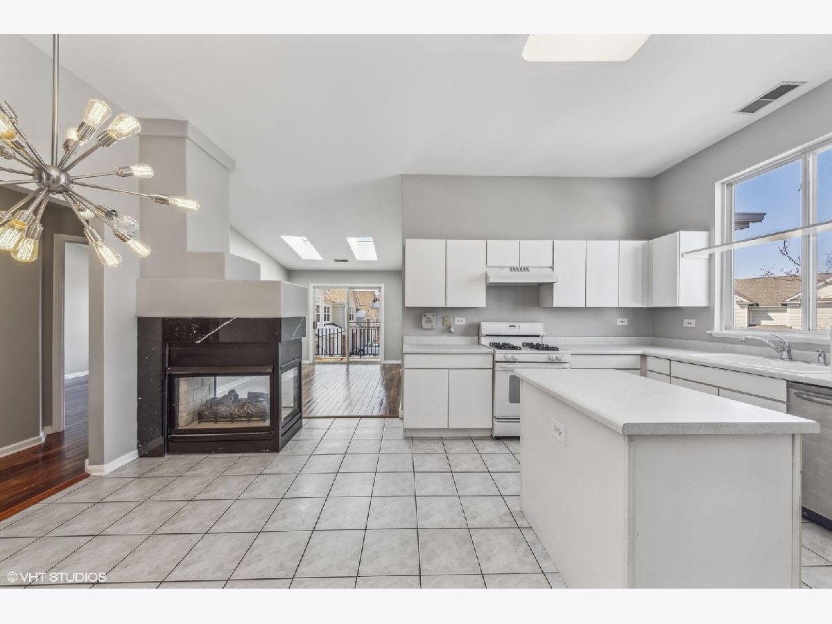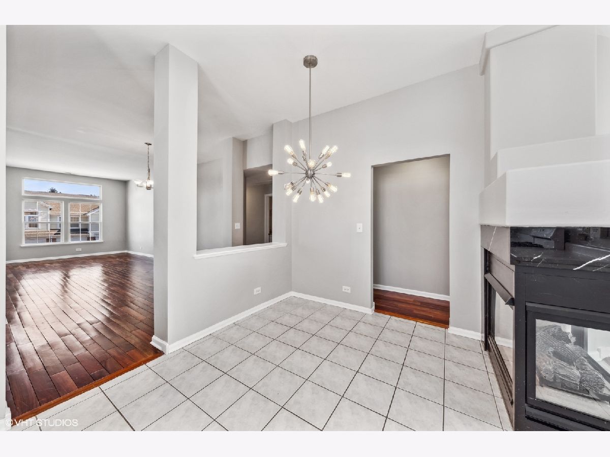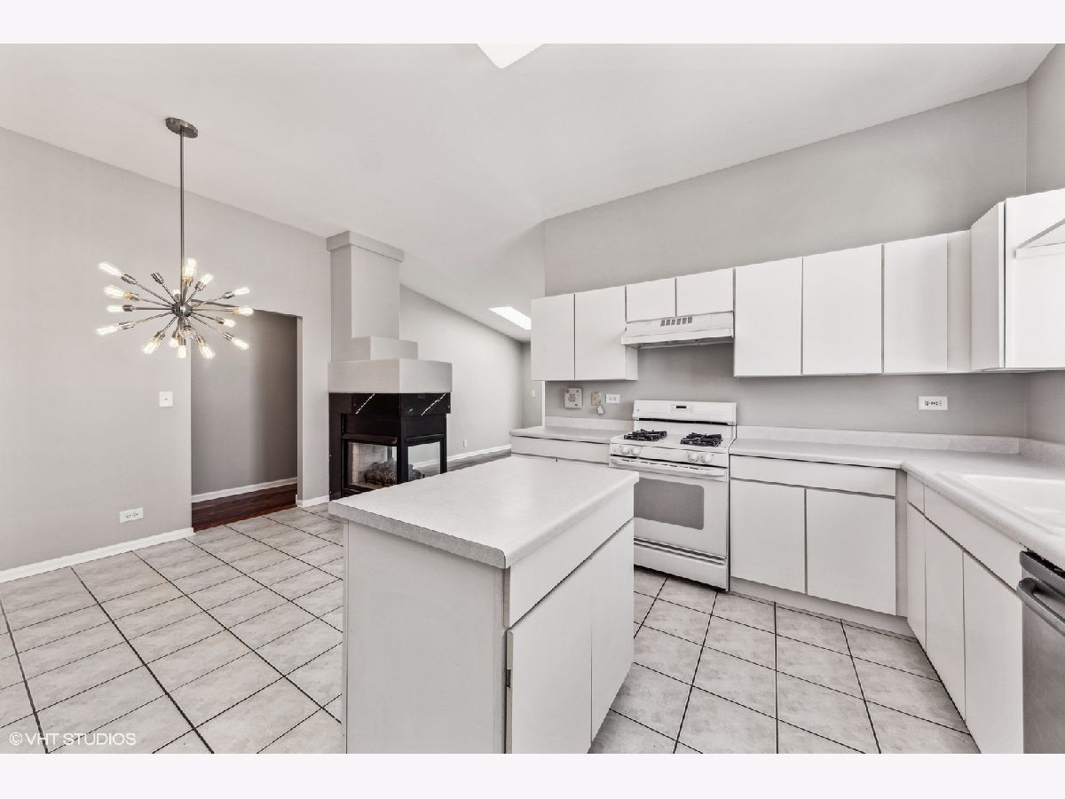 Light & bright 2-bedroom, 2-bath townhome with 10' ceilings throughout, open floor-plan, rich hardwood floors, 2 family room skylights, central fireplace and back balcony overlooking premium END-UNIT site. Ceramic tile entry, kitchen and eating area. Vaulted ceilings in Primary Bedroom with private bath and walk-in closet. Eat-in kitchen with walk-in pantry. All one-level living with attached garage so close to shopping, restaurants, nightlife, theaters, highways and O'Hare airport. Move-in ready and waiting for quick close, fresh decor and new home sweet home.