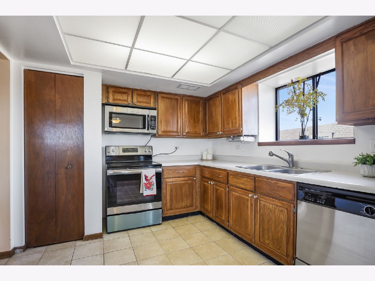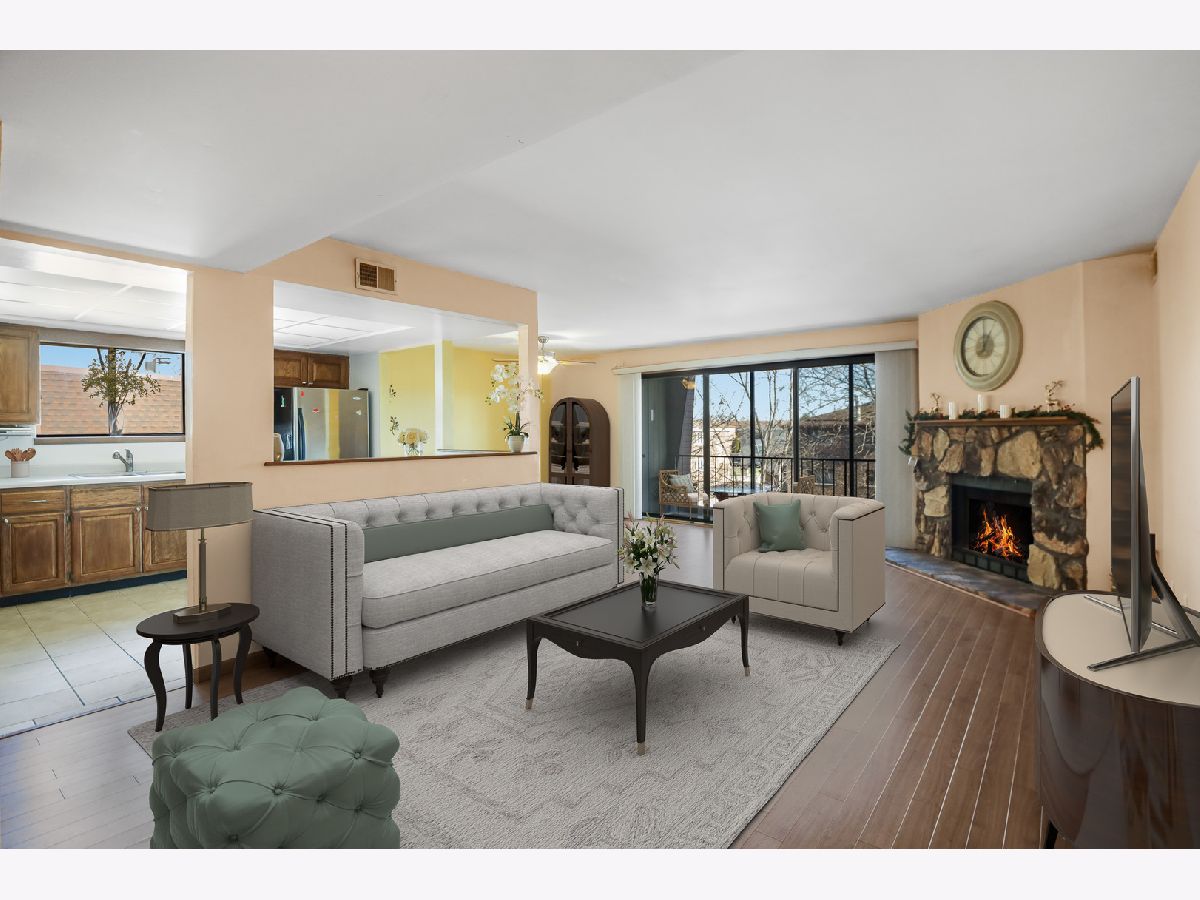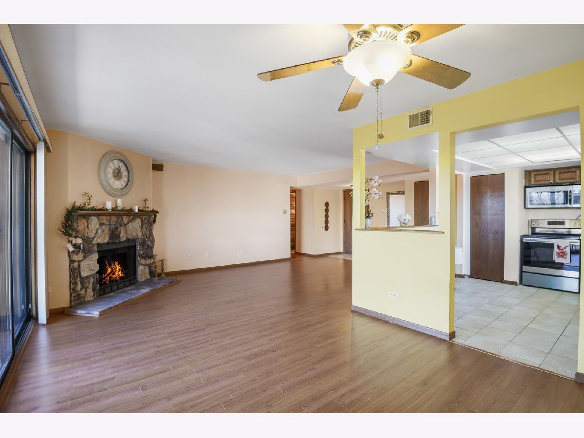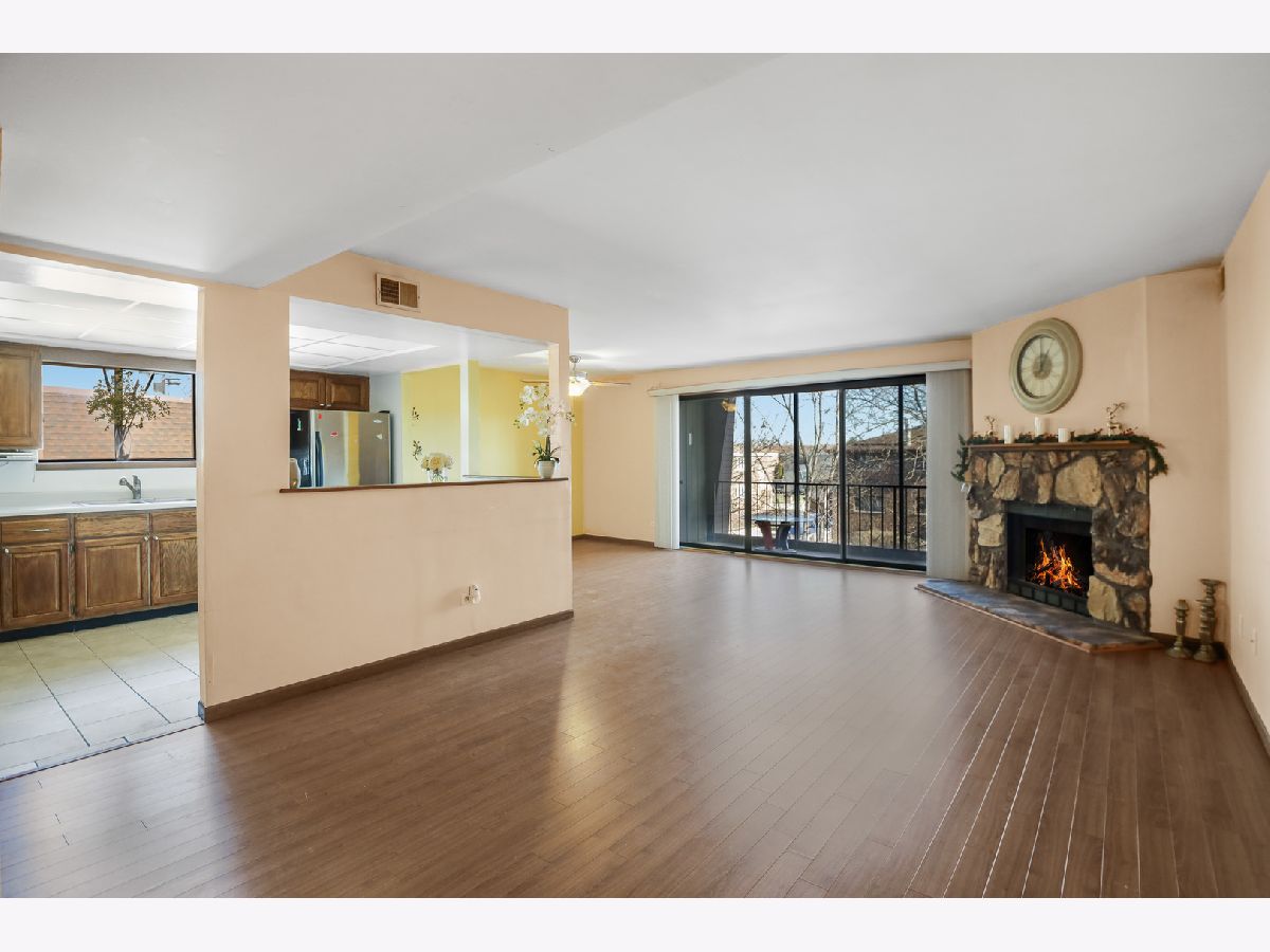 Rarely available third-floor ranch condo in the desirable Woods Edge community! This beautifully maintained 2-bedroom, 2-bath home with two garages offers the perfect combination of comfort, space, and convenience-and it won't last long. Step inside to a bright, open-concept layout featuring a spacious living and dining area anchored by a charming brick fireplace, creating a warm and inviting atmosphere. The large eat-in kitchen offers abundant cabinet and counter space, ideal for both everyday living and entertaining. The expansive primary suite is a true retreat, complete with a private en-suite bath and a generous walk-in closet. A second well-sized bedroom and full bath provide flexibility for guests, a home office, or additional living needs. Enjoy the convenience of in-unit, full-size laundry. Relax and unwind on the screened-in balcony, which also includes a private storage room-perfect for seasonal items. This home has been lovingly cared for and is truly move-in ready, waiting for its next chapter. Ideally located near major expressways, Moraine Valley Community College, and surrounded by beautiful forest preserves, walking trails, and nature, this home offers both accessibility and tranquility. A wonderful opportunity to enjoy easy, low-maintenance living in a sought-after location. Welcome home!