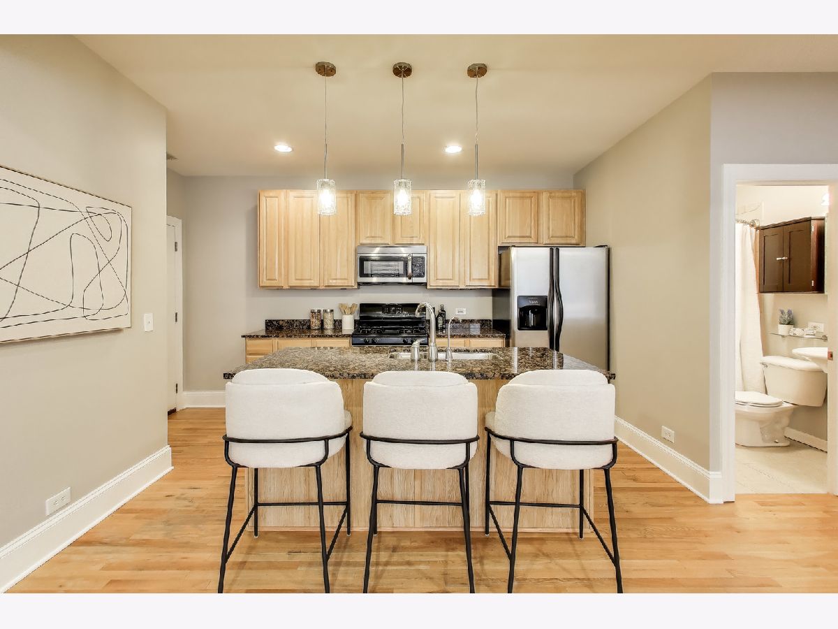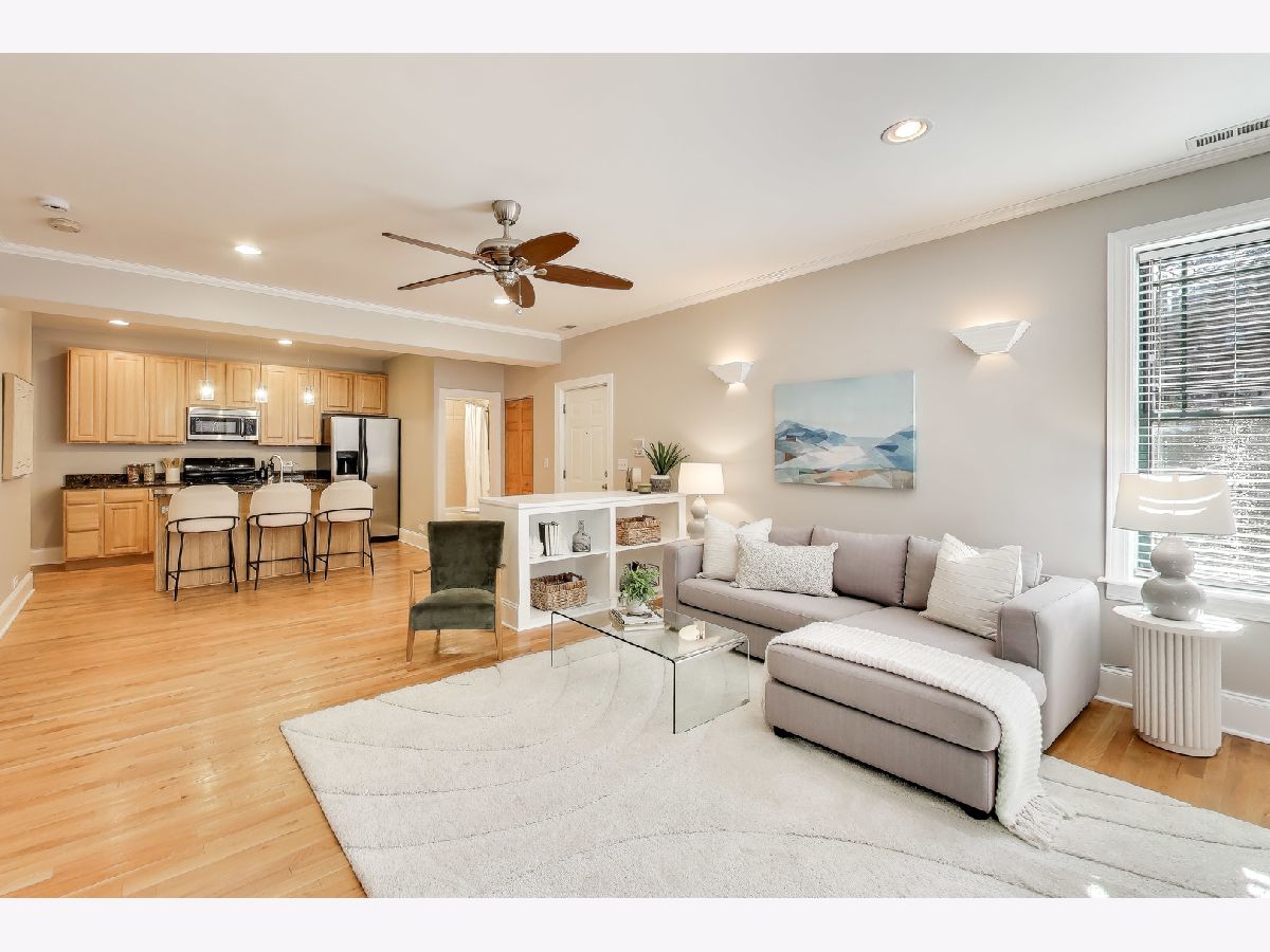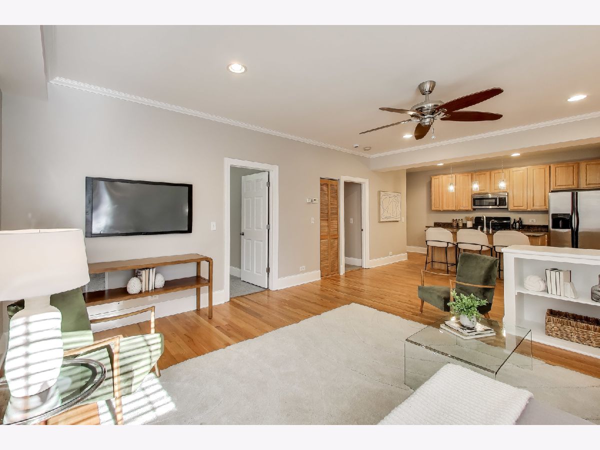 Bright and inviting 2 bed, 2 bath home offering a spacious layout, abundant natural light, and a private balcony in an unbeatable lakefront location. The spacious living room features oversized windows that fill the space with natural light and a flexible layout with room for a dining area or comfortable work from home setup, with hardwood floors throughout the main living areas. The large balcony overlooks a quiet residential setting and provides ample space for outdoor furniture, grilling, and entertaining. The open kitchen offers granite countertops, stainless steel appliances, generous cabinet and counter space, and a large island with room for counter seating and stools. Both bedrooms feature new carpet, ceiling fans, and generous closet space. The primary bedroom includes custom built in shelving, a large window for natural light, and an ensuite bathroom with a jetted tub and shower combination and in-unit laundry. The 2nd bedroom offers a flexible space ideal for a home office, guest room or nursery. A 2nd full bathroom and convenient coat closet are located just off the main living area. Freshly painted throughout and move-in ready, this home is located in a well maintained, self managed building on a quiet cul de sac at the end of the block. Steps from the beach where you can enjoy both sunrise and sunsets along the lakefront paths. Nearby dining, coffee shops, shopping including Target, the Red Line at Loyola and Morse, and Lake Shore Drive provide a convenient commute downtown or north.